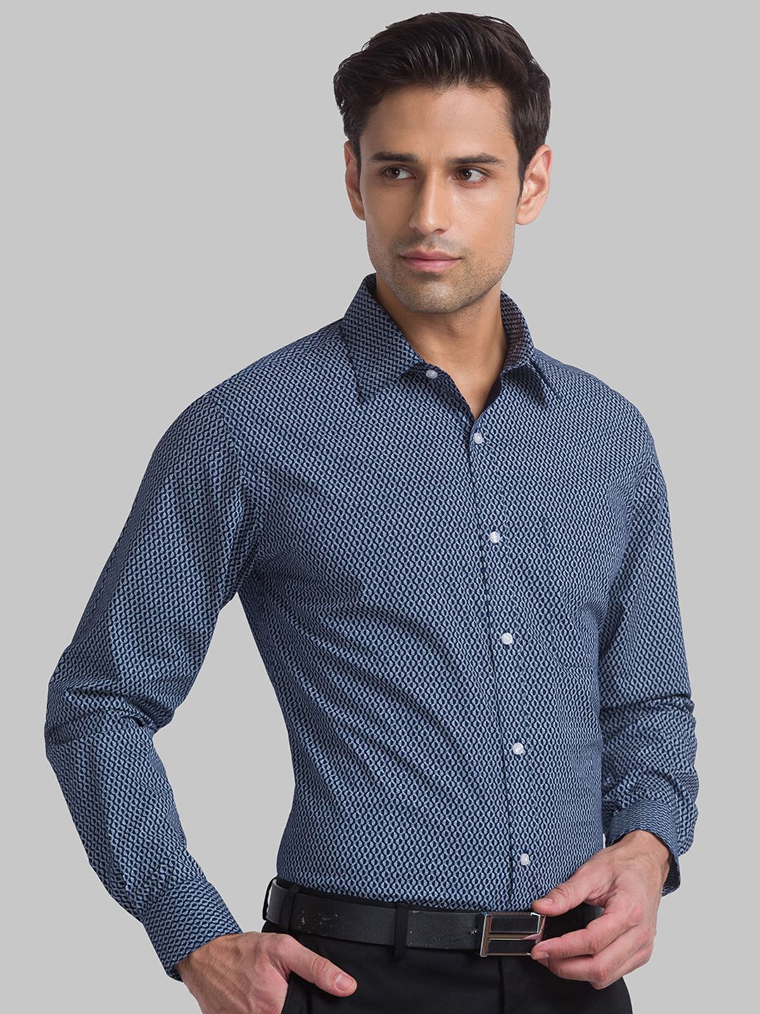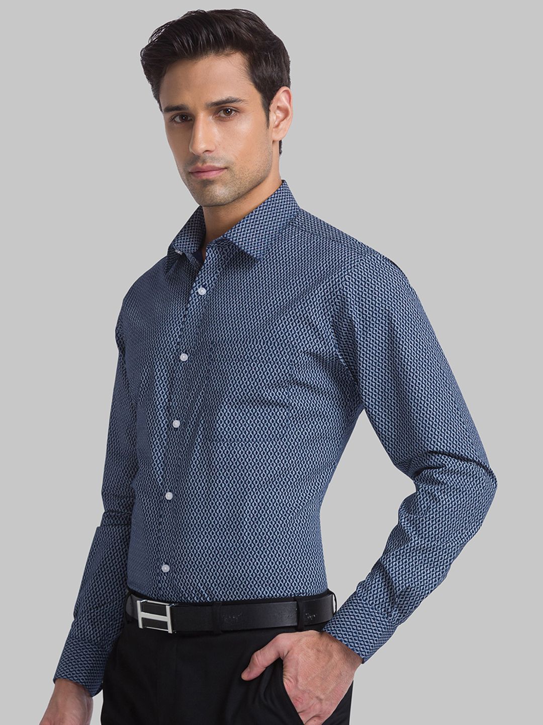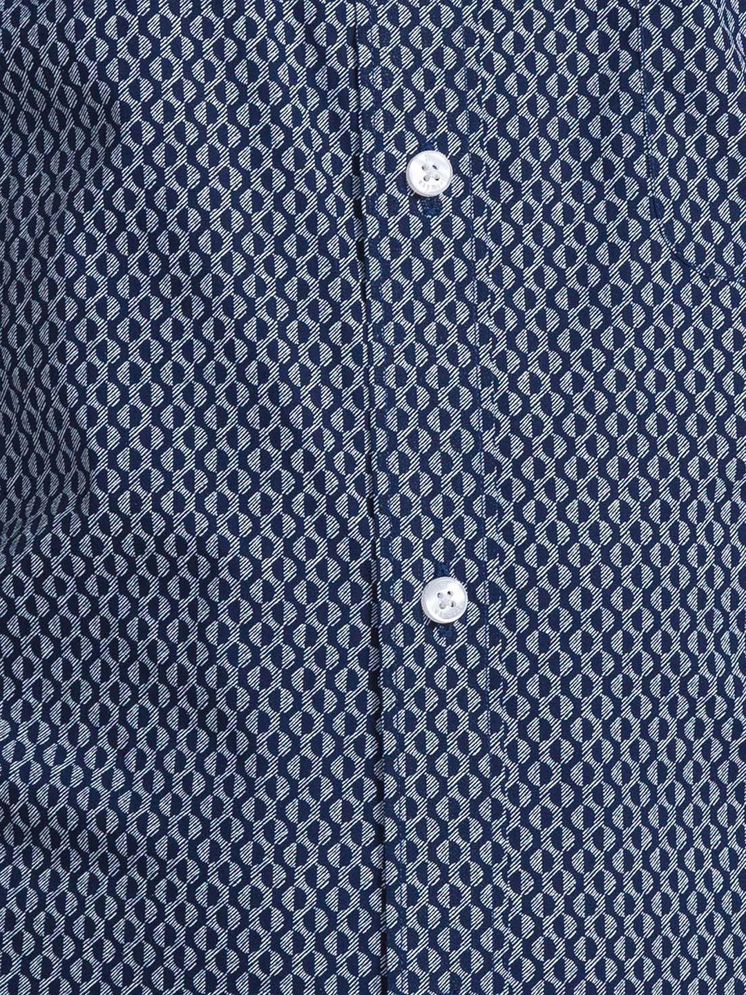 Blue printed slim-fit casual shirt ,has a cutaway collar, button placket, 1 patch pocket, long sleeves, curved hem