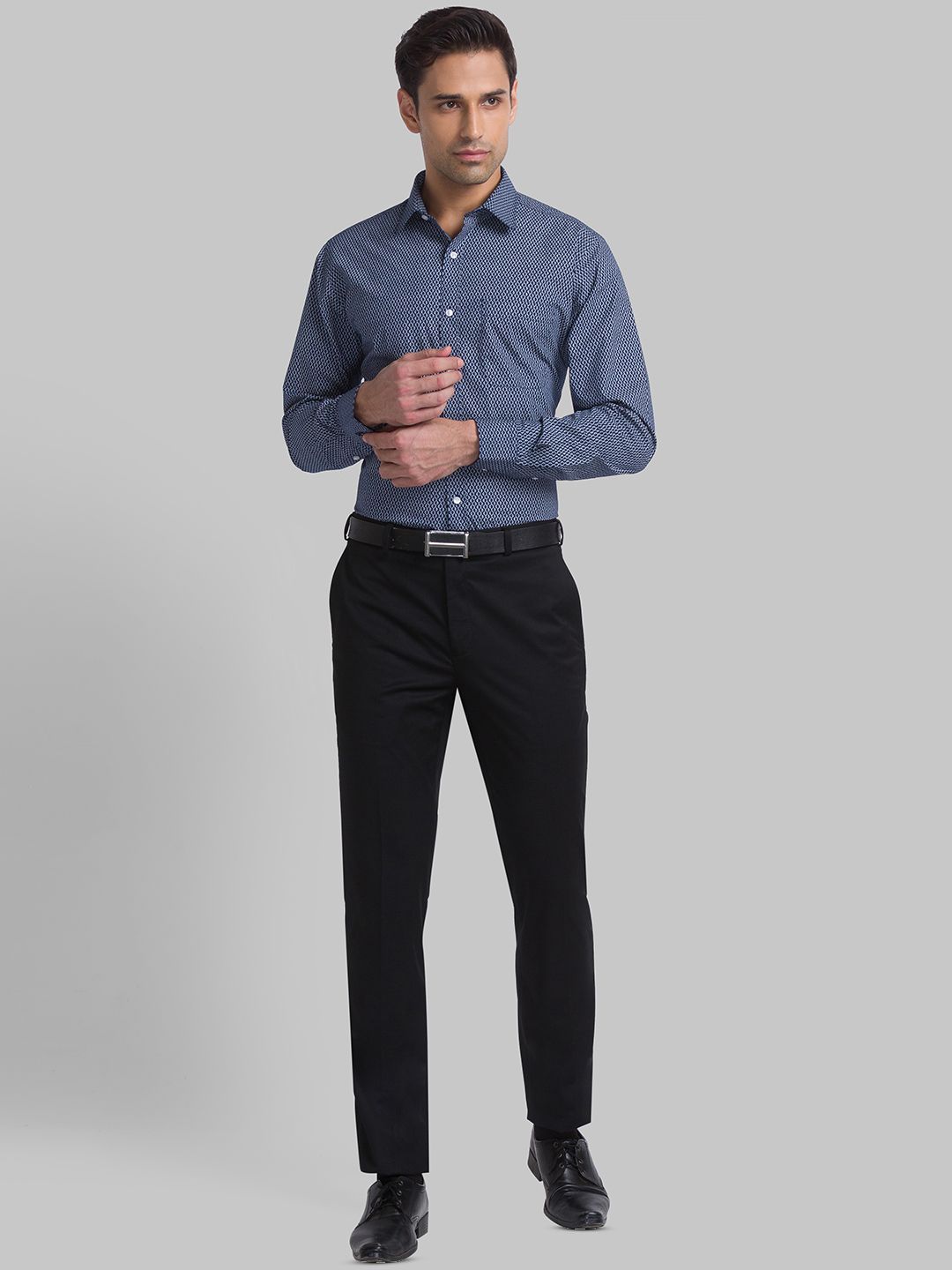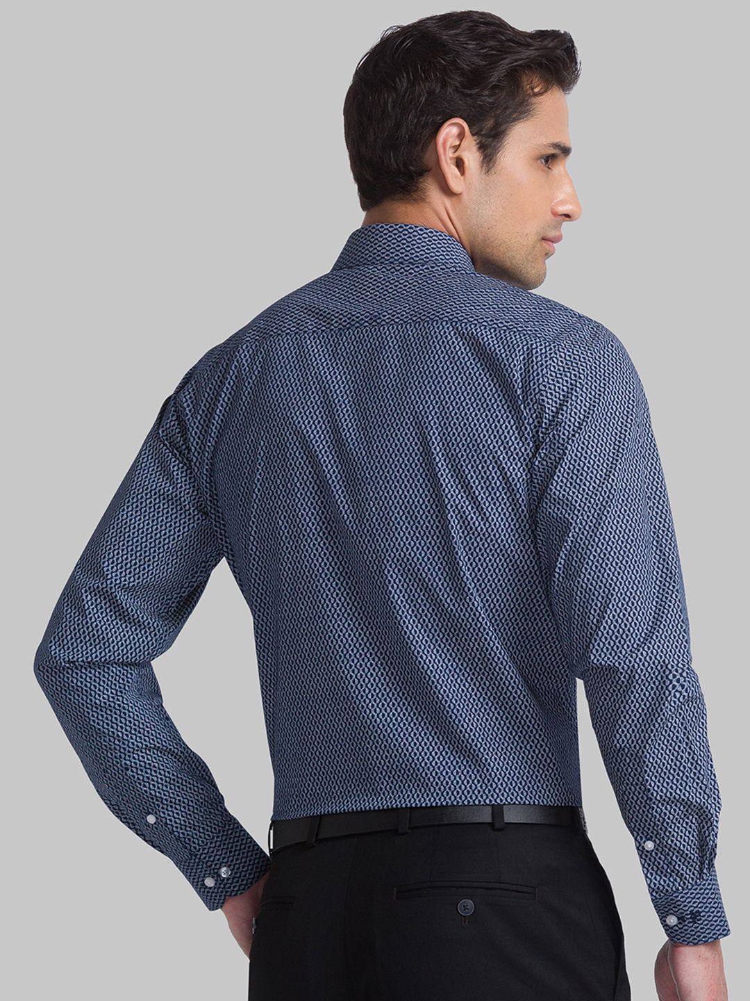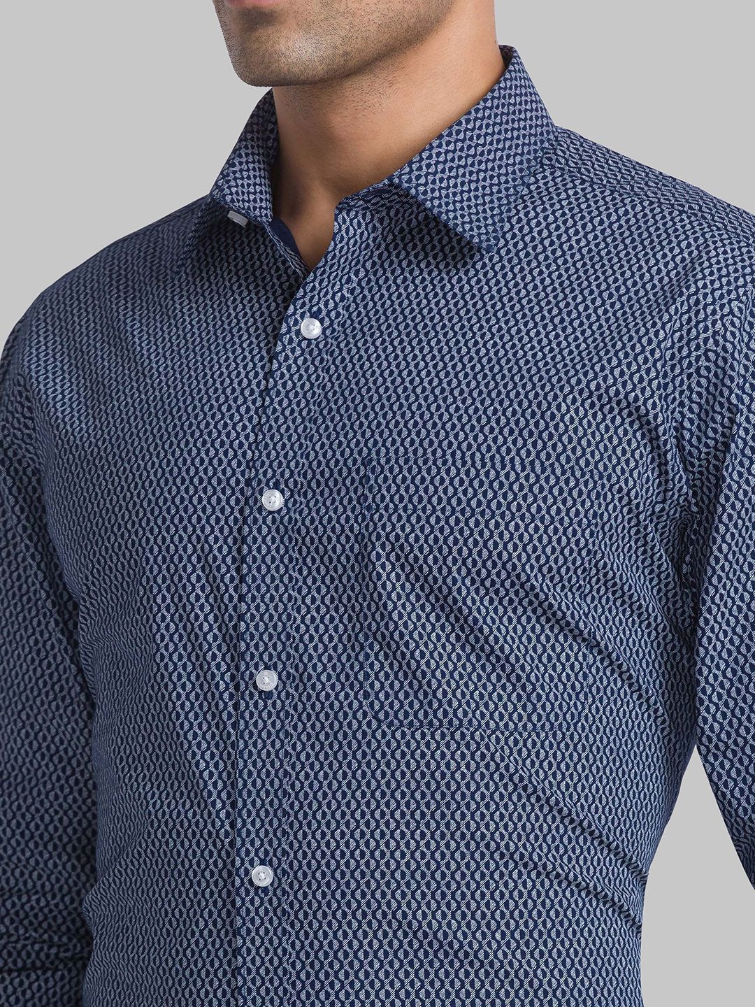 Blue printed slim-fit casual shirt ,has a cutaway collar, button placket, 1 patch pocket, long sleeves, curved hem