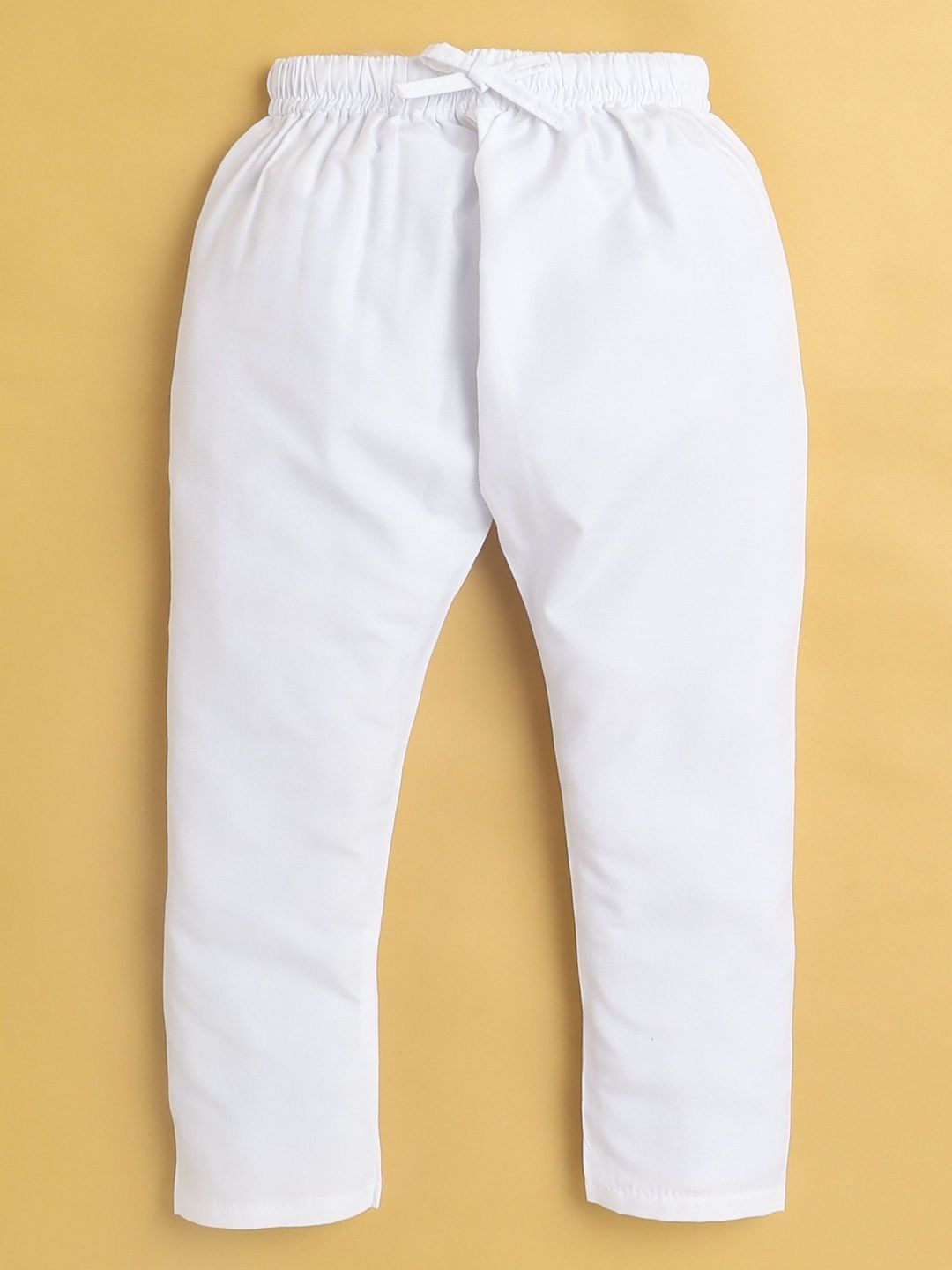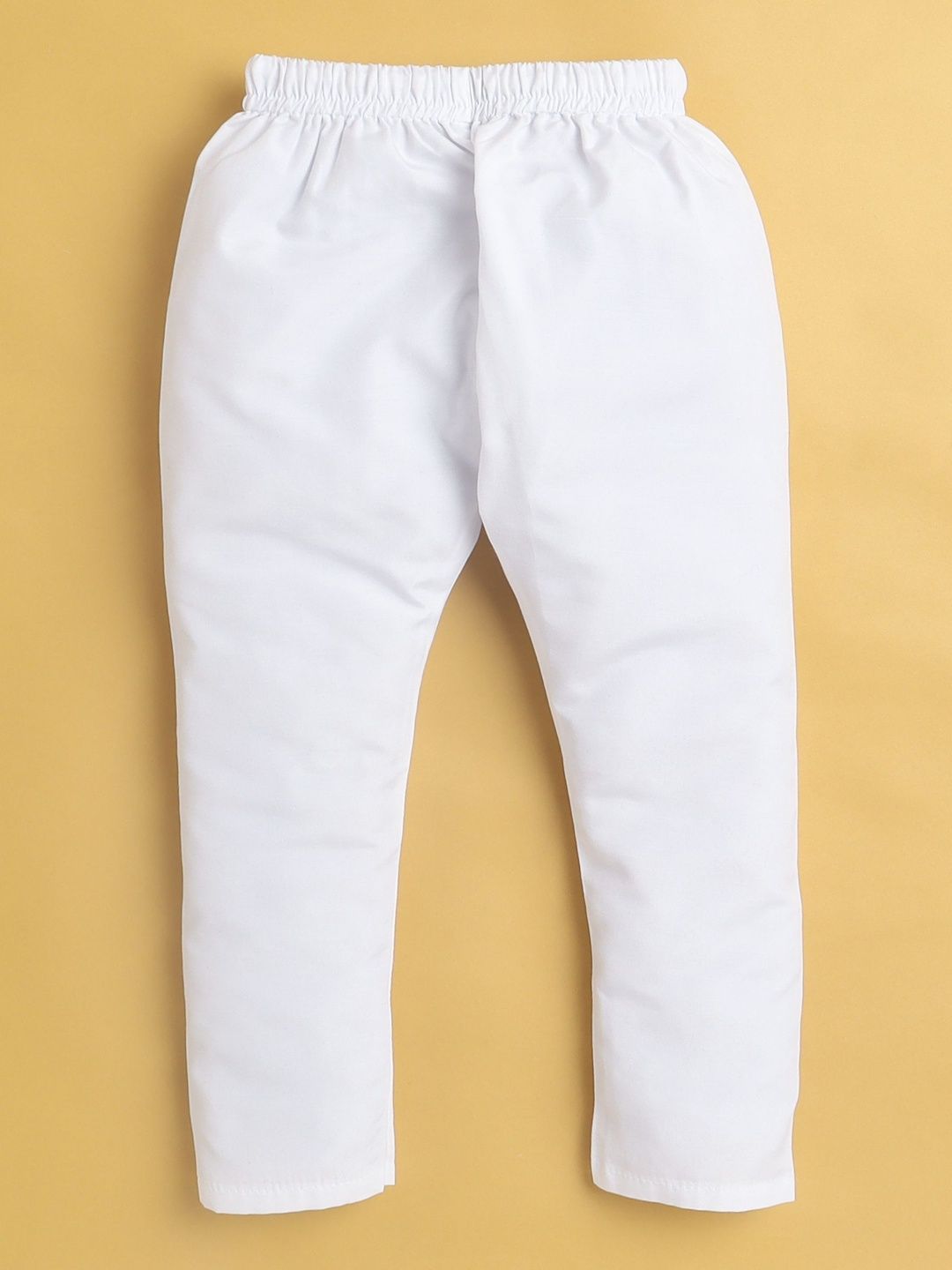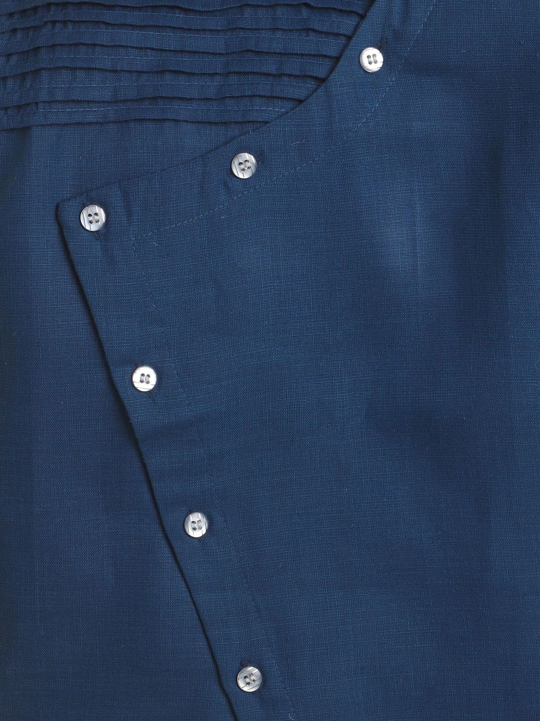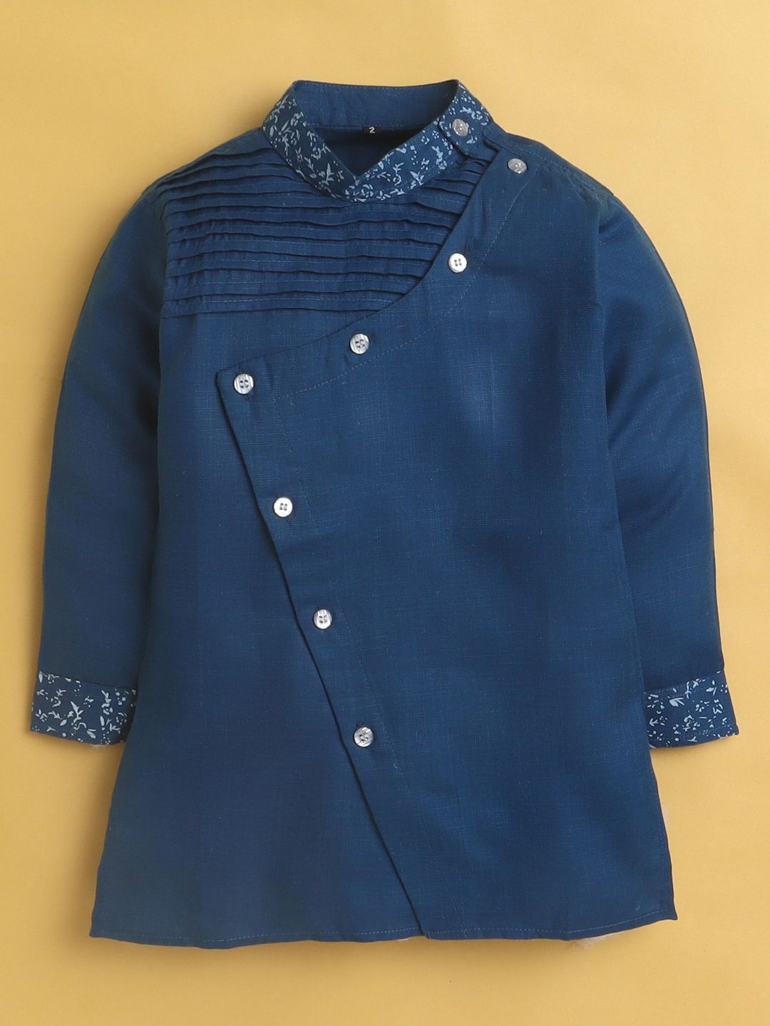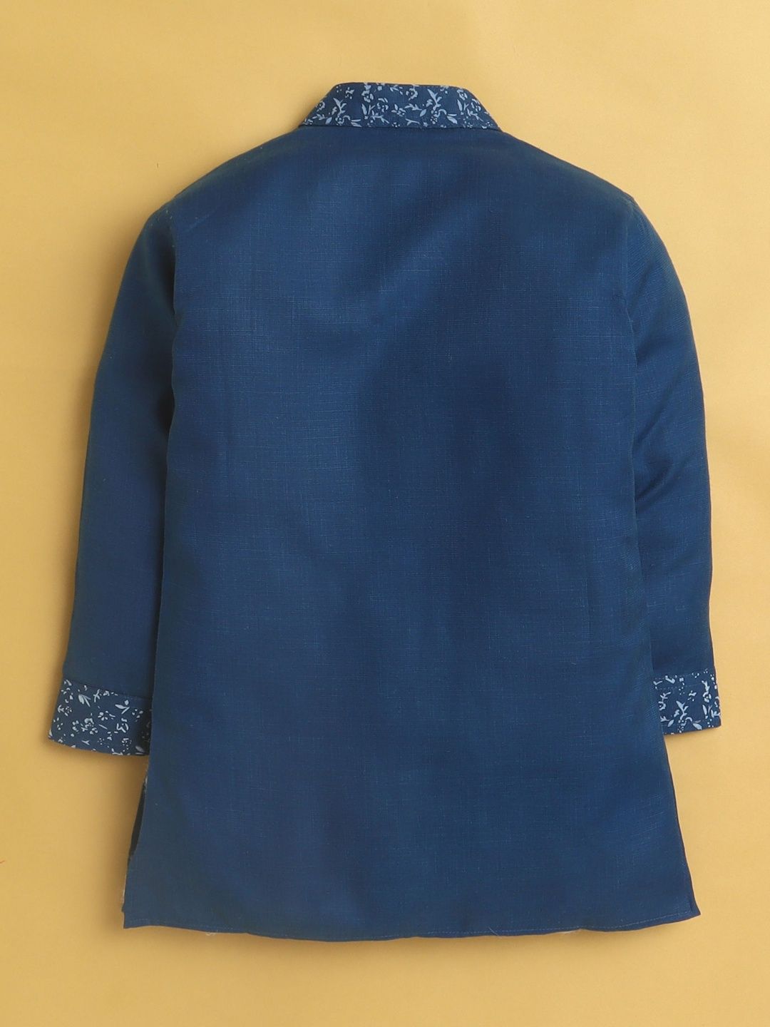 This kurta set consists of kurta and PyjamaKurta DesignBlue KurtaSolidMandarin collar Long regular sleevesStraight shapedAbove Knee-length with straight hemMachine weave regular cotton blendPyjama Design:White solid PyjamaElasticated waistband with drawstring Closure