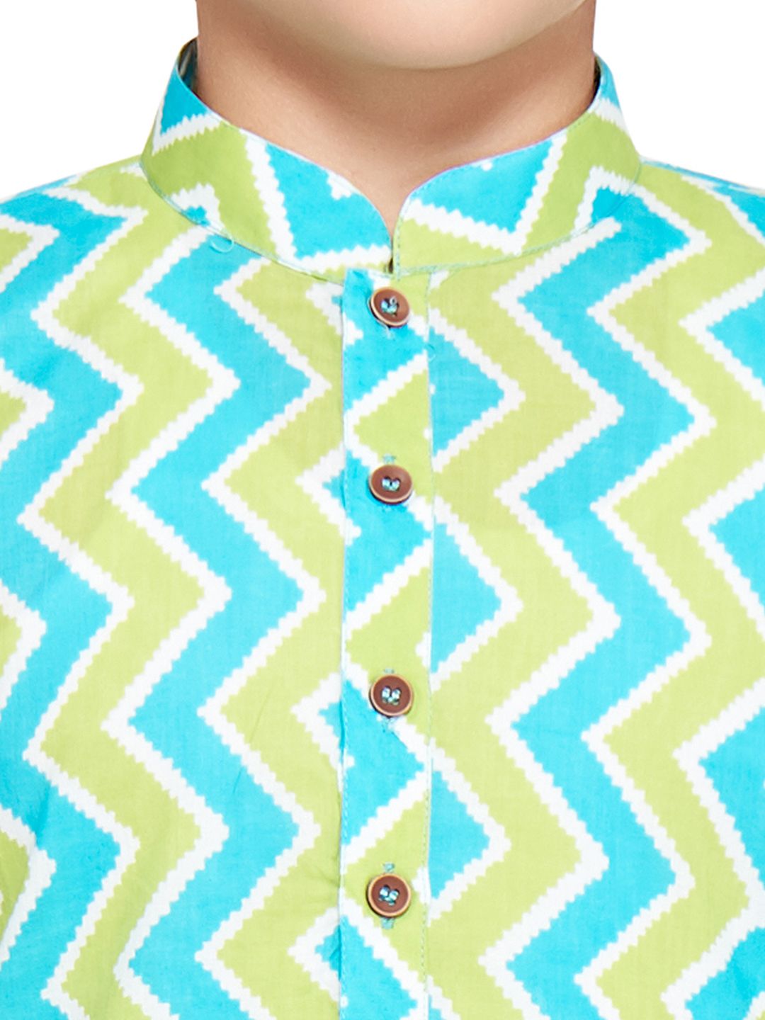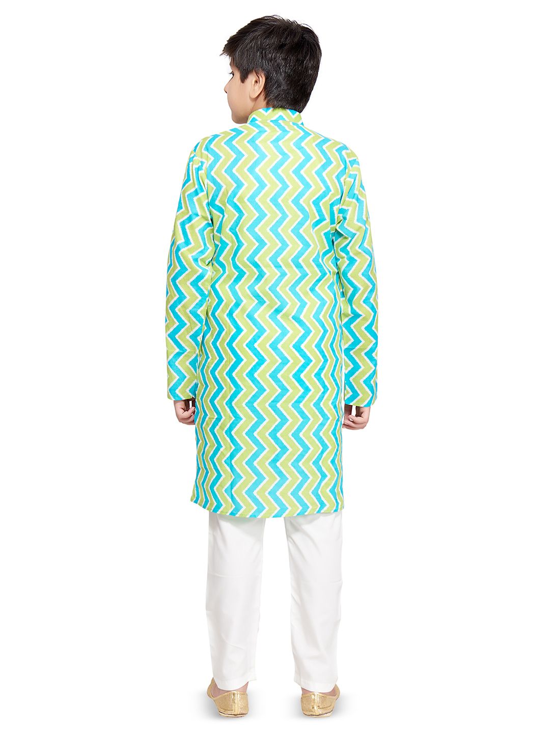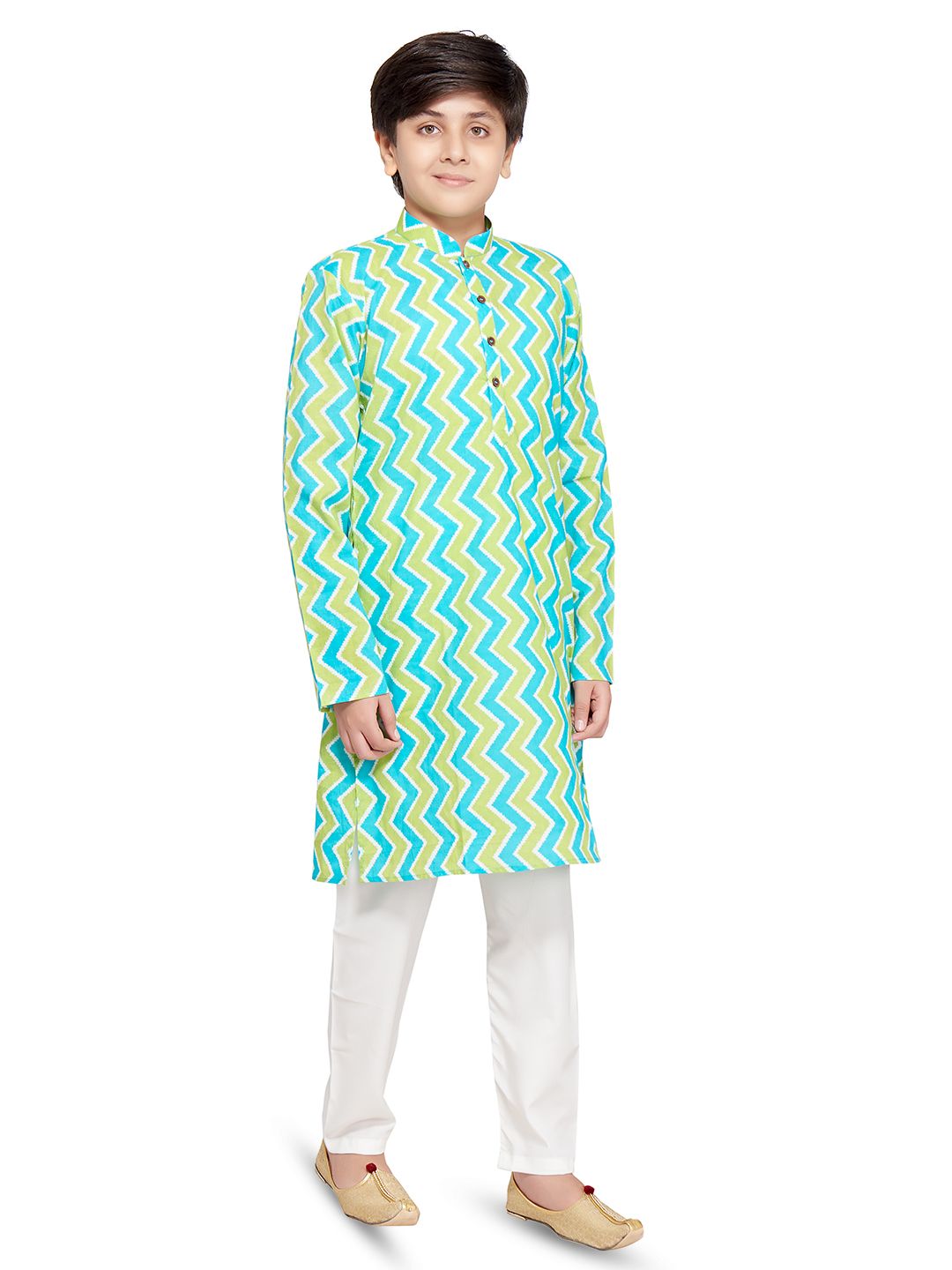 This kurta set consists of kurta and pyjamasKurta DesignGreen KurtaPrintedMandarin CollarLong SleevesStraight shapedKnee-length with side slits and Straight hemMachine weave regular cotton blendPyjamas Design:White solid dhotidrawstring closure