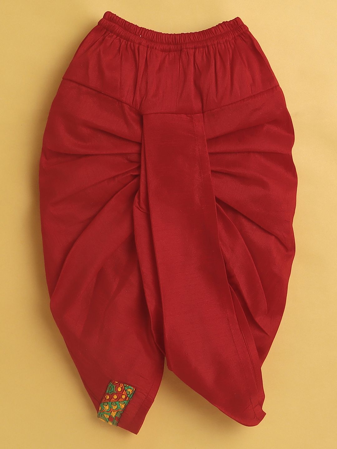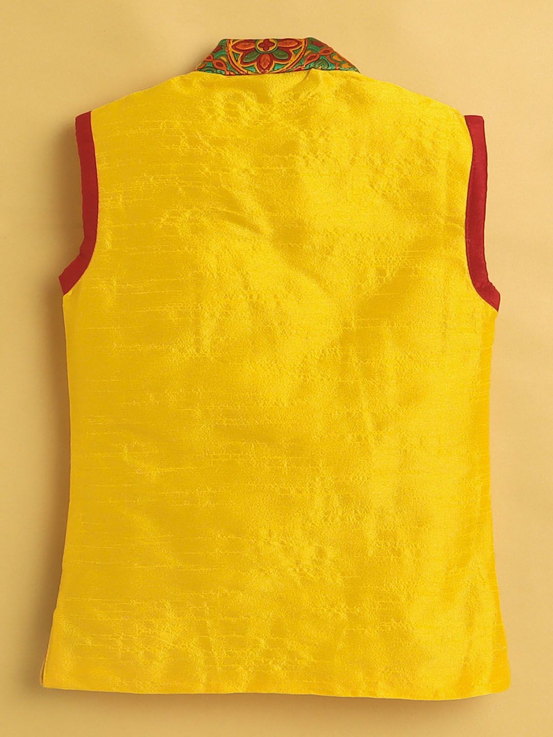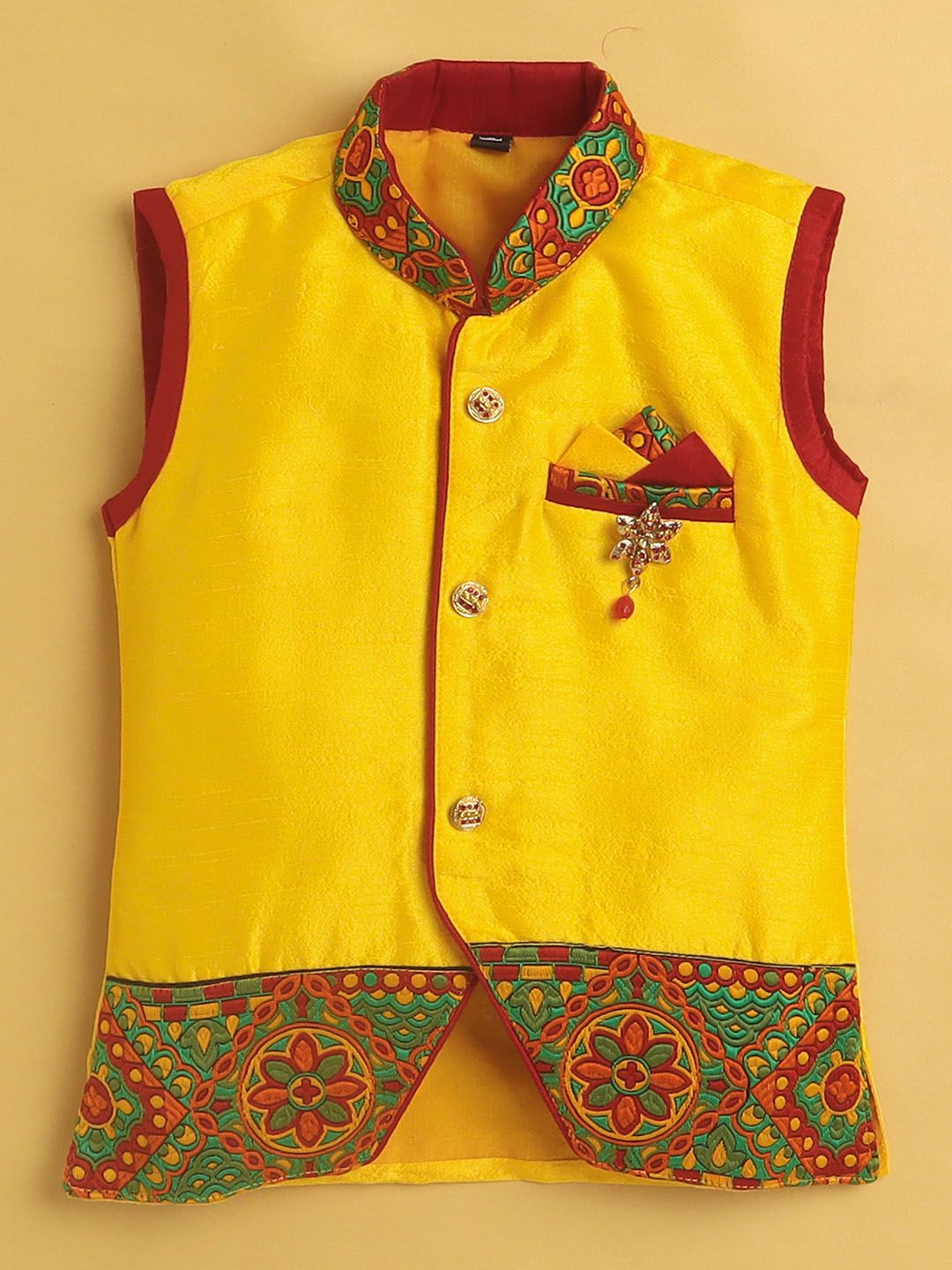 This kurta set consists of kurta and dhoti pantsKurta DesignYellow KurtaWoven DesignedMandarin CollarSleevelessStraight shapedAbove knee-length with side slits and straight hemMachine weave regular silk blendDhoti Design:Red solid dhotiSlip-on closure