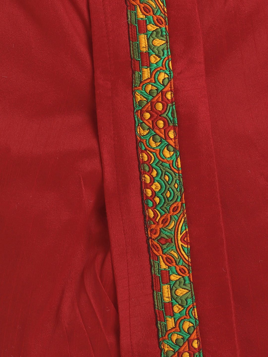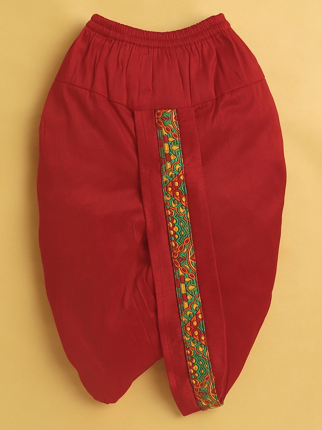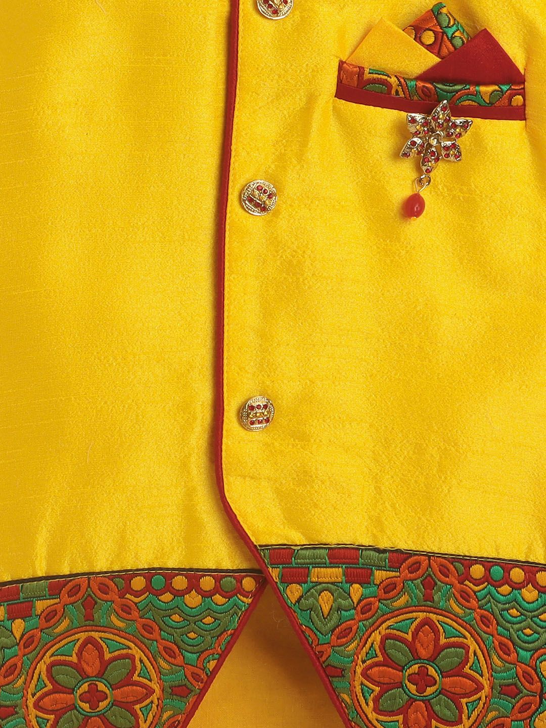 This kurta set consists of kurta and dhoti pantsKurta DesignYellow KurtaWoven DesignedMandarin CollarSleevelessStraight shapedAbove knee-length with side slits and straight hemMachine weave regular silk blendDhoti Design:Red solid dhotiSlip-on closure