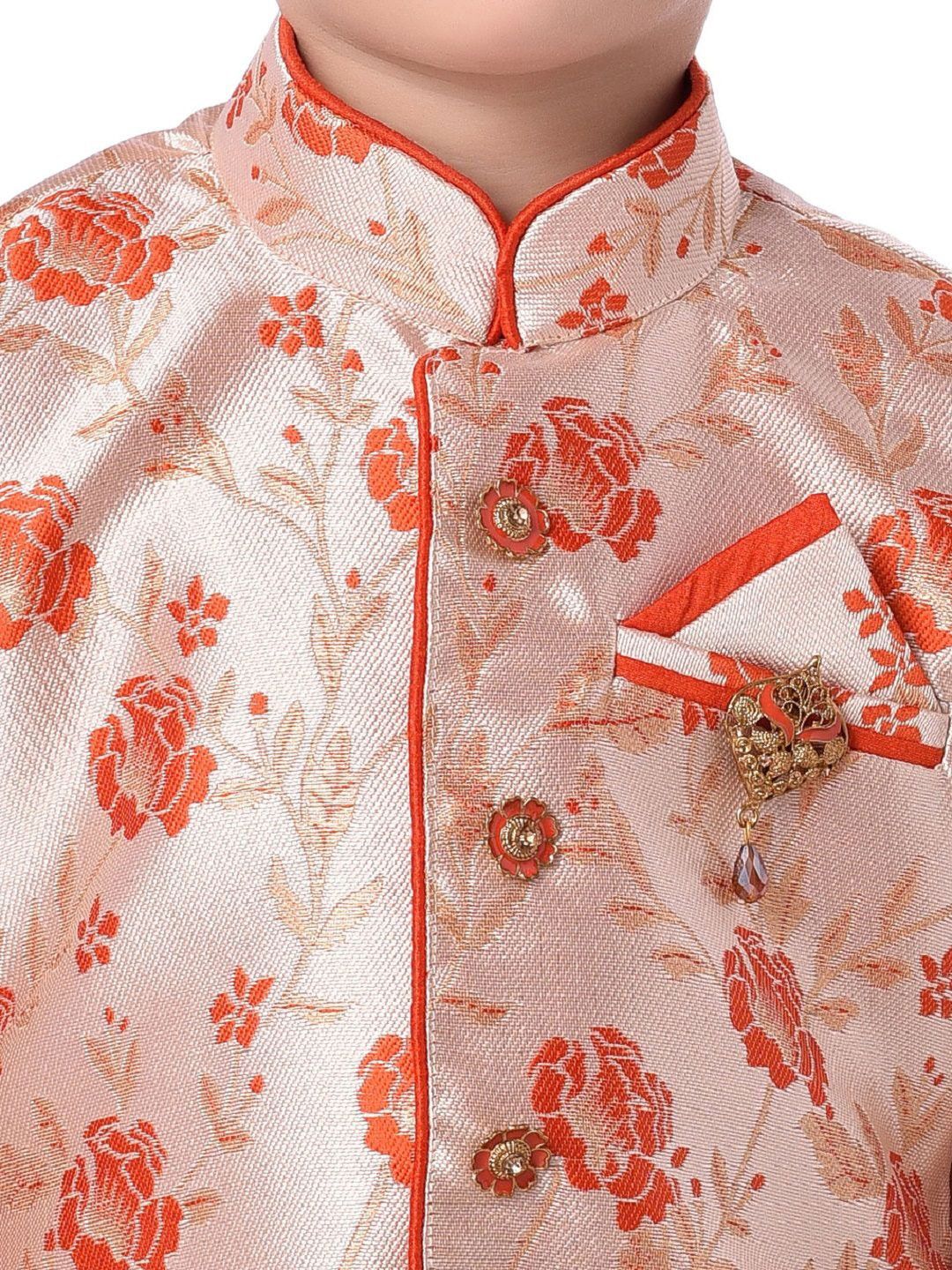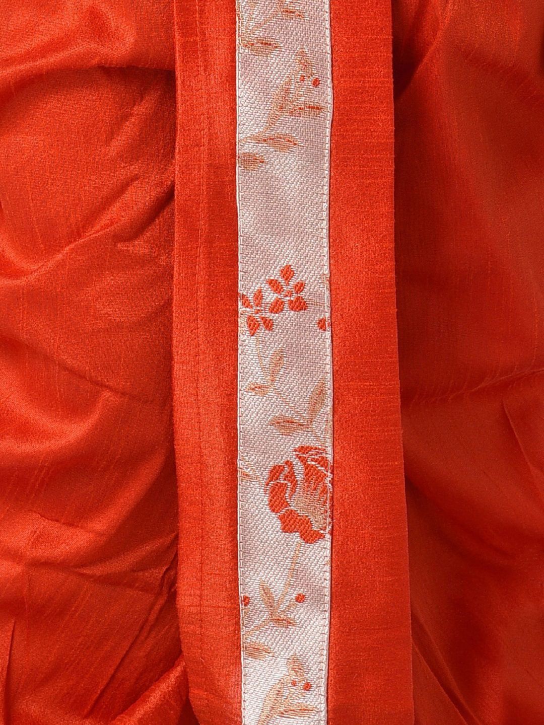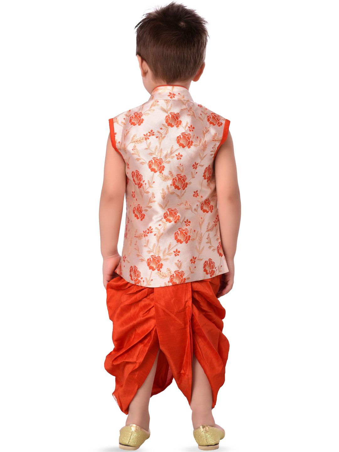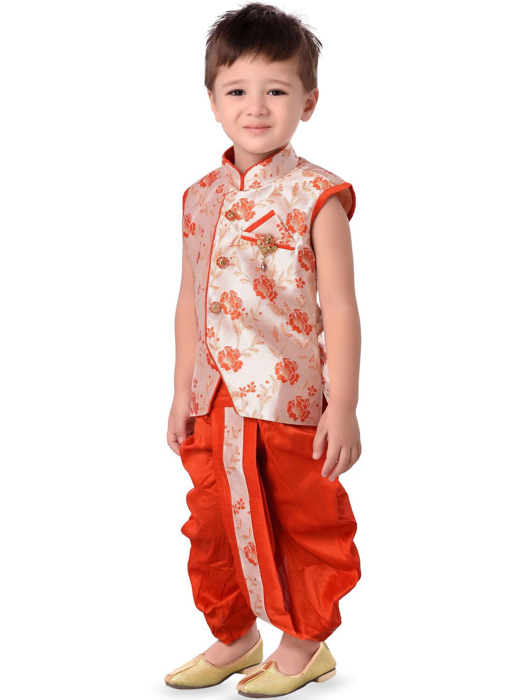 This kurta set consists of kurta and dhoti pantsKurta DesignOrange KurtaWoven DesignedMandarin CollarSleevelessStraight shapedAbove knee-length with side slits and straight hemMachine weave regular silk blendDhoti Design:Red solid dhotiSlip-on closure