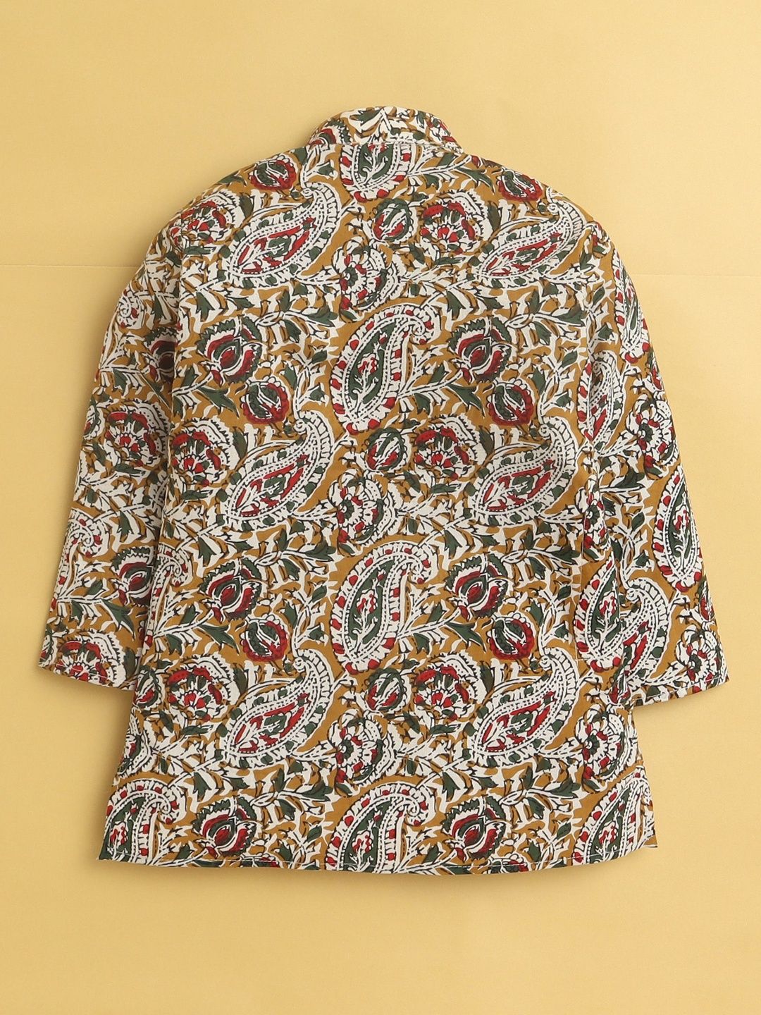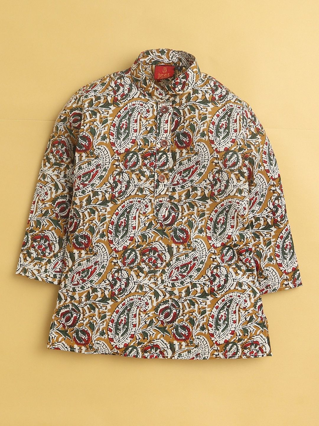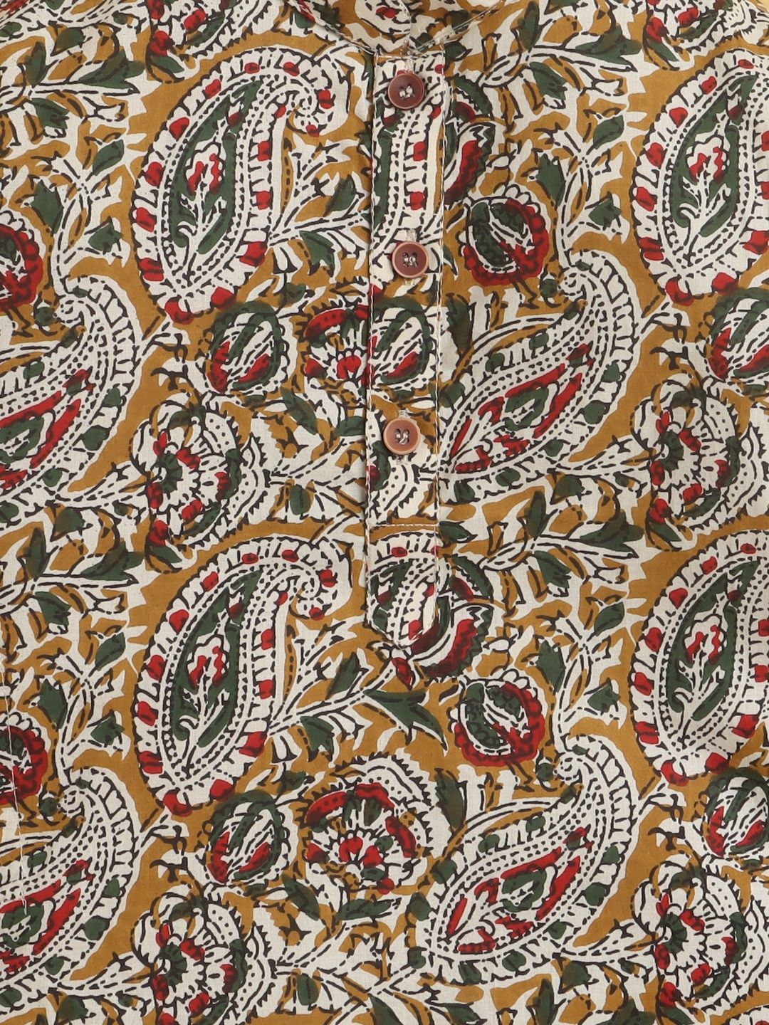 This kurta set consists of kurta and PyjamaKurta DesignRed brown & white KurtaPrintedMandarin collar Long regular sleevesStraight shapedAbove Knee-length with straight hemMachine weave regular cotton blendPyjama Design:Cream color solid PyjamaElasticated waistband with drawstring Closure
