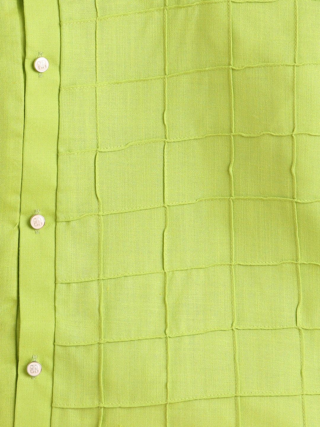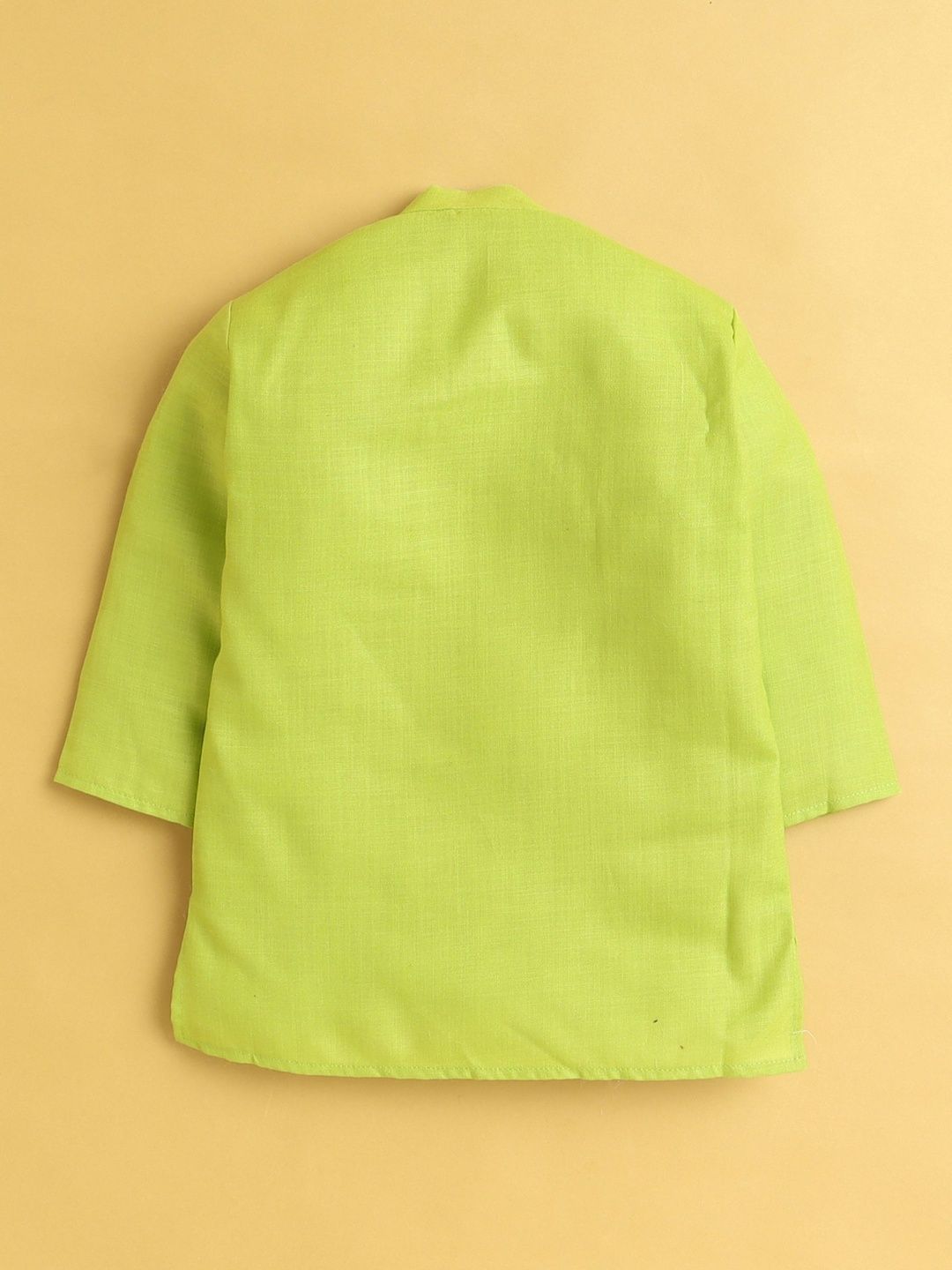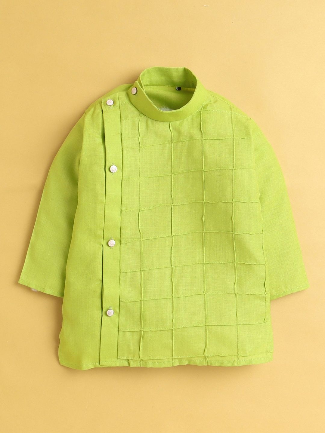 This kurta set consists of kurta and PyjamaKurta DesignGreen KurtaCheckedMandarin collar Long regular sleevesStraight shapedAbove Knee-length with straight hemMachine weave regular cotton blendPyjama Design:White solid PyjamaElasticated waistband with drawstring Closure