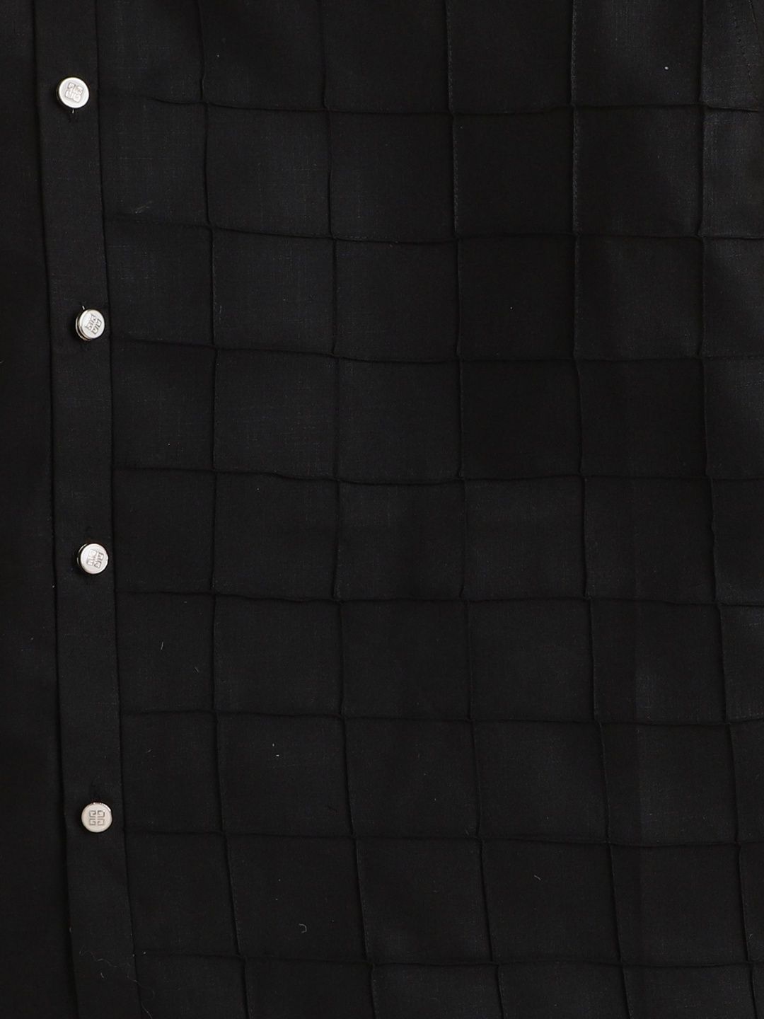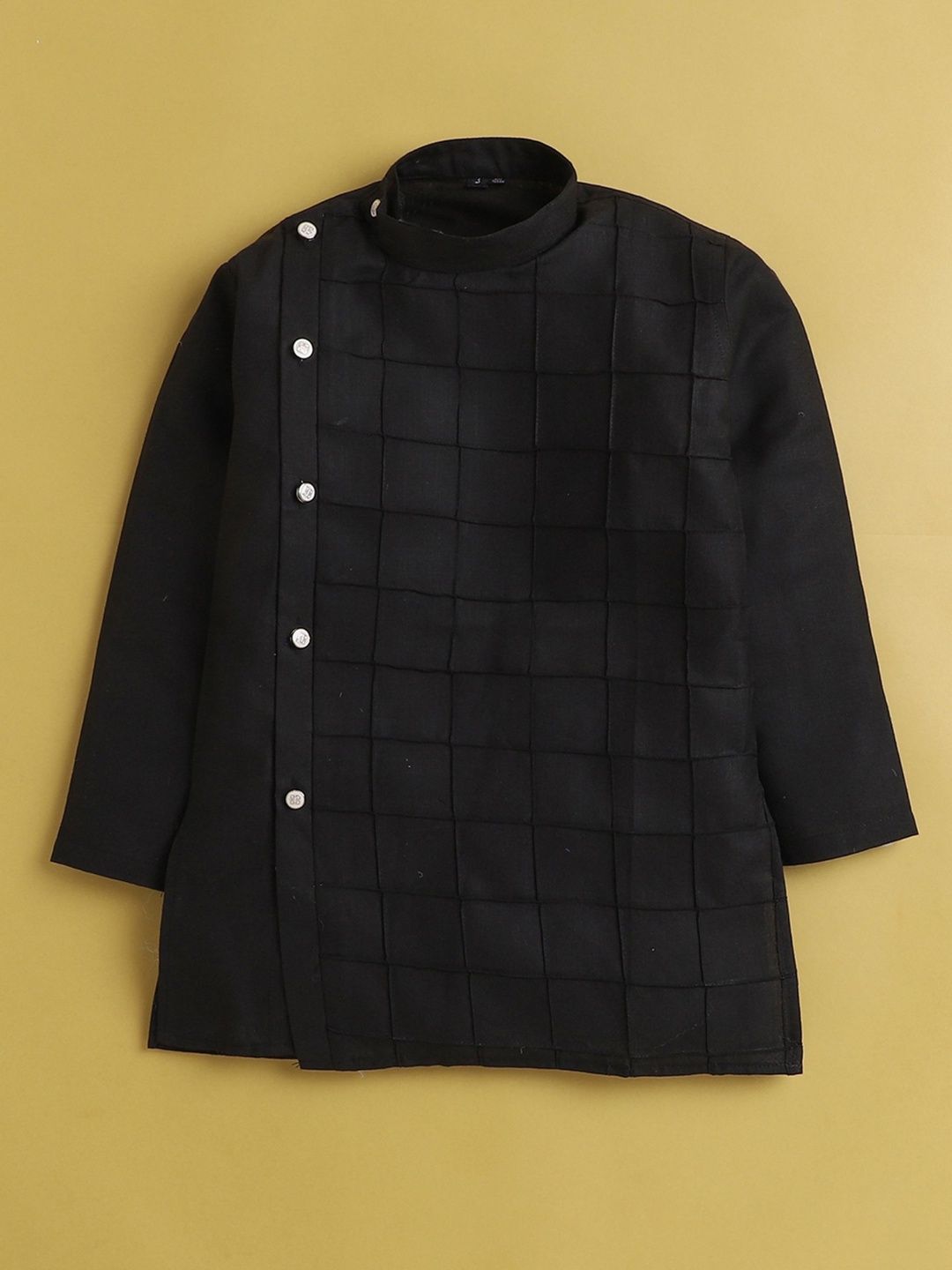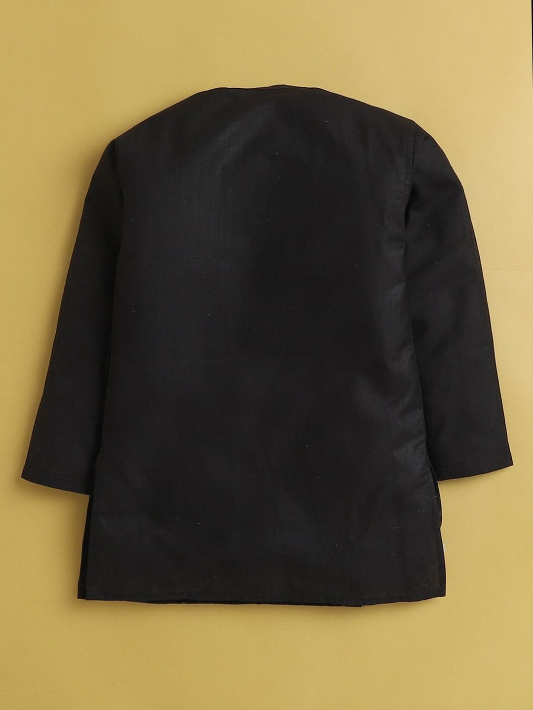 This kurta set consists of kurta and PyjamaKurta DesignBlack KurtaCheckedMandarin collar Long regular sleevesStraight shapedAbove Knee-length with straight hemMachine weave regular cotton blendPyjama Design:White solid PyjamaElasticated waistband with drawstring Closure