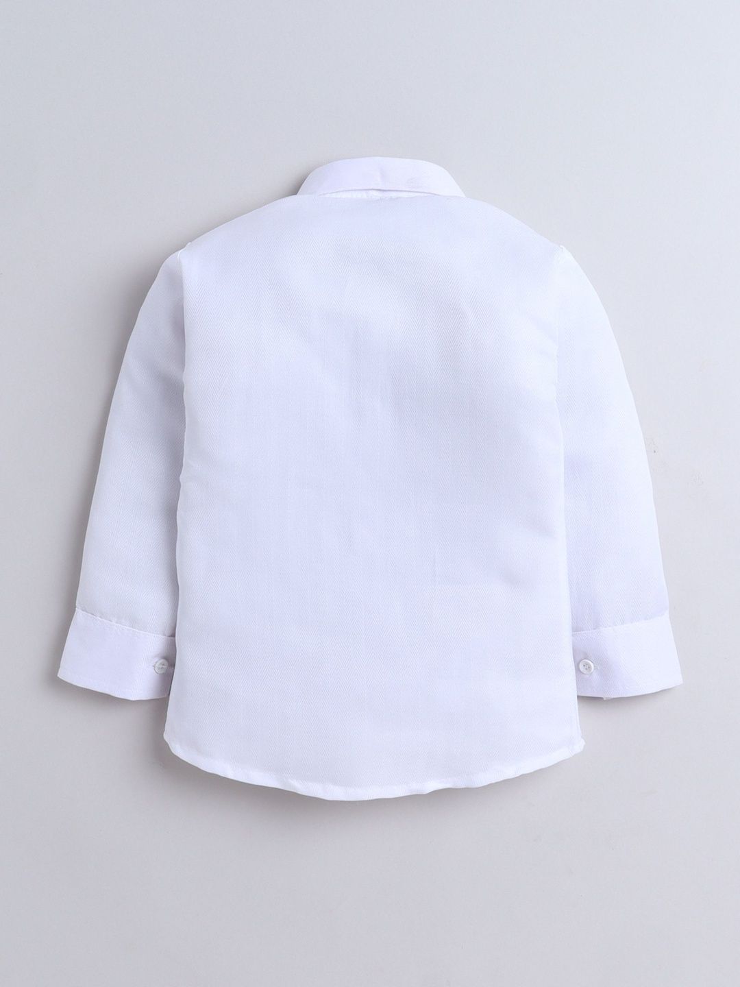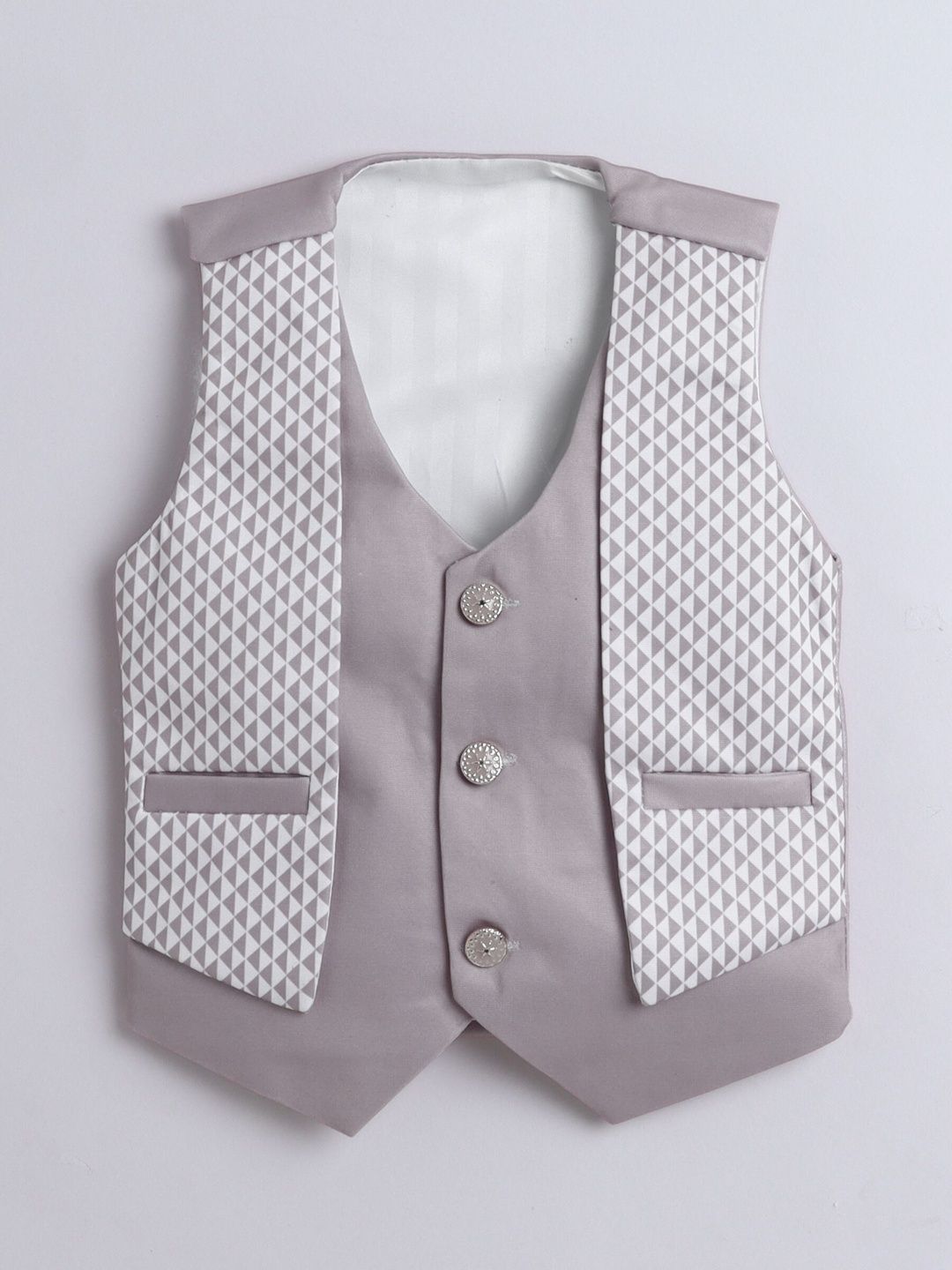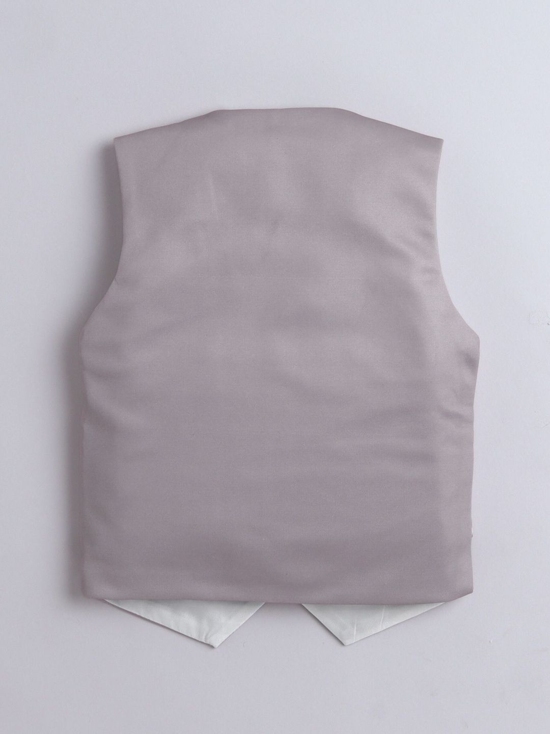 Blown party suit with shirt, waistcoat and trousersWhite solid regular-fit shirt, has a shirt collar, full placket button closures, long sleevesBrown solid mid-rise trousers, has a zip fly with a button and a hook-and-bar closure, 3 pockets, a waistband with belt loopsBrown printed waistcoat, has a collarless, a full button placket, sleeveless, and two pocketsComes with matching bow