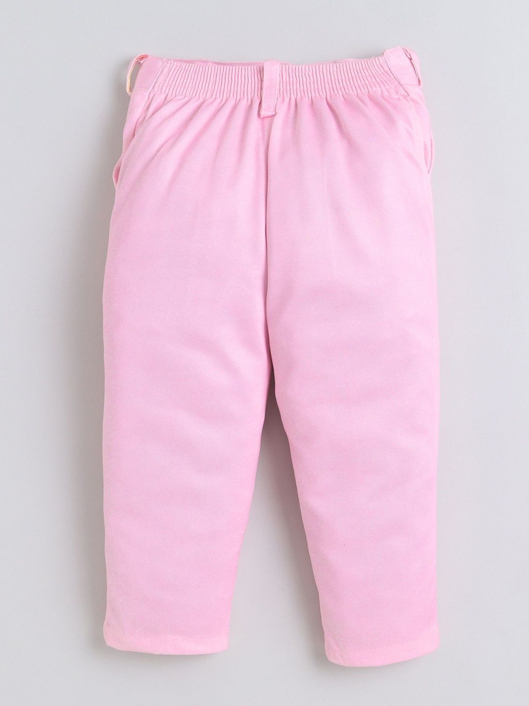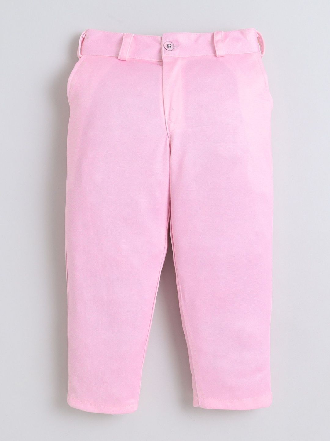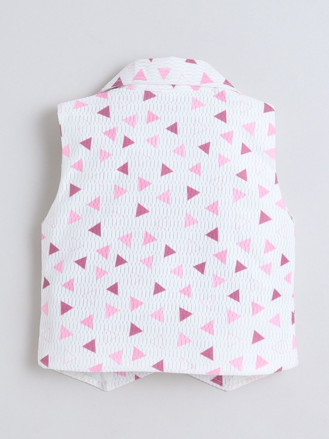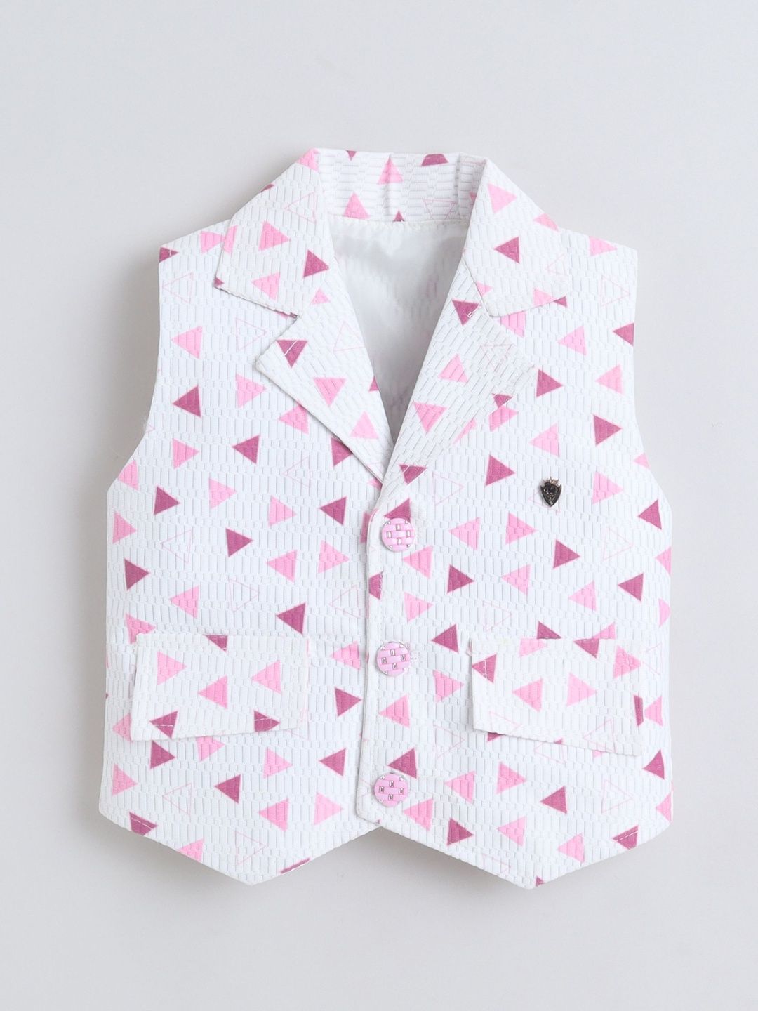 This suit consists of a waistcoat, shirt, trousersWhite printed waistcoat, has a v neck, sleeveless, 2 pockets front button closureWhite solid shirt, has a shirt collar, long sleevesPink solid trouser, has a slip-on closure with button details , 2 pocketsComes with Bow Tie Set
