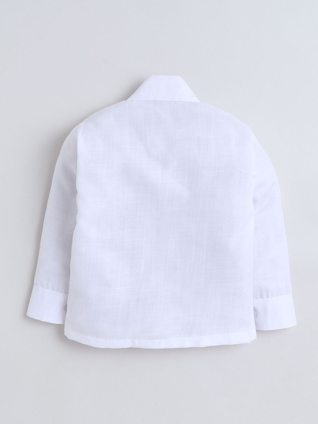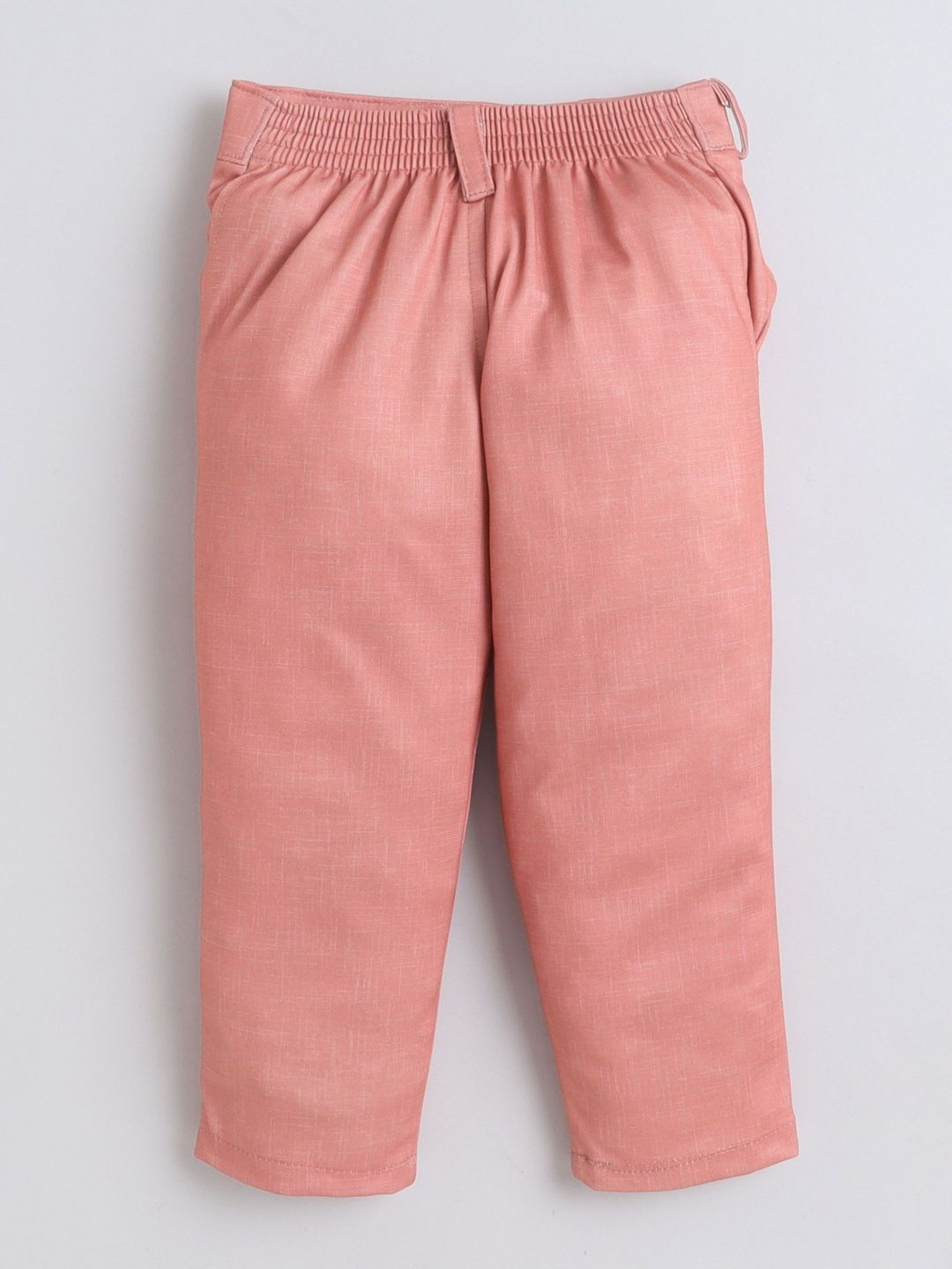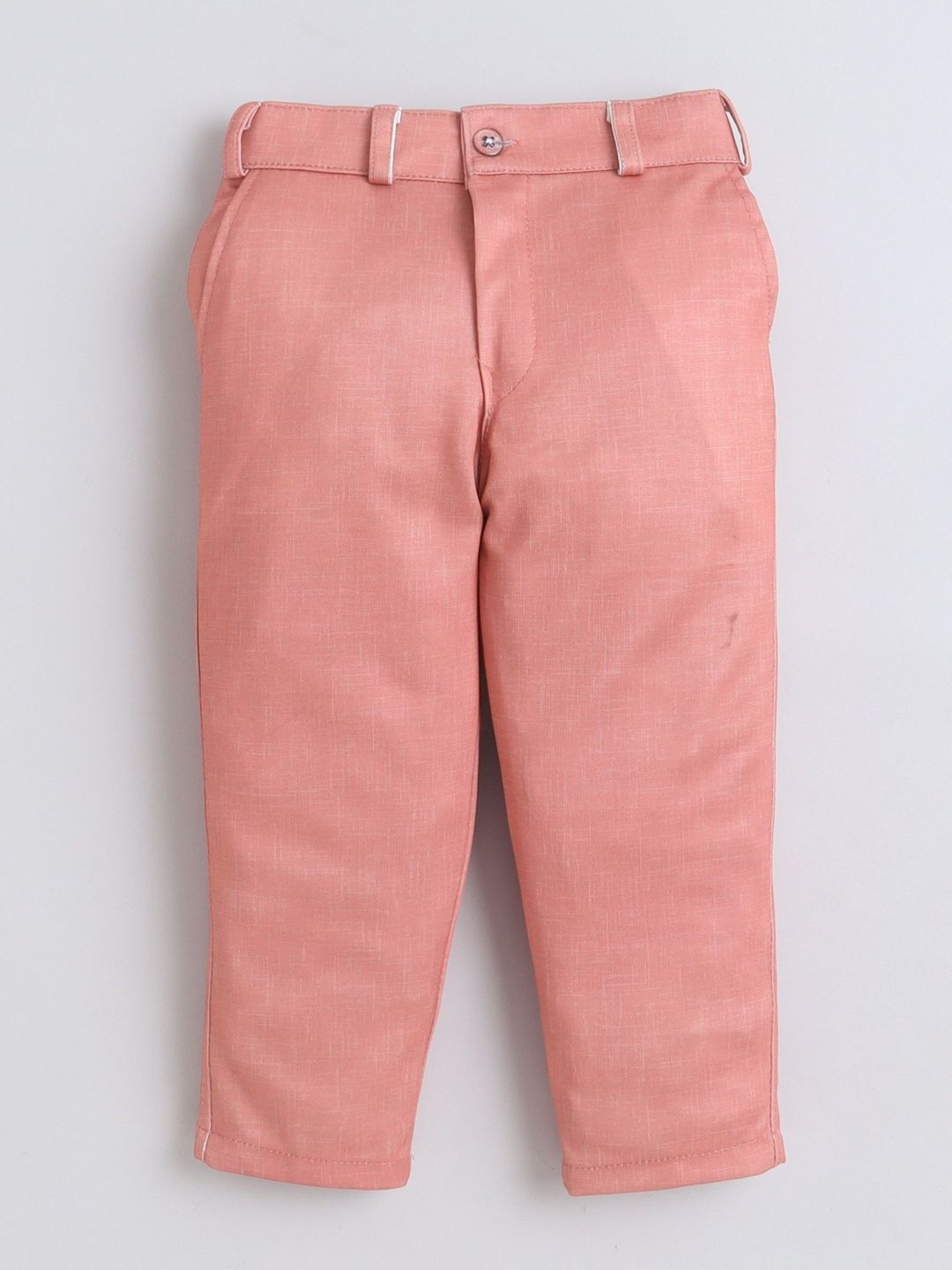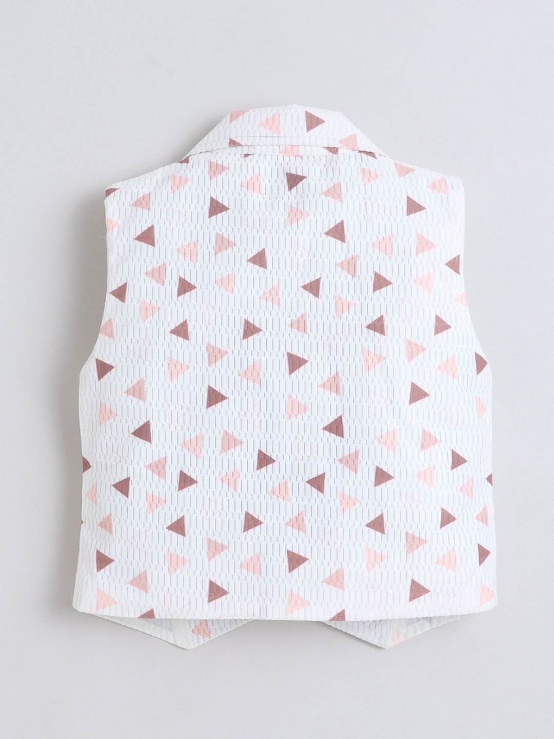 This suit consists of a waistcoat, shirt, trousersWhite printed waistcoat, has a v neck, sleeveless, 2 pockets front button closureWhite solid shirt, has a shirt collar, long sleevesCoral solid trouser, has a slip-on closure with button details , 2 pocketsComes with Bow Tie Set