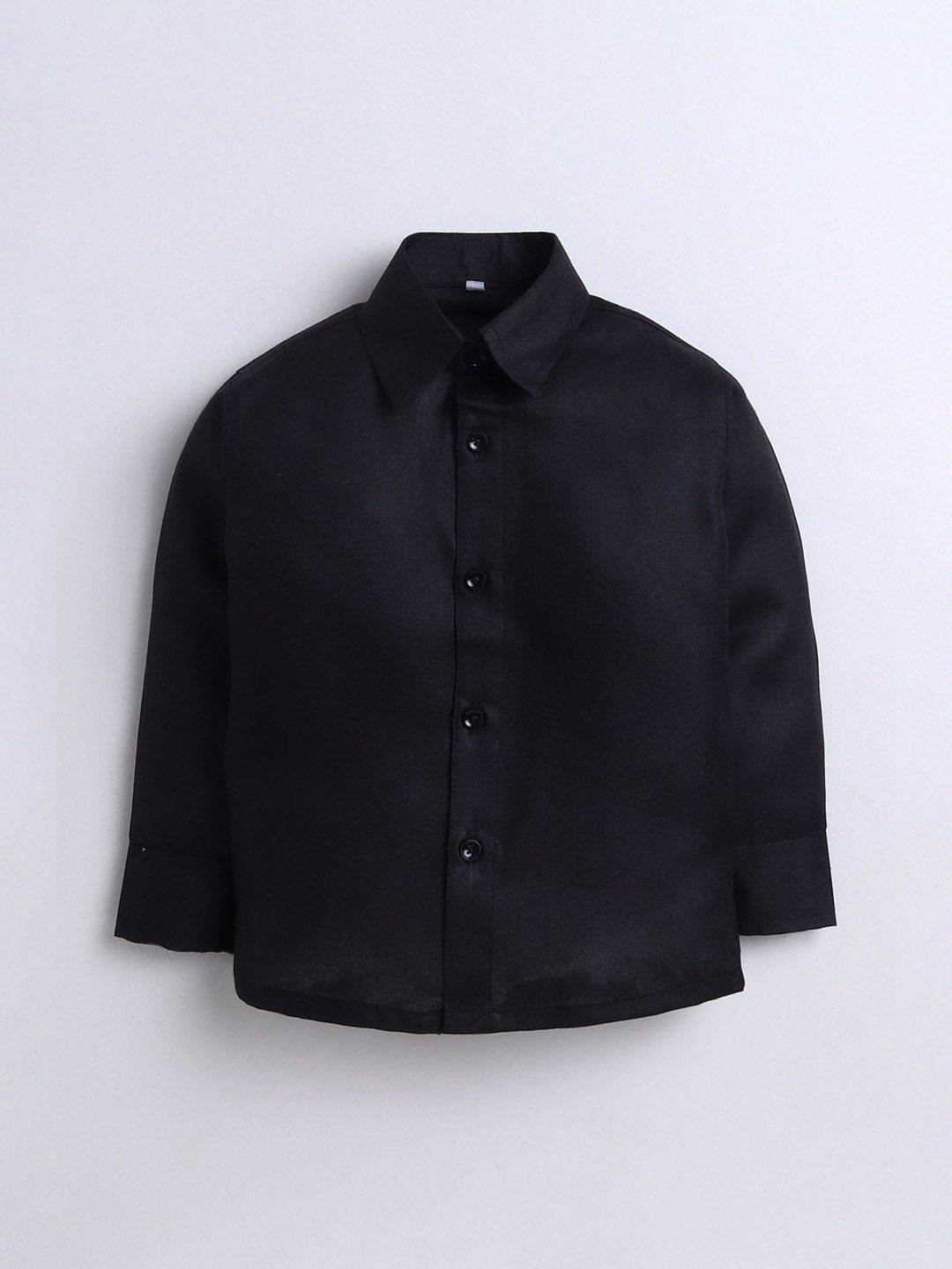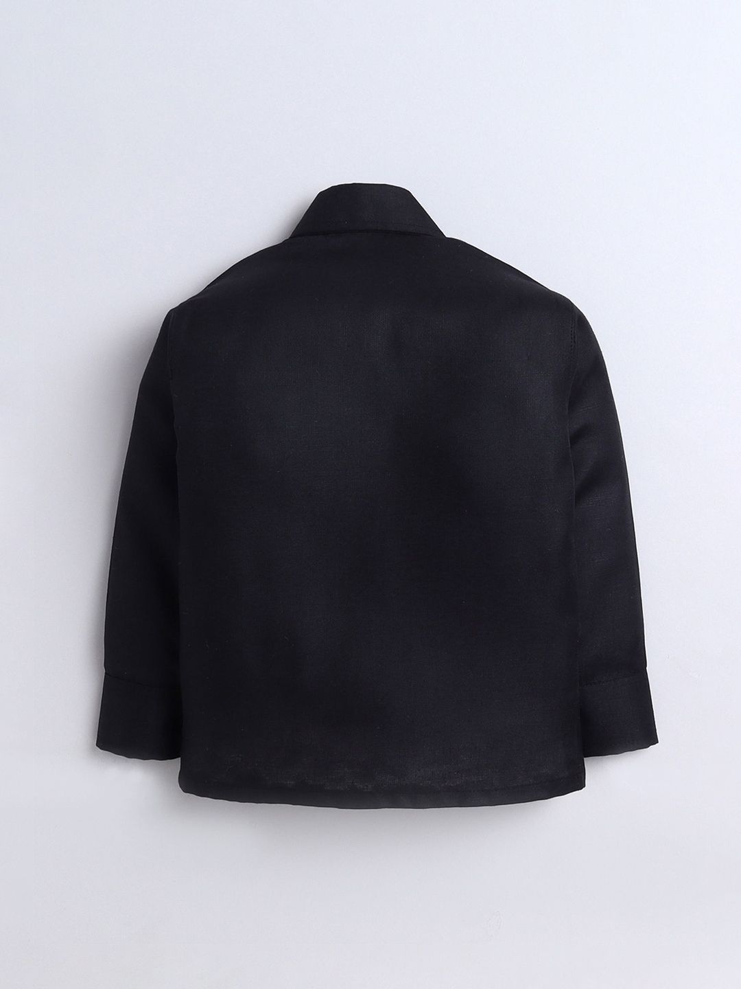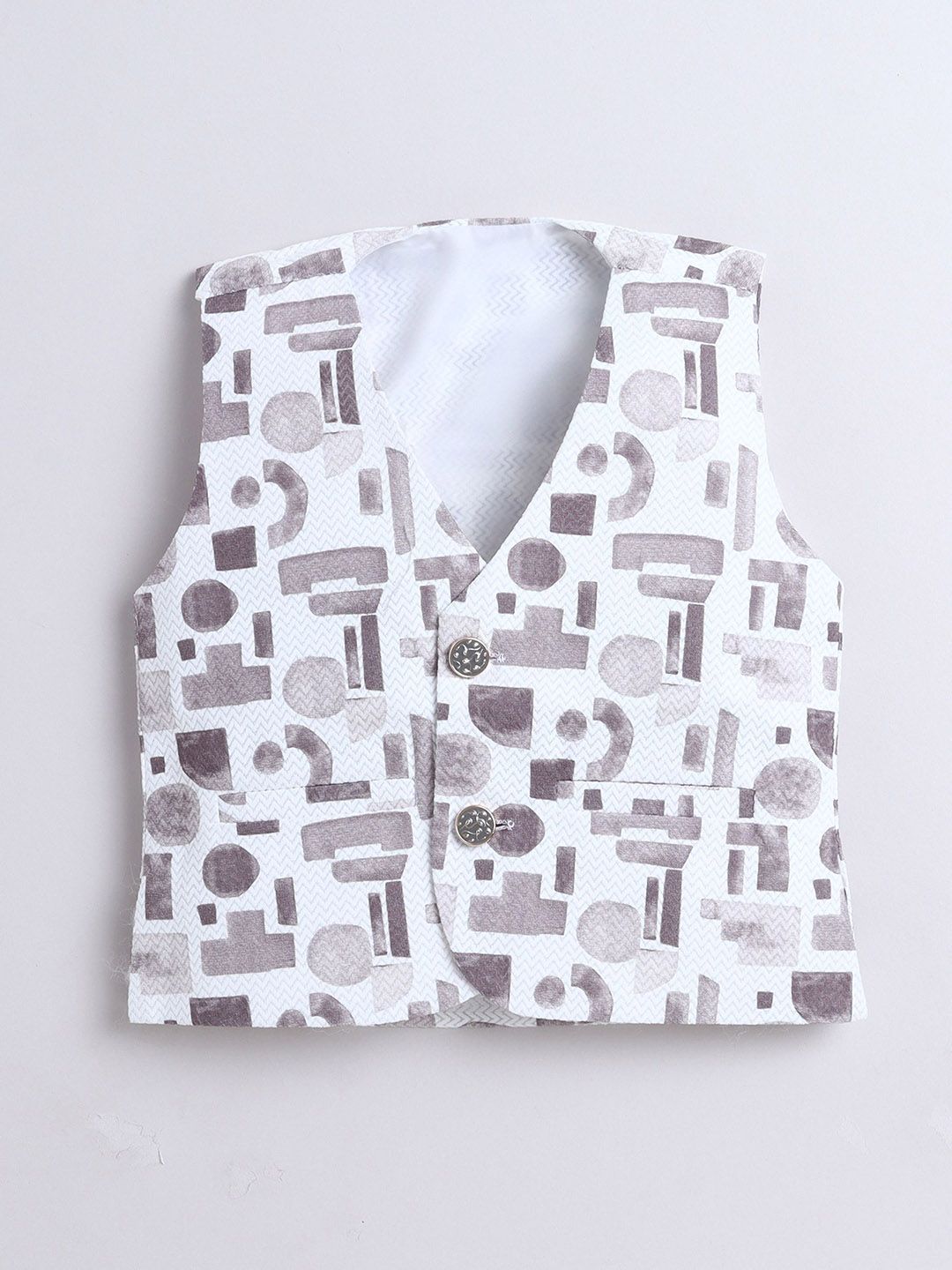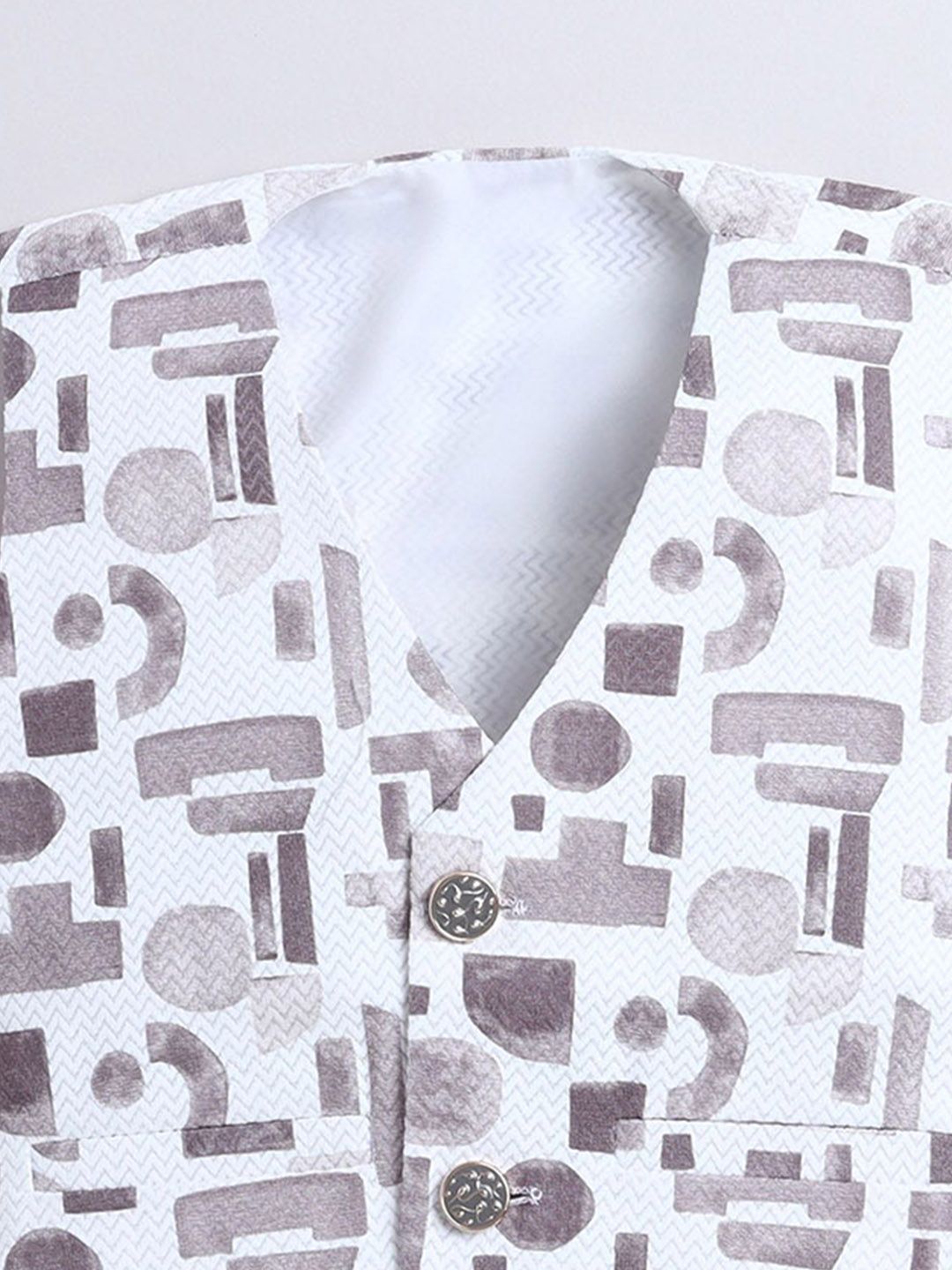 Black solid regular-fit three-piece party suitBlack solid regular-fit shirt, has a spread collar with button closures, long sleevesWhite printed single-breasted regular-fit waistcoat, has a V-neck, button closures on the front, and two pocketsA pair of mauve solid regular-fit mid-rise trousers, has a waistband with belt loops, a zip fly and a button closure, and two pocketsComes with grey solid bowtie
