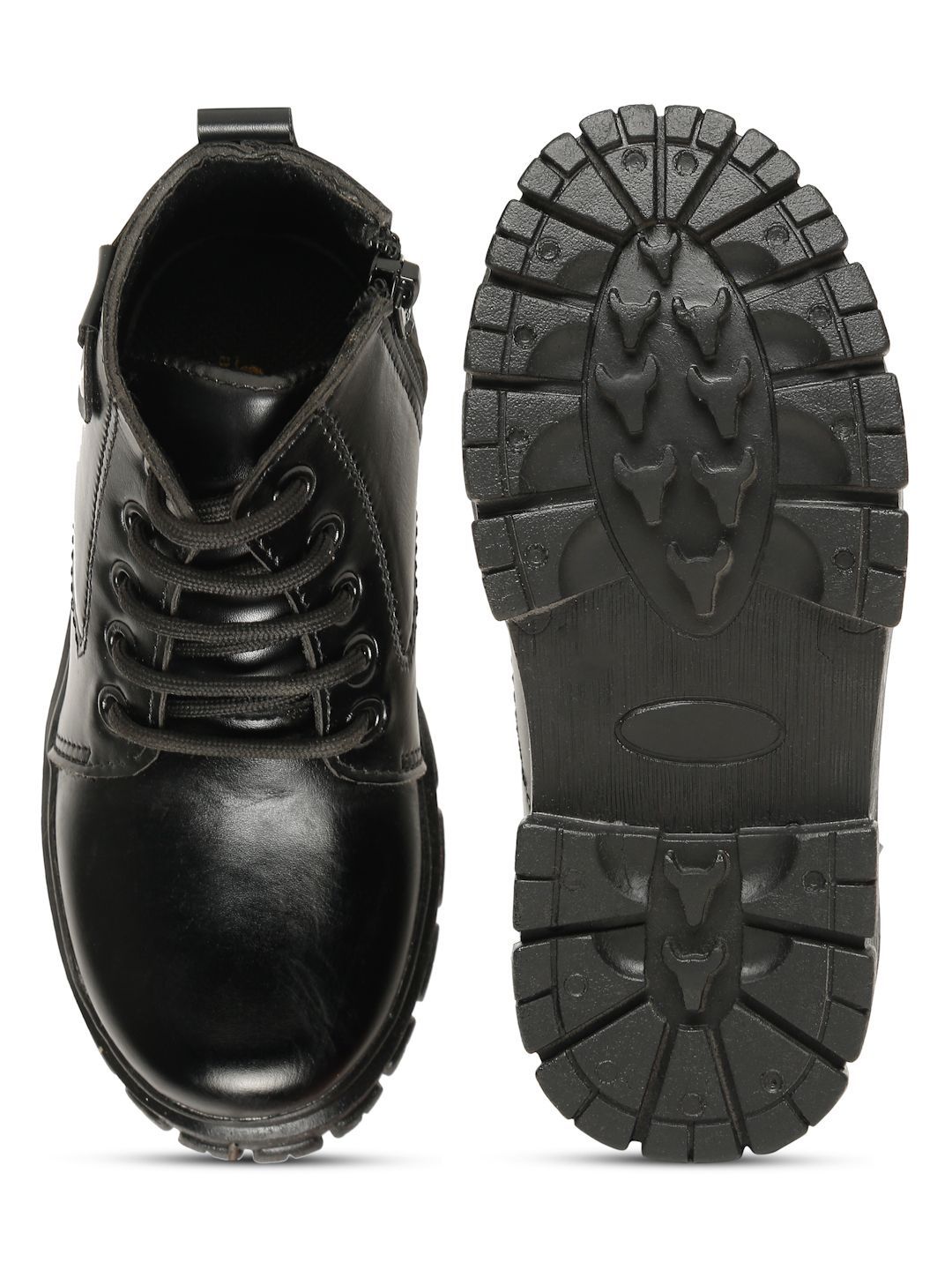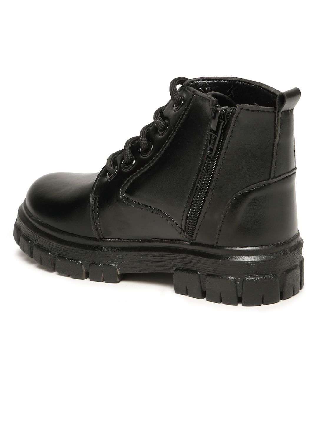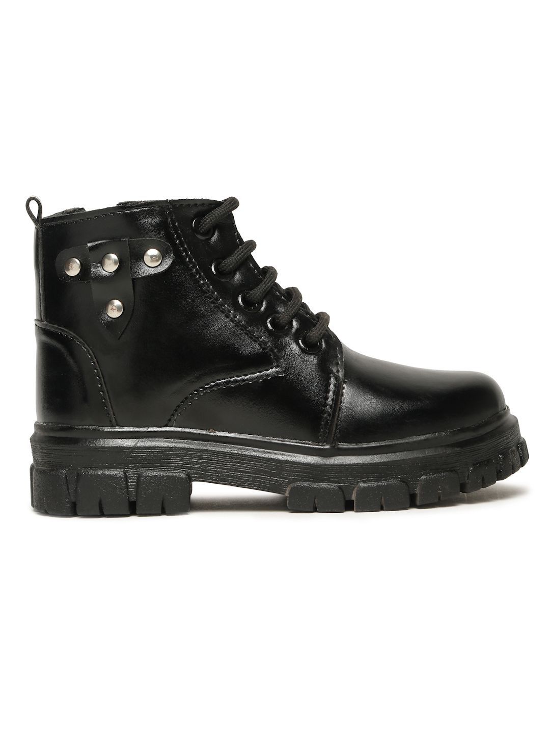 A pair of black regular boots, has mid-top ankle and slip-on fastening and back detailSynthetic Solid upper materialCushioned footbedTextured and patterned TPU outsole, has a block-heeled