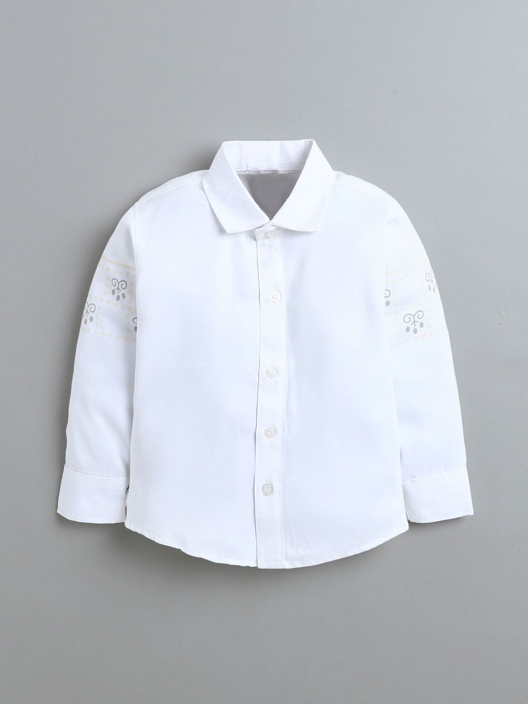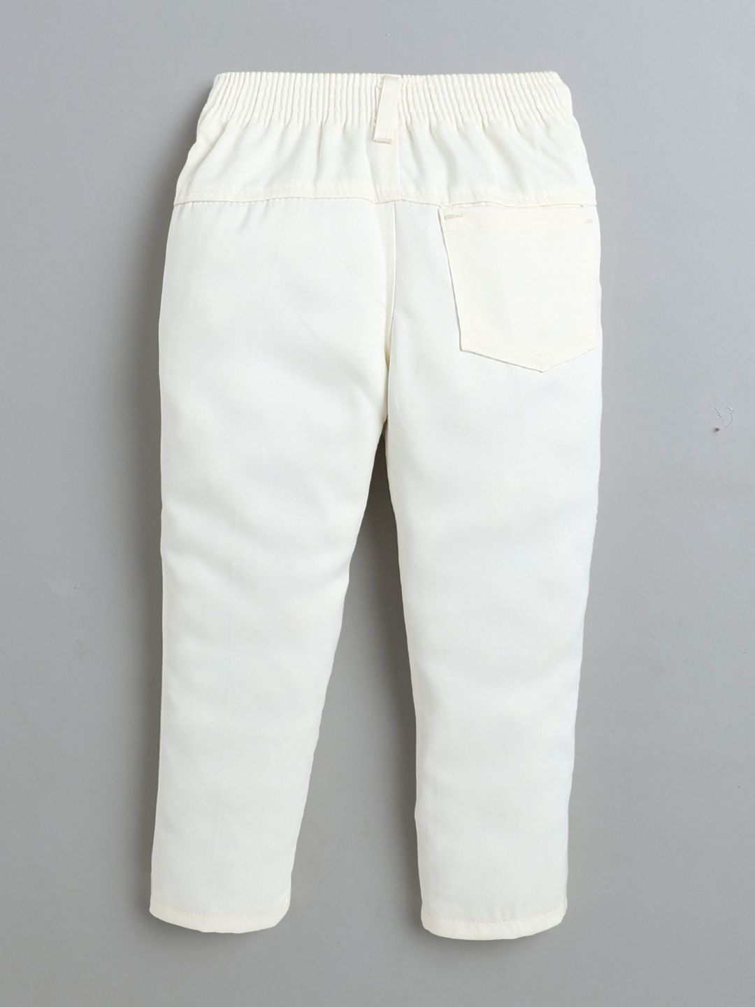 Cream colored embroidered three-piece suit with bowBeige embroidered waistcoat, has a V-neck with button closures, sleeveless and two pocketA pair of cream colored solid mid-rise trousers, has a waistband with belt loops, a zip fly and a button closure, and four pocketsWhite solid shirt, has a shirt collar and long sleeve, secured with button closureComes with matching bow