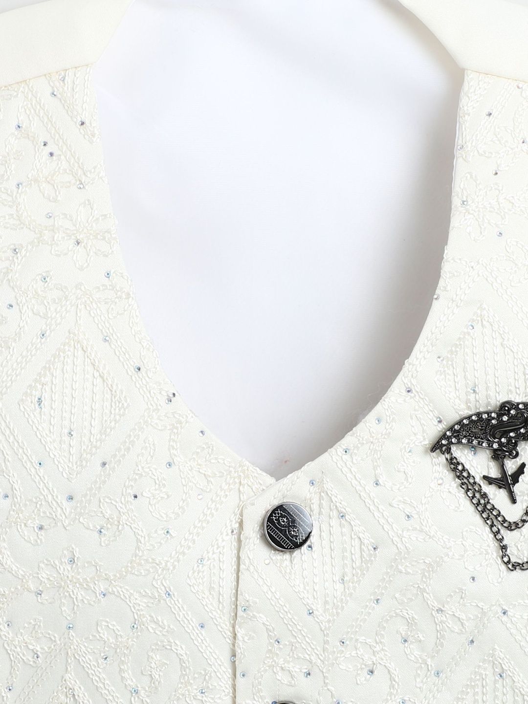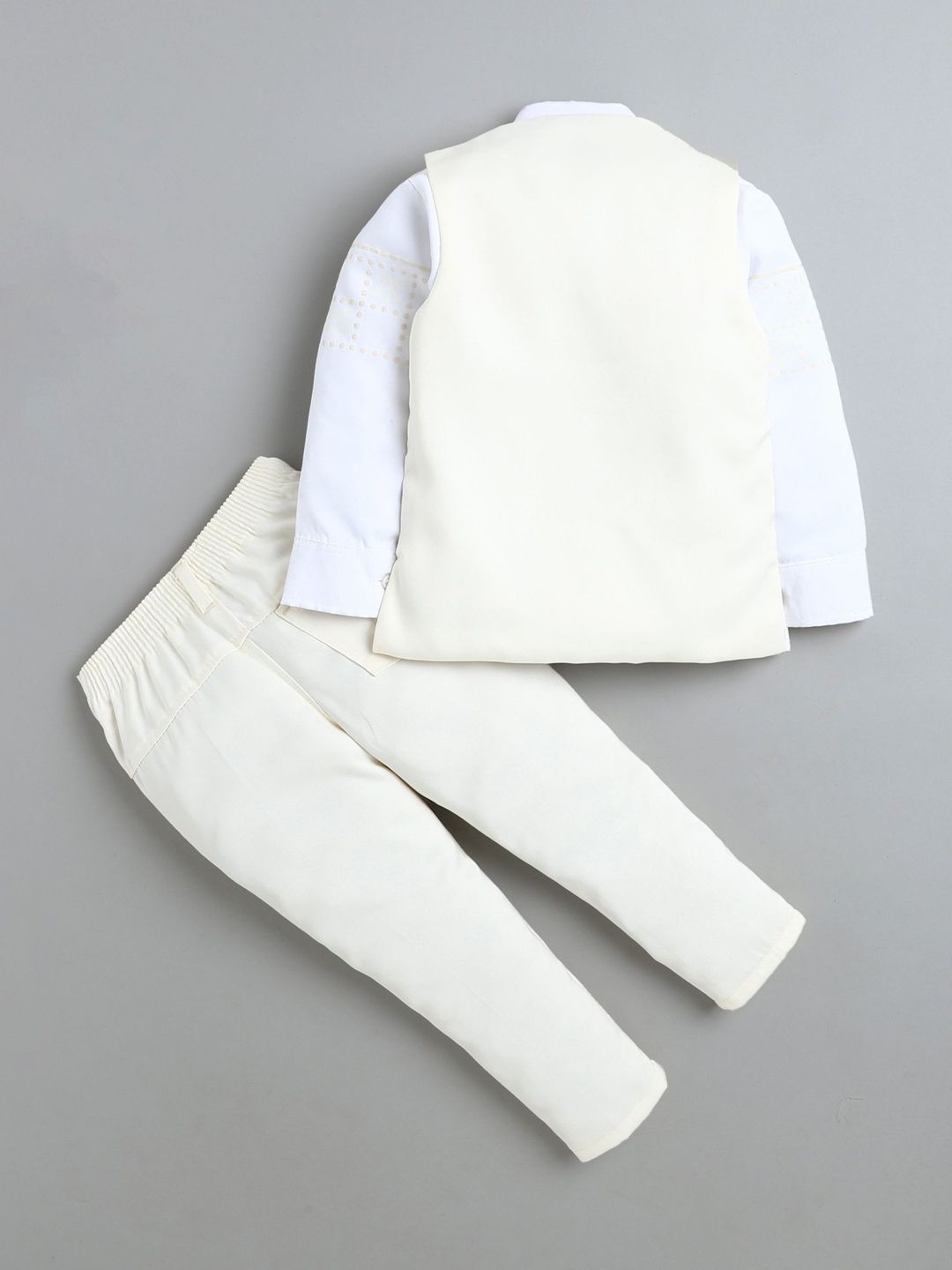 Cream-colored self design regular-fit four-piece party suitCream-colored self-design waistcoat, has v-neck, full placket button closure, sleevelessCream-colored solid regular-fit mid-rise trousers, has a waistband with belt loops, a zip fly and a button closure, and four pocketsWhite solid shirt has, shirt collar neck long sleeves, button closureComes with matching bow tie