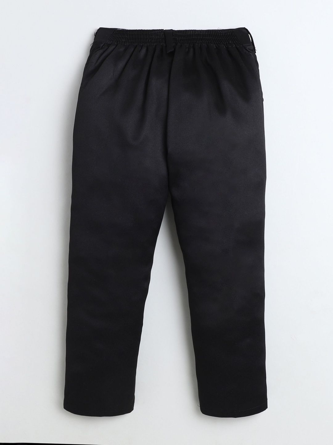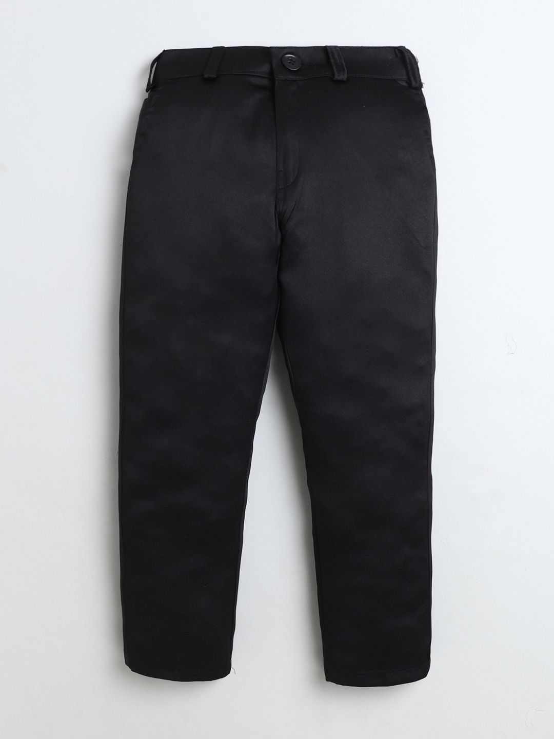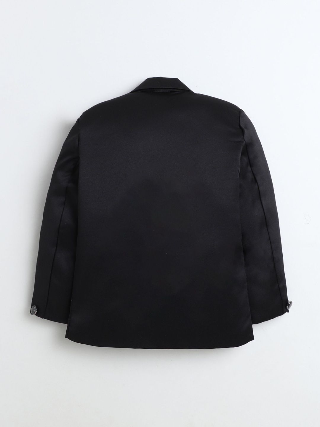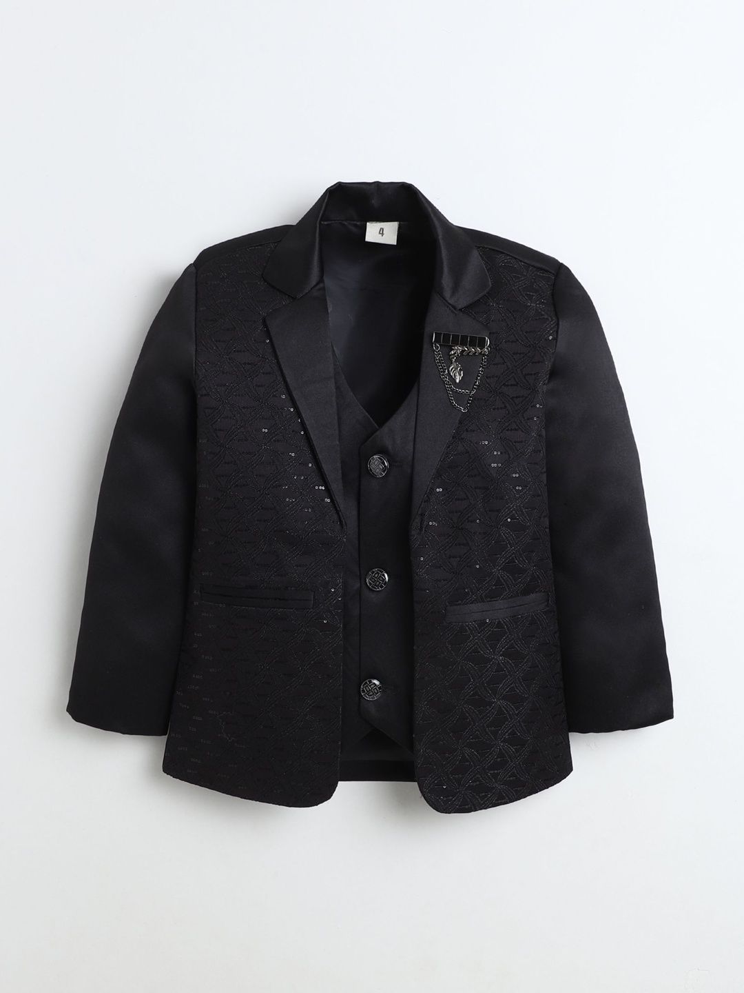 Black geometric jacquard woven suit with blazer, trousers shirt & bowBlack geometric jacquard regular-fit blazer has a notched lapel collar long sleeve single breasted button closure with ventless backBlack solid mid-rise trousers, has a zip fly with a button closure, two pockets, a waistband with belt loopsWhite solid shirt has shirt collar, long sleeve with button closure Comes with a matching bow