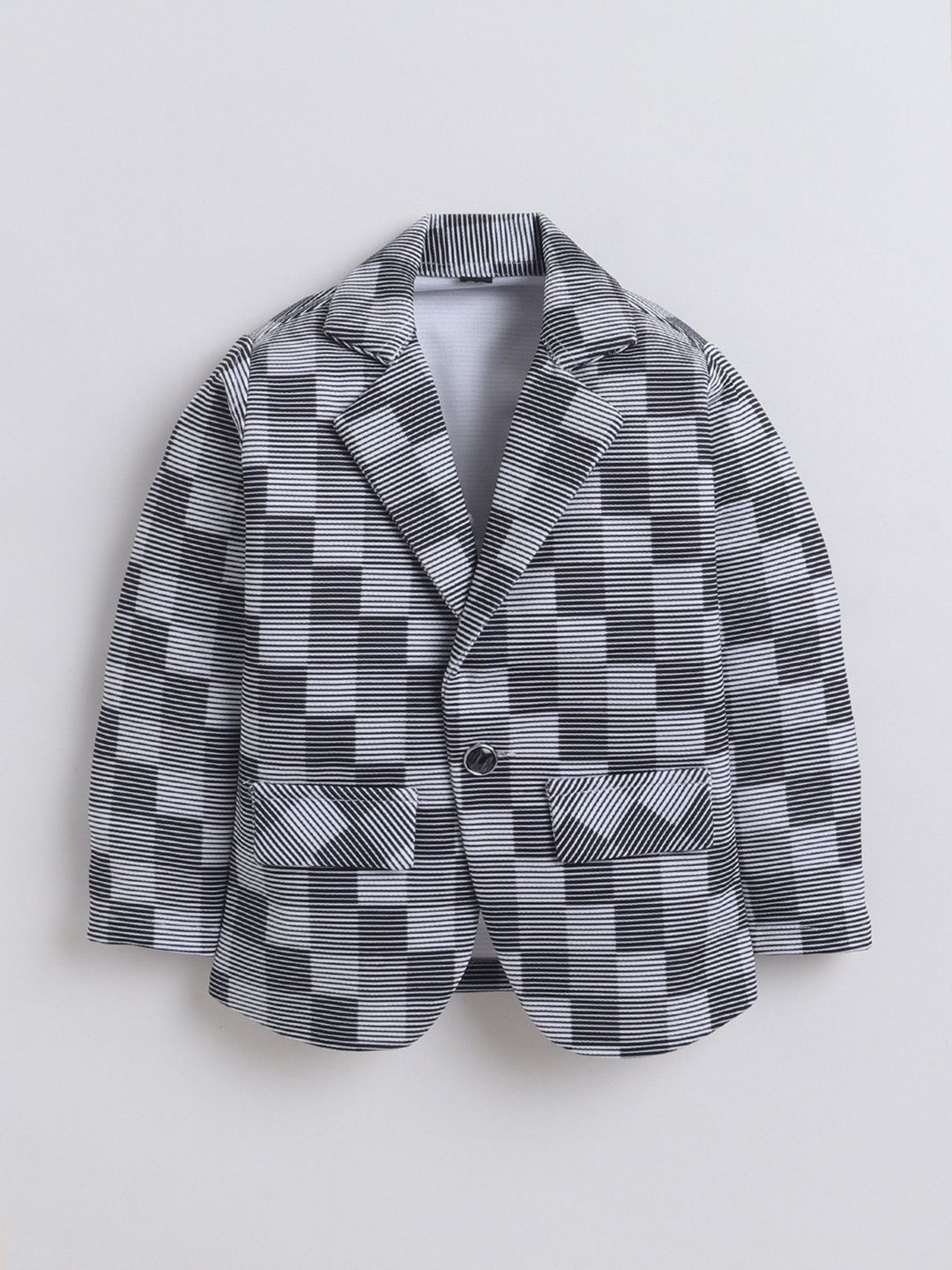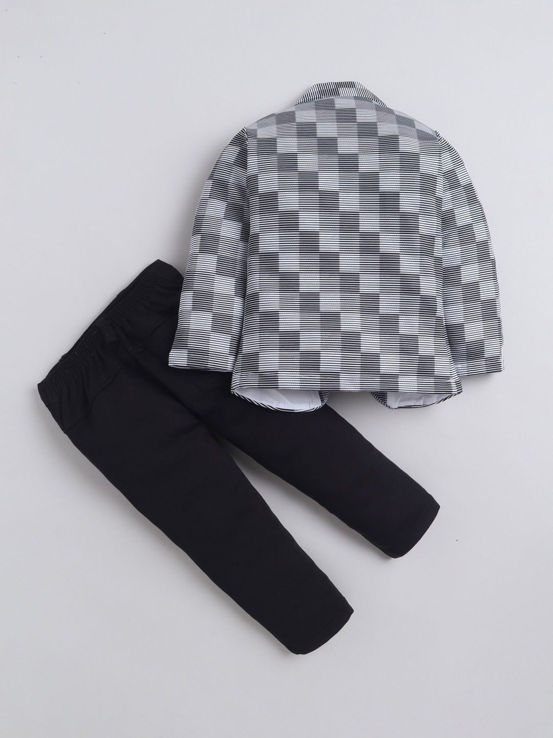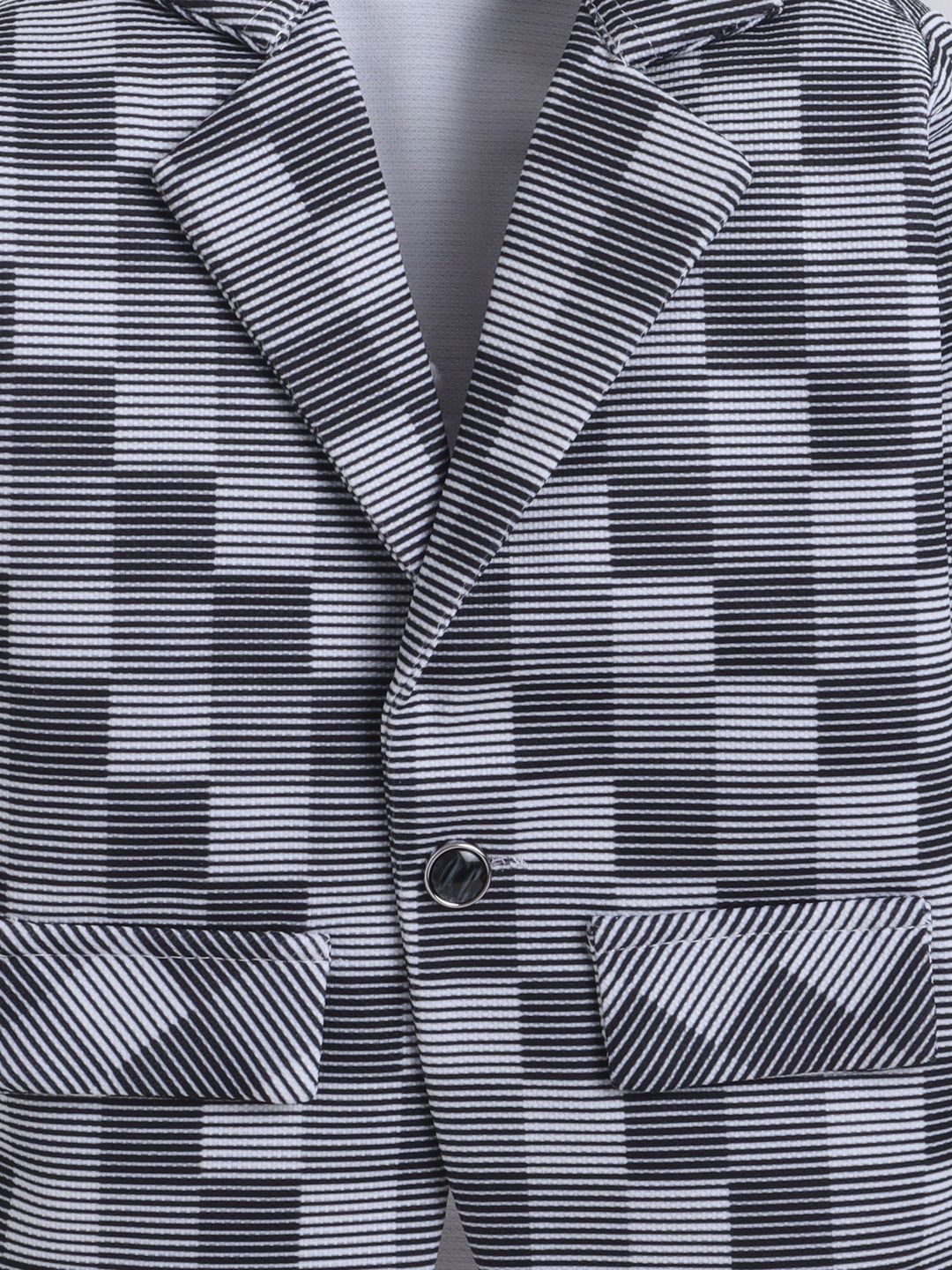 Charcoal checked three-piece suitCharcoal checked single-breasted blazer, has a notched lapel with button closures, long sleevesWhite printed t-shirt has round neck and sleevelessA pair of black solid mid-rise trousers, has a waistband and a slip-on closure