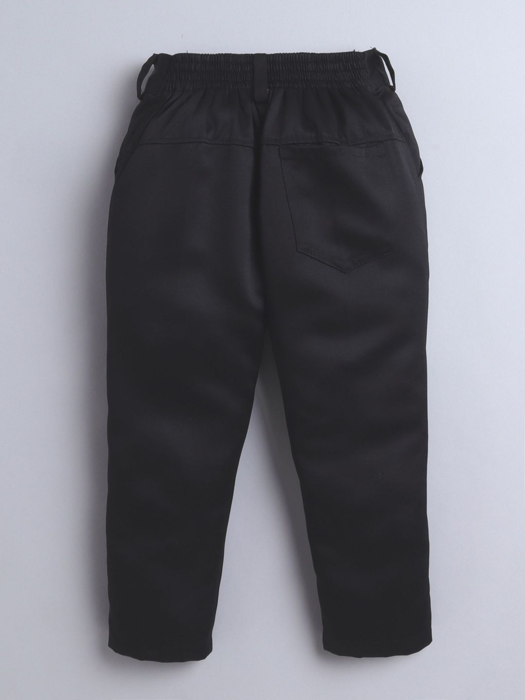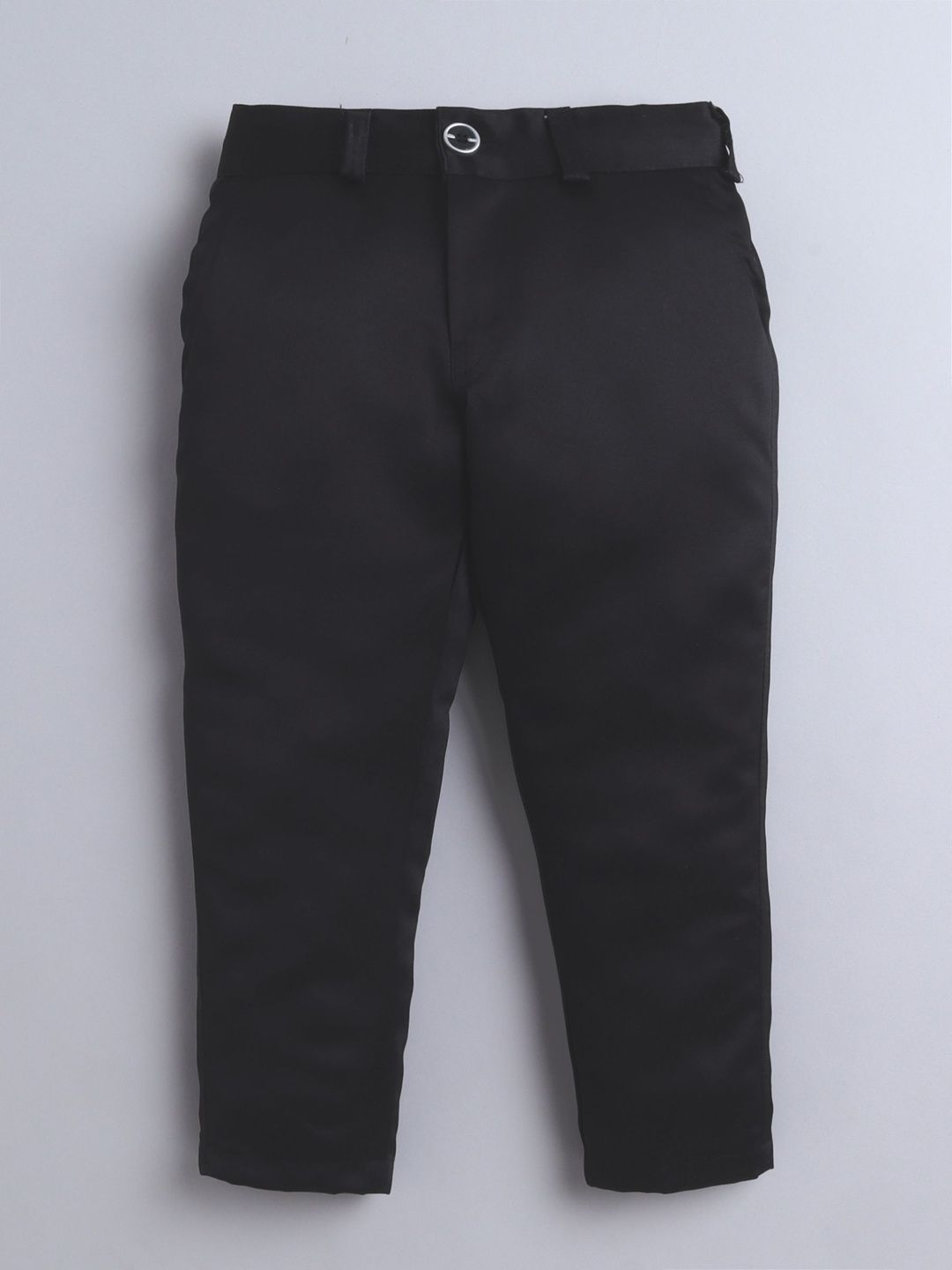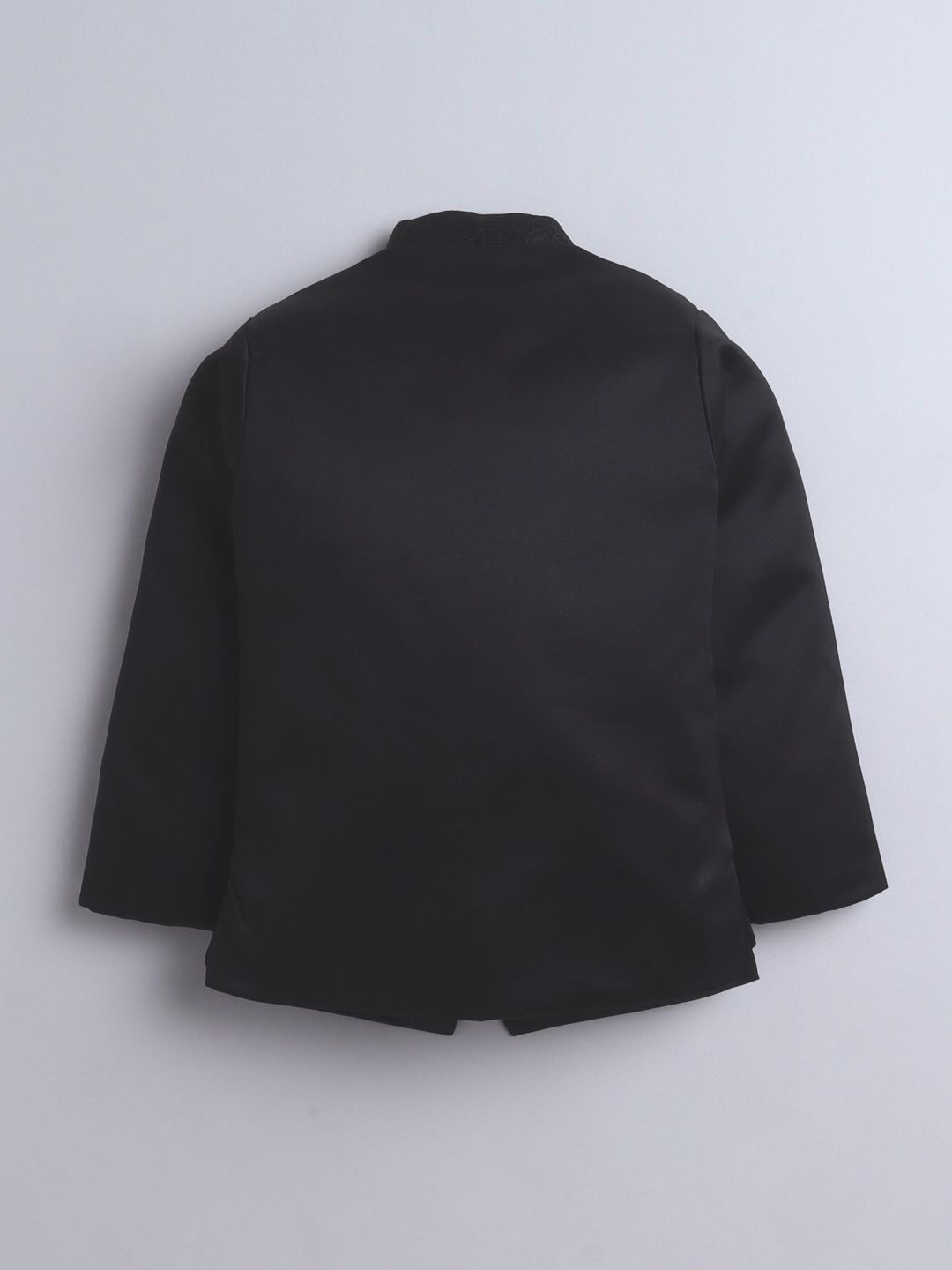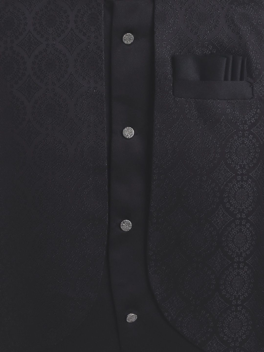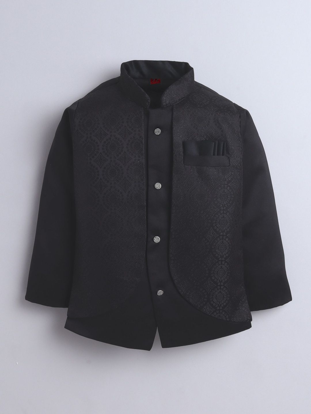 Black party suit with blazers and trousersBlack jacquard geometric circular motifs regular-fit blazer, has a mandarin collar with button closures, long sleeves, one welt pocket, and a ventless back hemBlack solid mid-rise trousers, has a Elastic waistband with button closure, 3 pockets