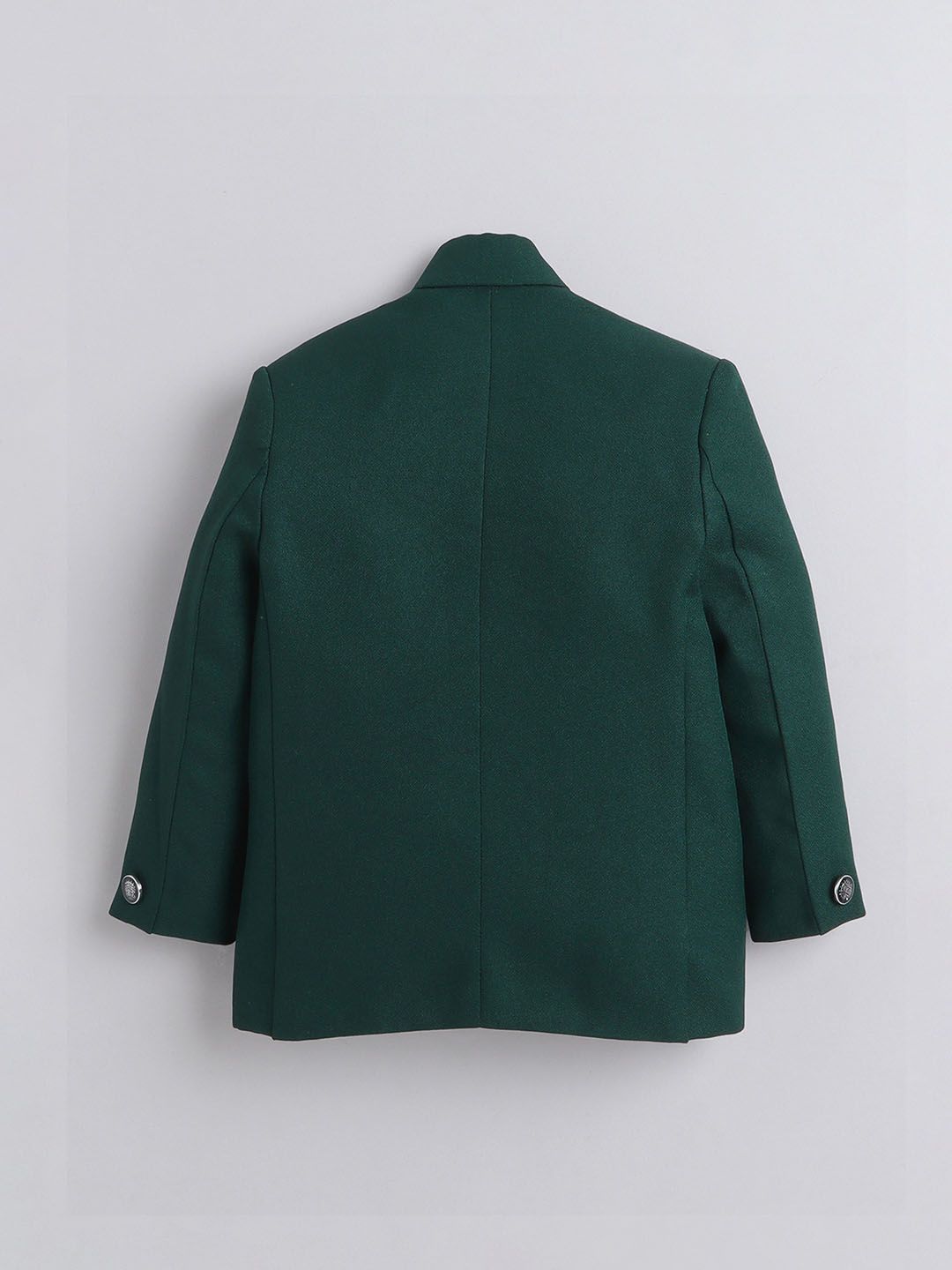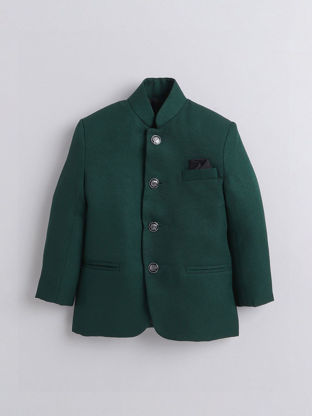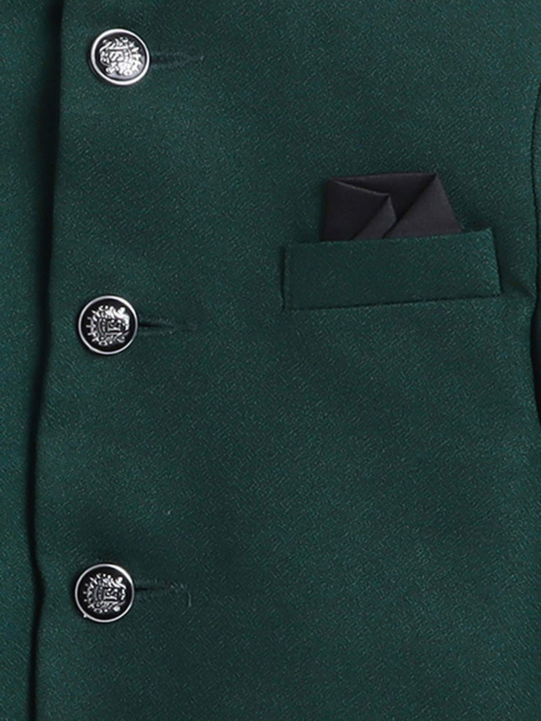 Green 2-piece suitGreen self-design regular-fit bandhgala jodhpuri coat has a mandarin collar with button closures, long sleeves, three pocketsBlack solid regular-fit trousers have a partially elasticated waistband with a button closure, zip fly and two pockets