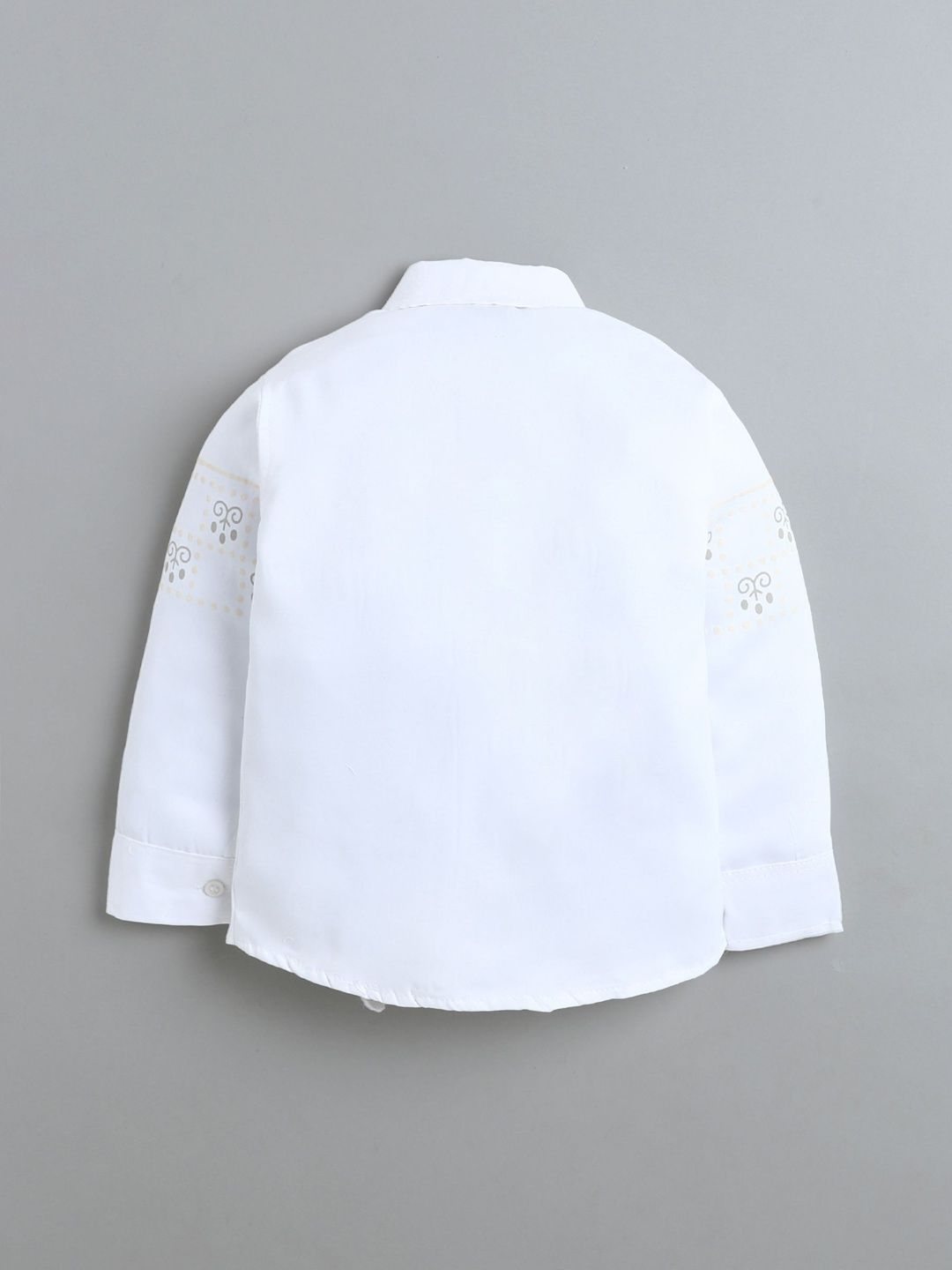 Grey party suit with waistcoat, shirt, and trousers with bowWhite printed regular-fit shirt, has a shirt collar, full placket button closures, long sleevesGrey solid mid-rise trousers, has a zip fly with a button and a hook-and-bar closure, 3 pockets, a waistband with belt loopsGrey embellished & embroidered waistcoat, has collarless, button closure, sleeveless, and two pocketsComes with matching bow