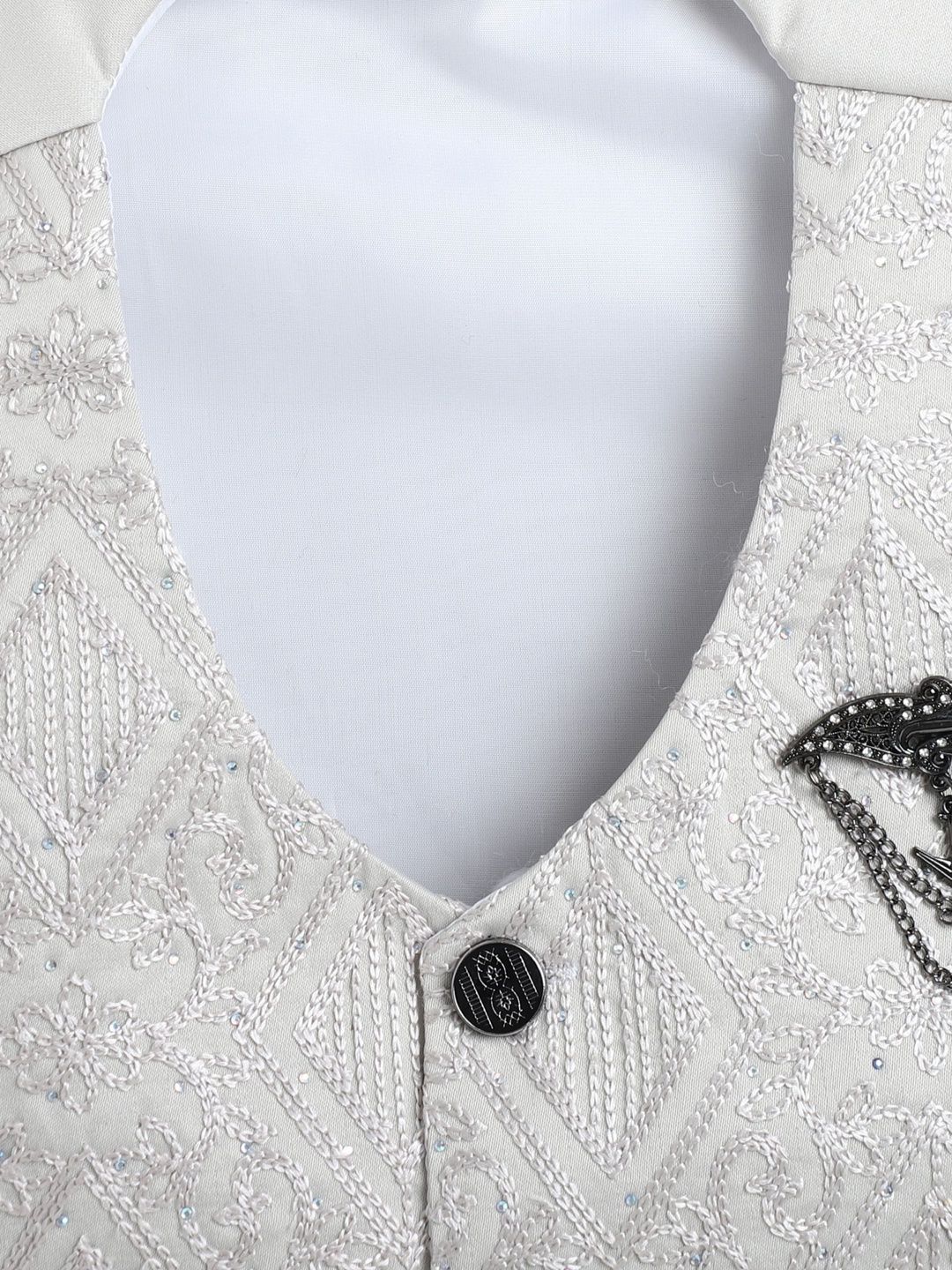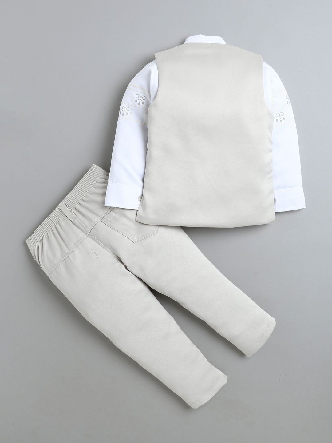 Grey self design regular-fit four-piece party suitGrey self-design waistcoat, has v-neck, full placket button closure, sleevelessGrey solid regular-fit mid-rise trousers, has a waistband with belt loops, a zip fly and a button closure, and four pocketsWhite solid shirt has, shirt collar neck long sleeves, button closureComes with matching bow tie