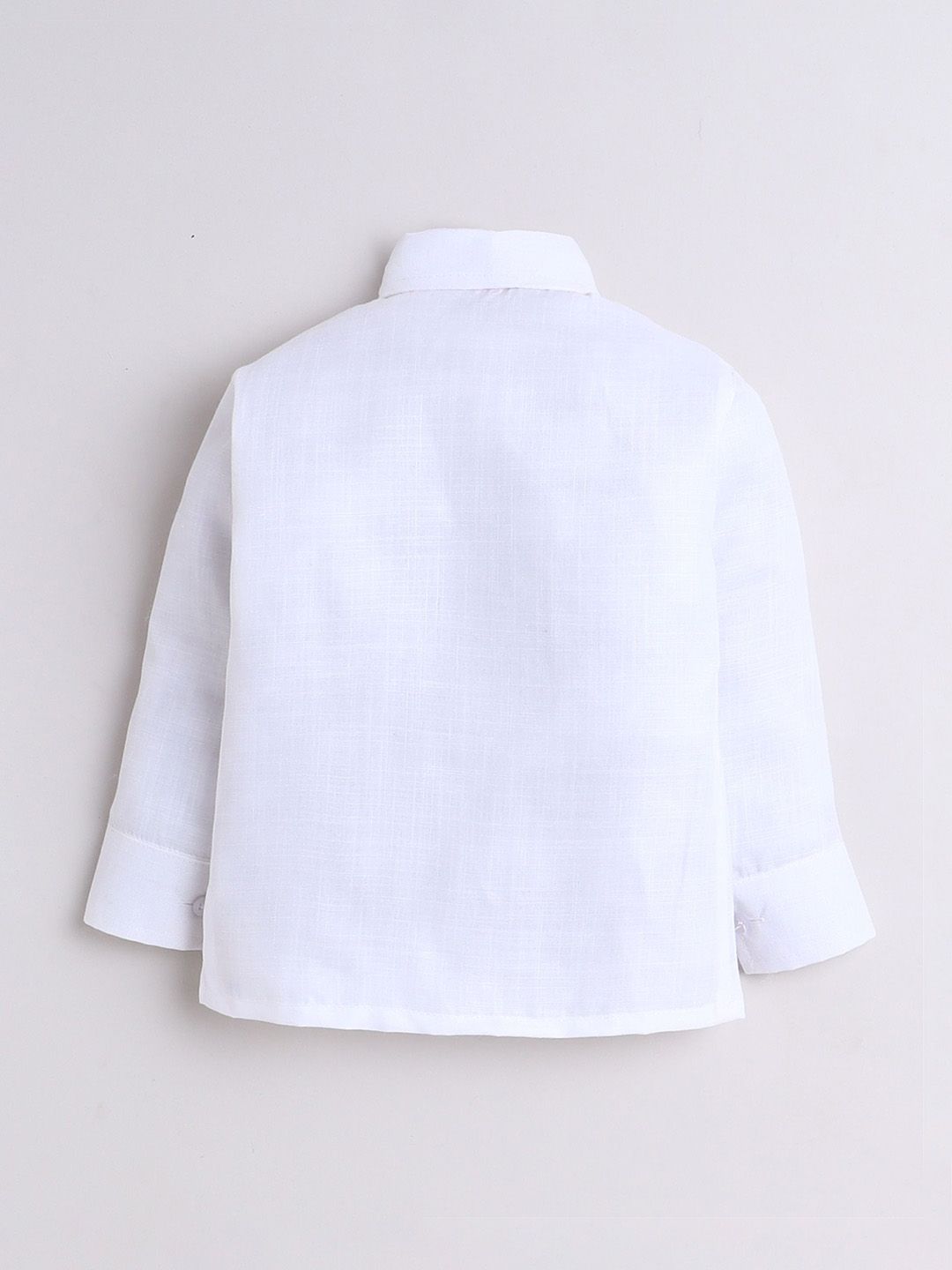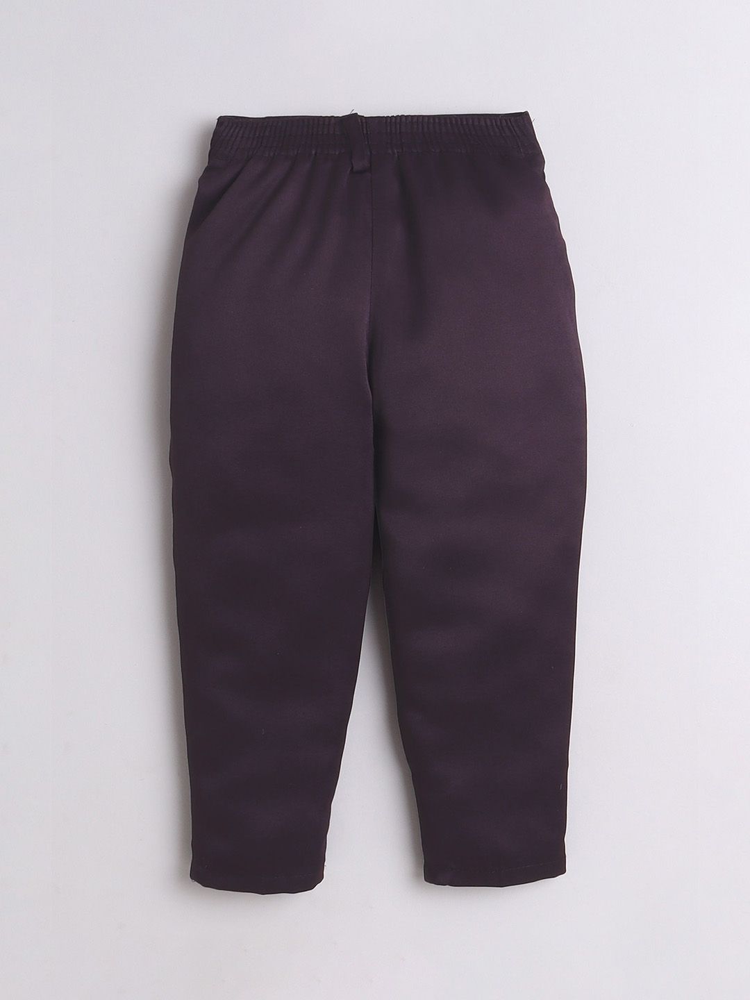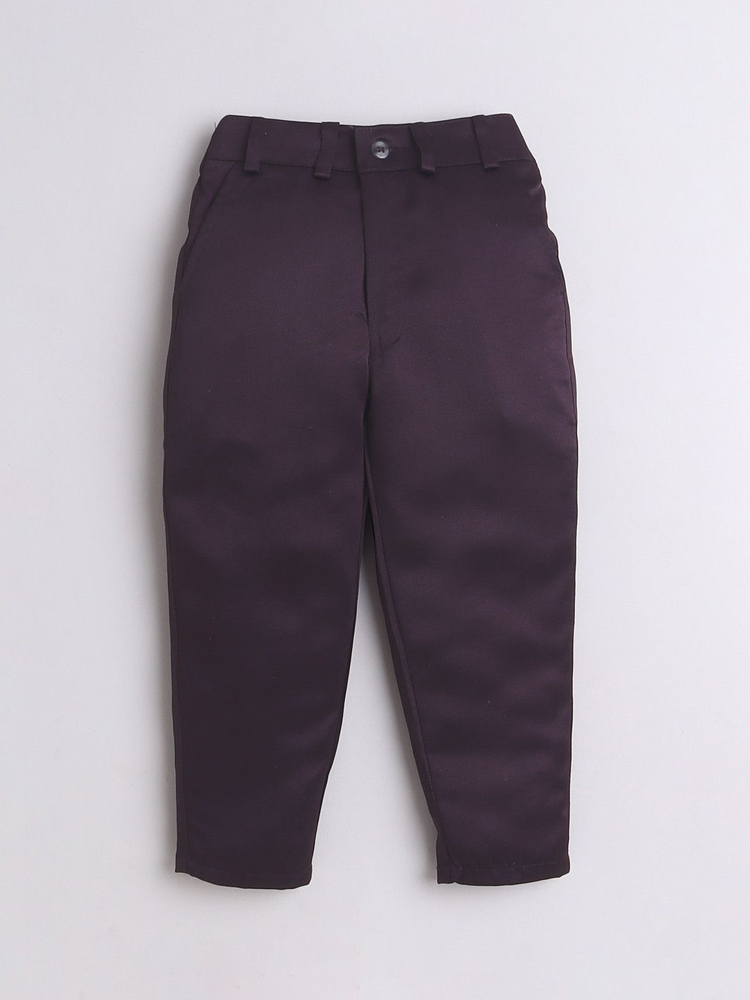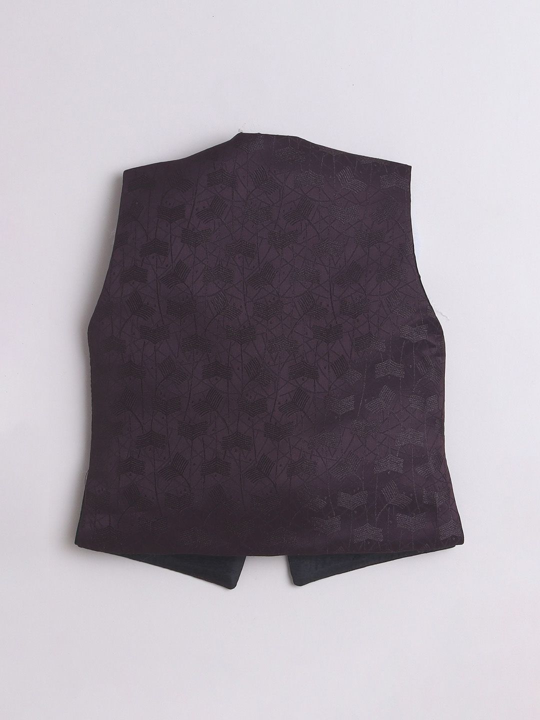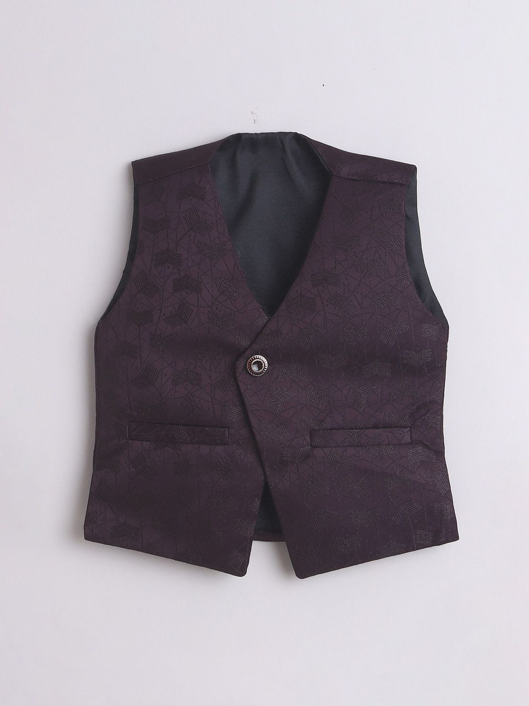 Burgundy self design suit with waistcoat, shirt and trousersBurgundy self design single-breasted regular-fit waistcoat, has a V-neck, button closures on the front, and two pocketsBurgundy solid mid-rise trousers, has a zip fly with a button closure, tow pockets, a waistband with belt loops White solid shirt, has a collar, a full button placket, long sleevesComes with bowtie