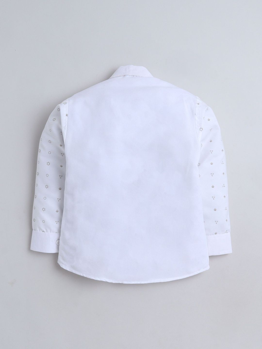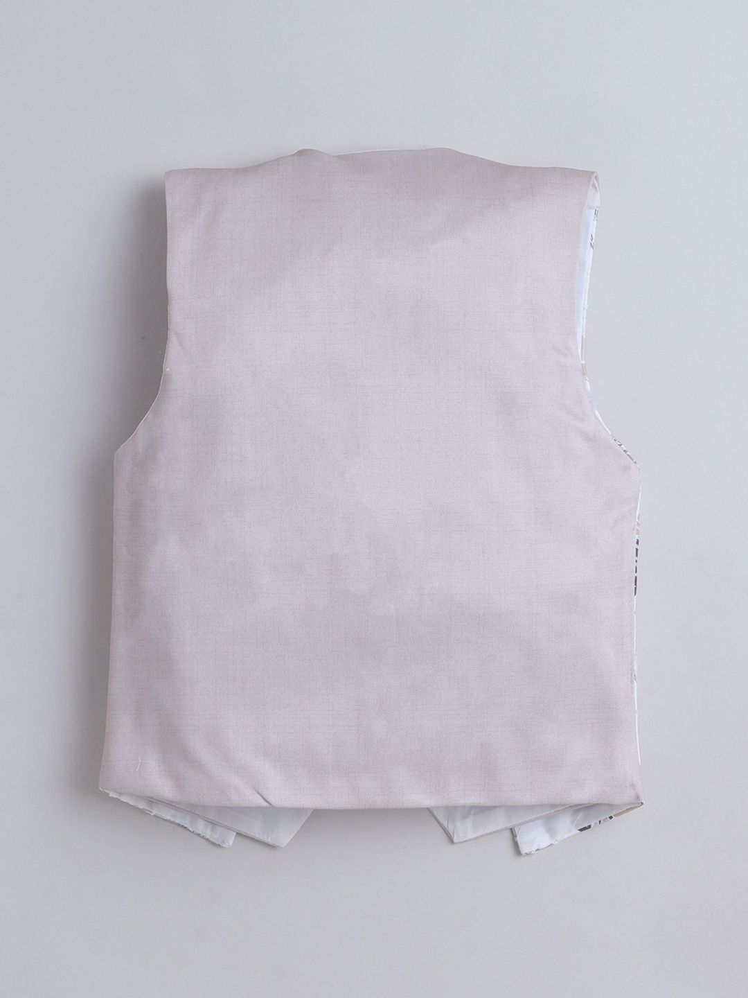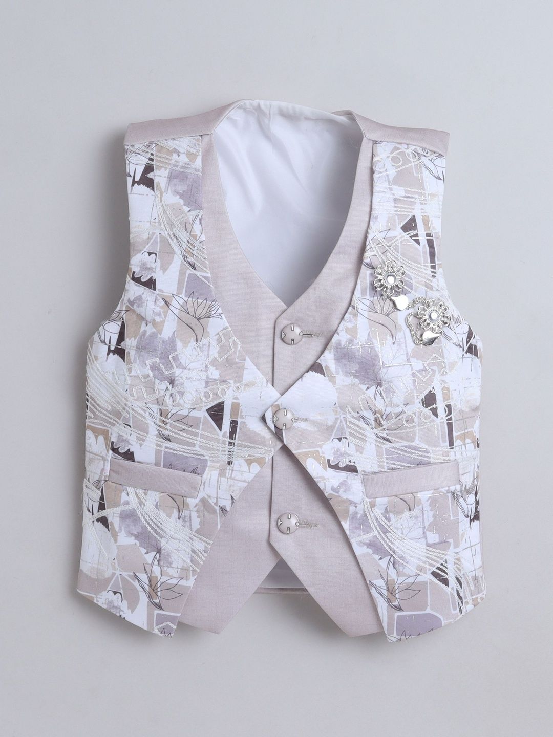 Grey party suit with waistcoat, shirt, and trousers with bowWhite printed regular-fit shirt, has a shirt collar, full placket button closures, long sleevesGrey solid mid-rise trousers, has a zip fly with a button and a hook-and-bar closure, 3 pockets, a waistband with belt loopsGrey abstract print with embroidered waistcoat, has a collarless, a full button placket, sleeveless, and two pocketComes with matching bow