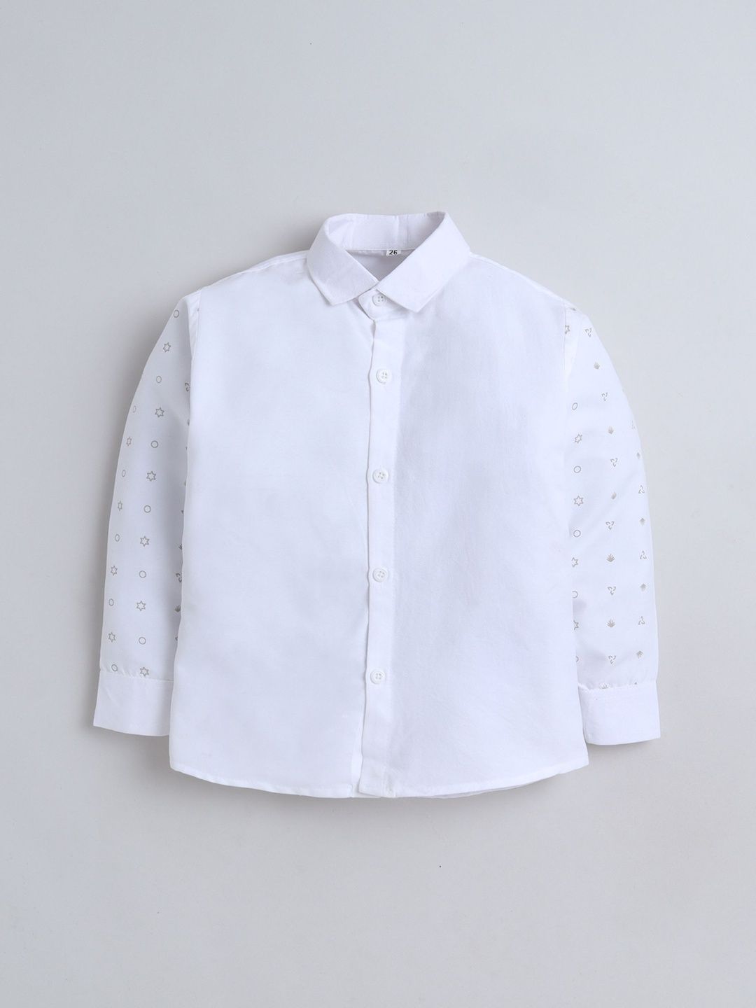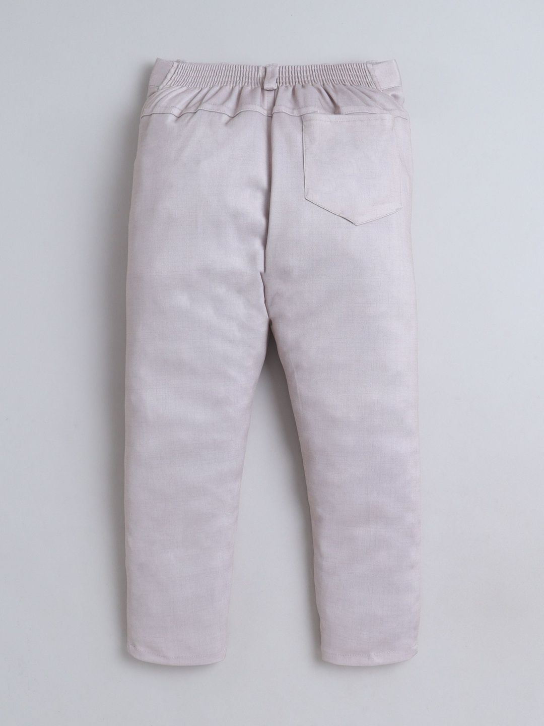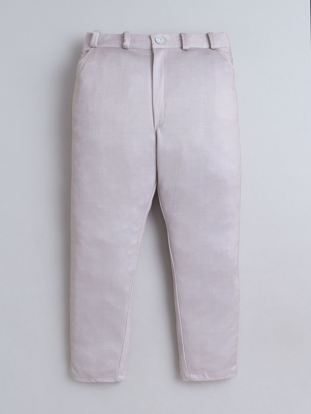 Grey party suit with waistcoat, shirt, and trousers with bowWhite printed regular-fit shirt, has a shirt collar, full placket button closures, long sleevesGrey solid mid-rise trousers, has a zip fly with a button and a hook-and-bar closure, 3 pockets, a waistband with belt loopsGrey abstract print with embroidered waistcoat, has a collarless, a full button placket, sleeveless, and two pocketComes with matching bow