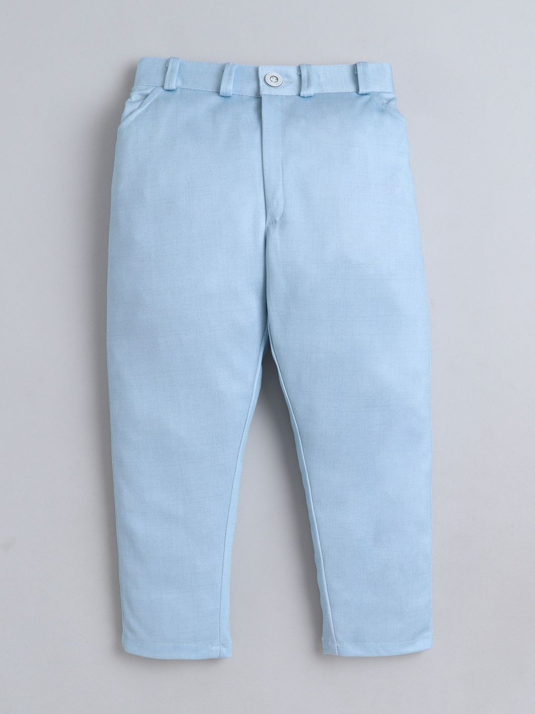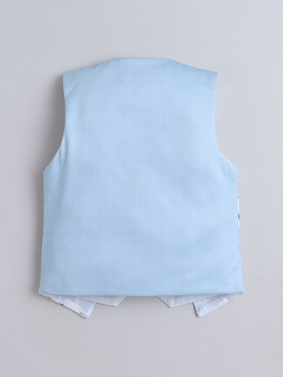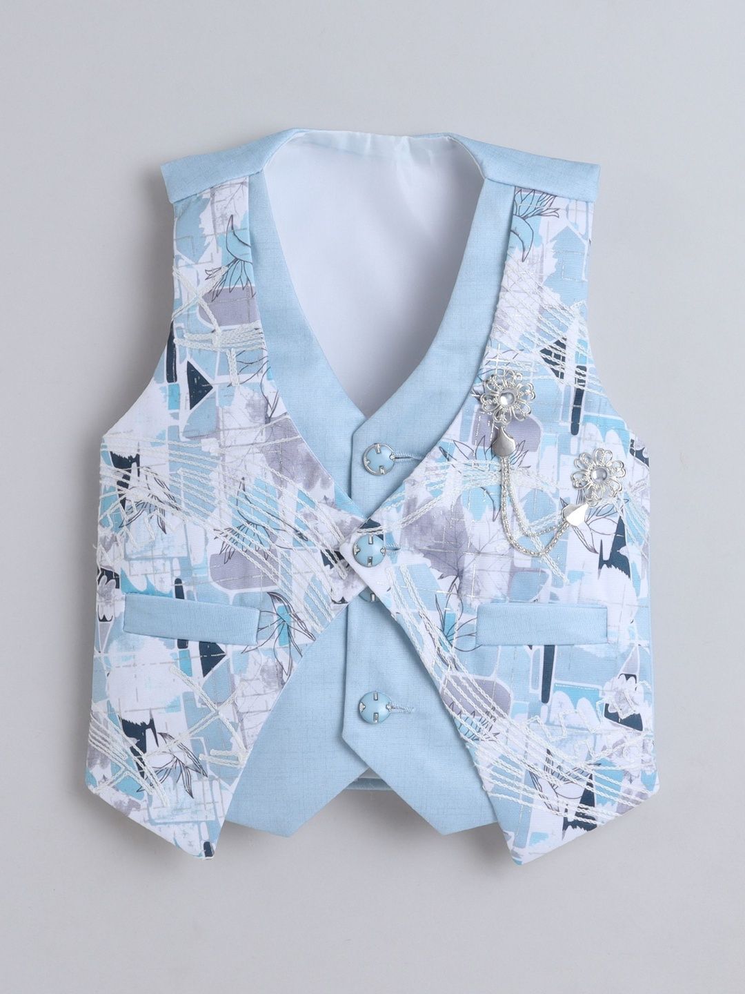 Blue abstract printed & embroidered suit with waistcoat, trousers shirt & bowBlue abstract printed with embroidered regular fit waistcoat has a V-neck sleeveless single breasted button closure with vent less backBlue solid mid-rise trousers, has a zip fly with a button closure, two pockets, a waistband with belt loopsWhite printed shirt has shirt collar, long sleeve with button closure Comes with a matching bow