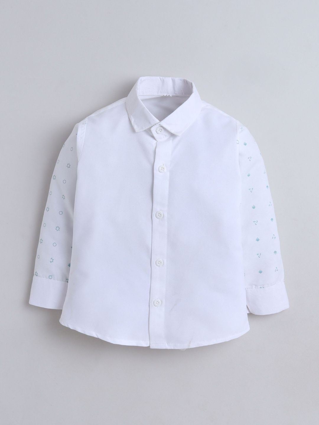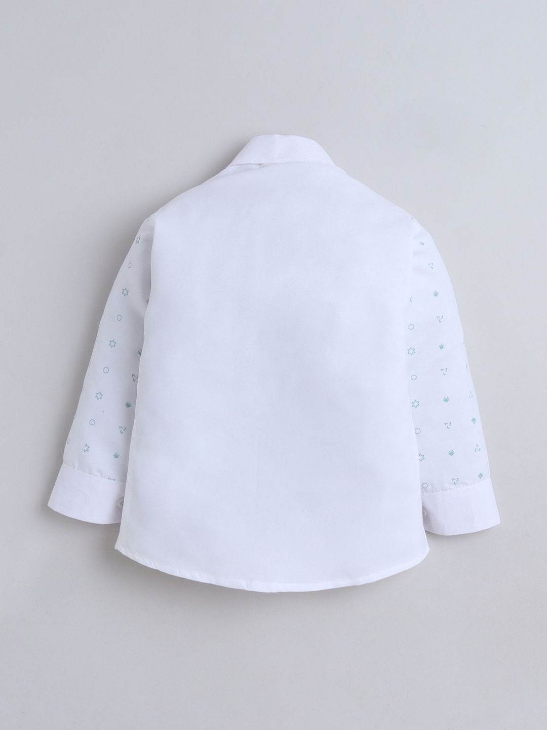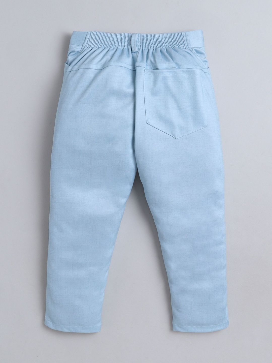 Blue abstract printed & embroidered suit with waistcoat, trousers shirt & bowBlue abstract printed with embroidered regular fit waistcoat has a V-neck sleeveless single breasted button closure with vent less backBlue solid mid-rise trousers, has a zip fly with a button closure, two pockets, a waistband with belt loopsWhite printed shirt has shirt collar, long sleeve with button closure Comes with a matching bow