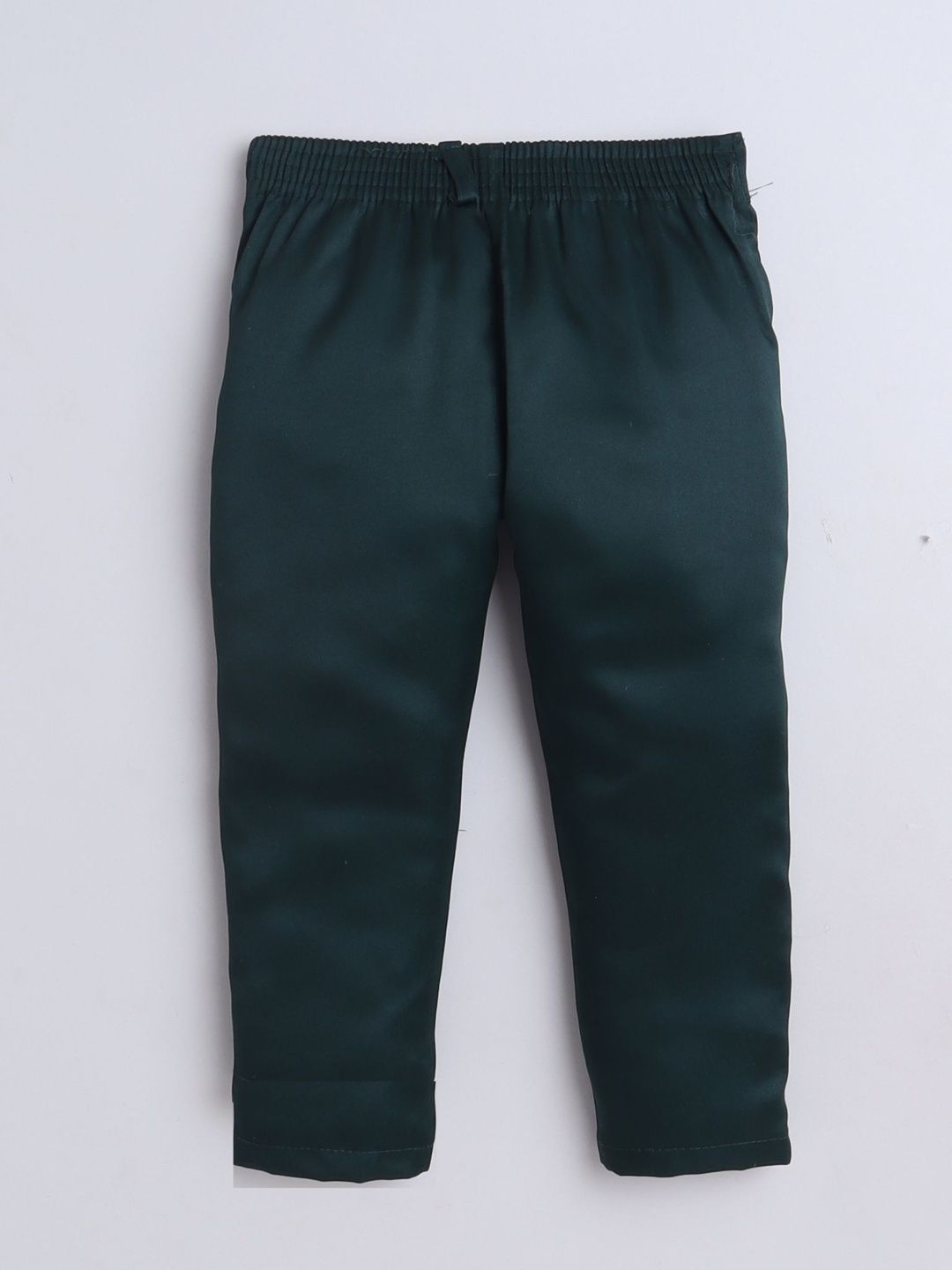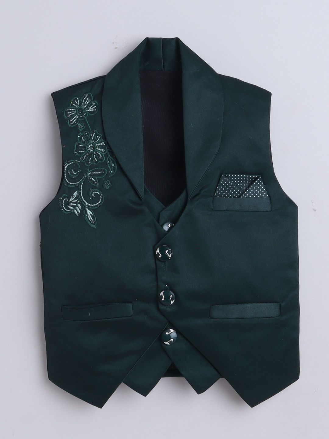 Green embroidered single-breasted regular-fit waistcoat, has a notched lapel collar neck, button closures on the front, and three pocketsA pair of green solid regular-fit mid-rise trousers, has a waistband with belt loops, a zip fly and a button closure, and four pocketsWhite printed regular-fit shirt, has a shirt collar, a full button placket, and long sleevesComes with a Bow