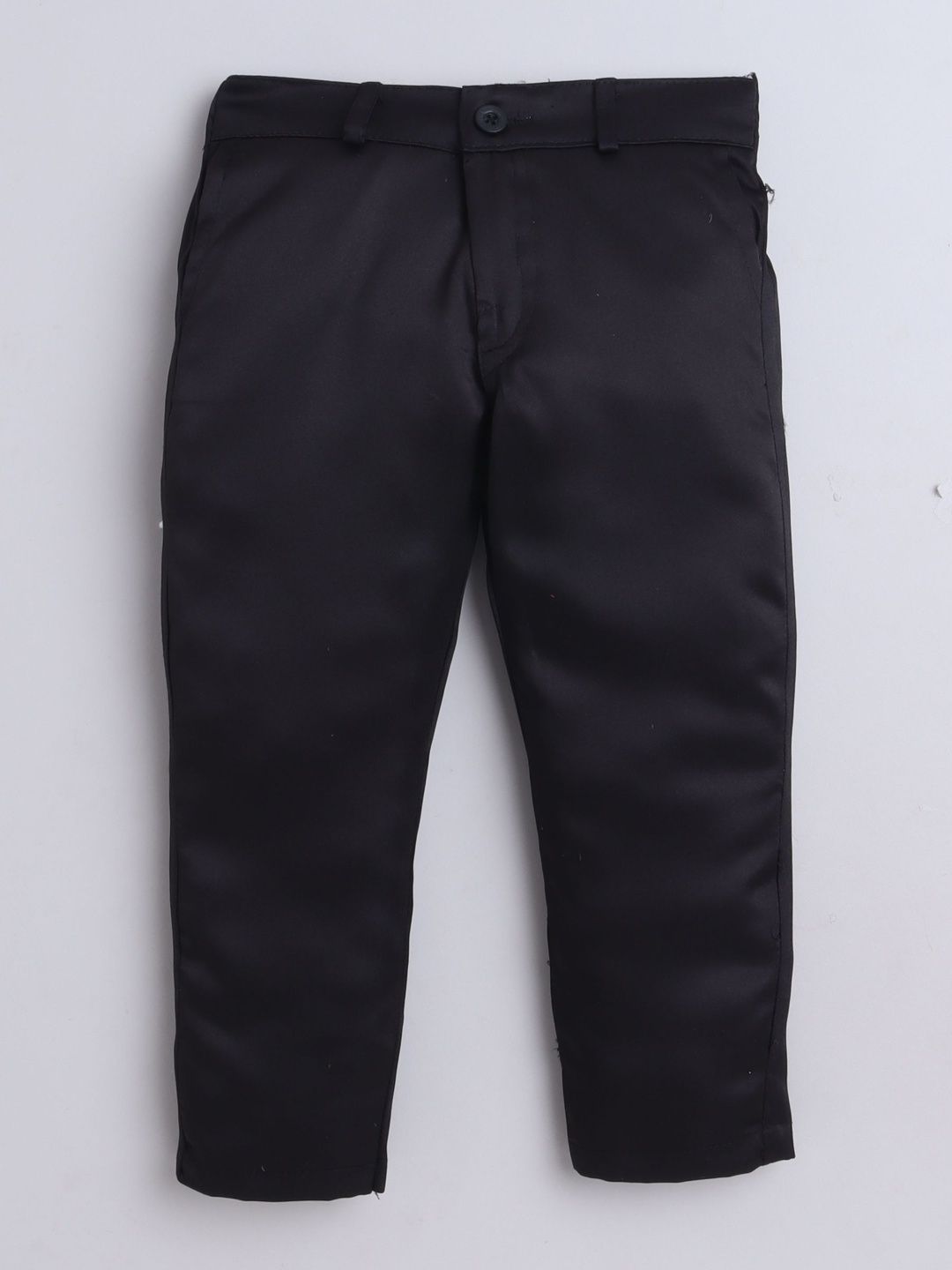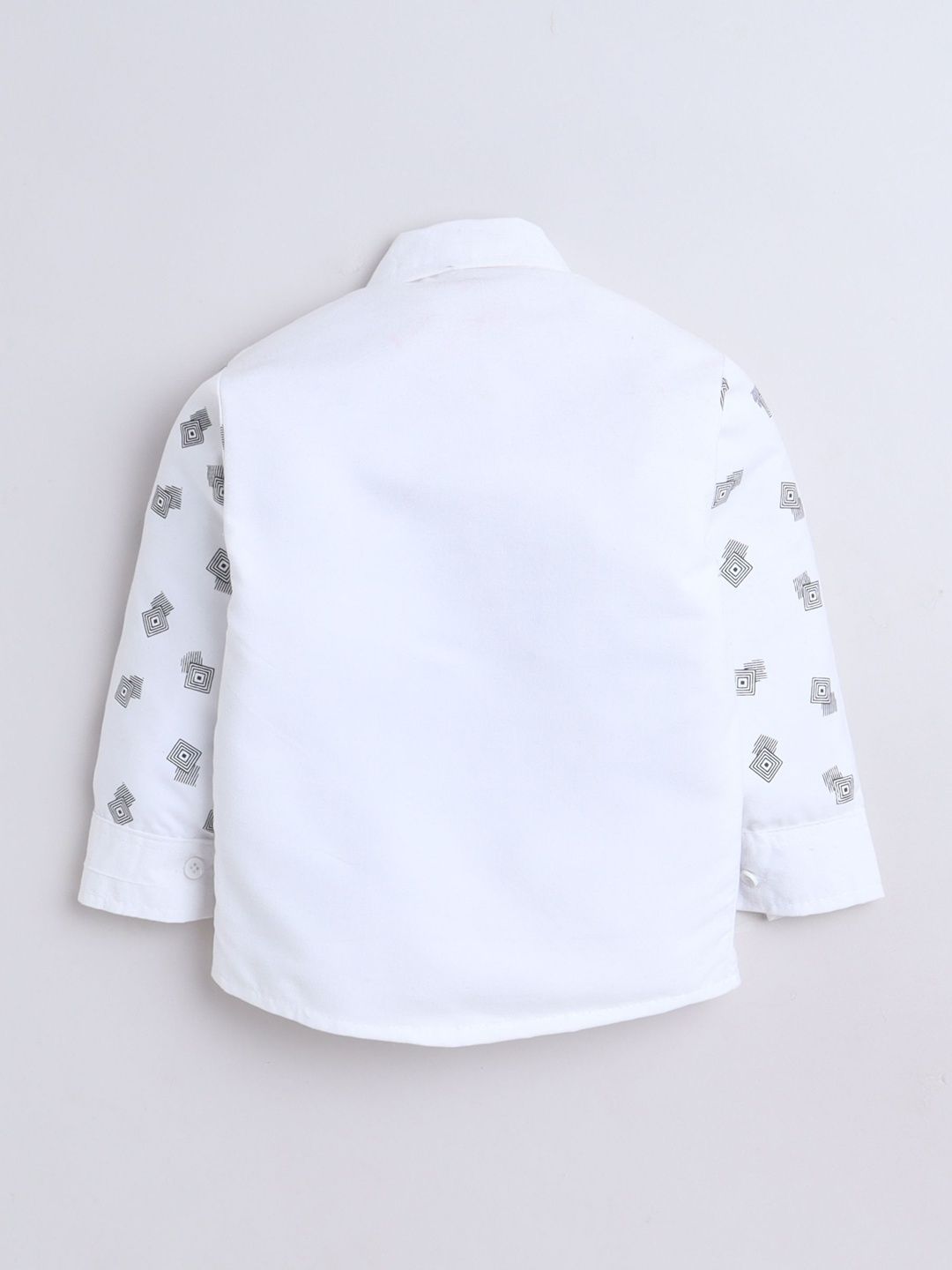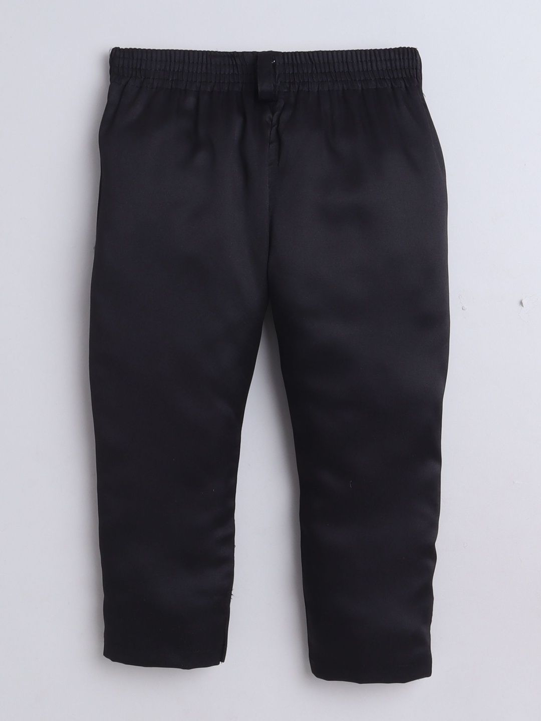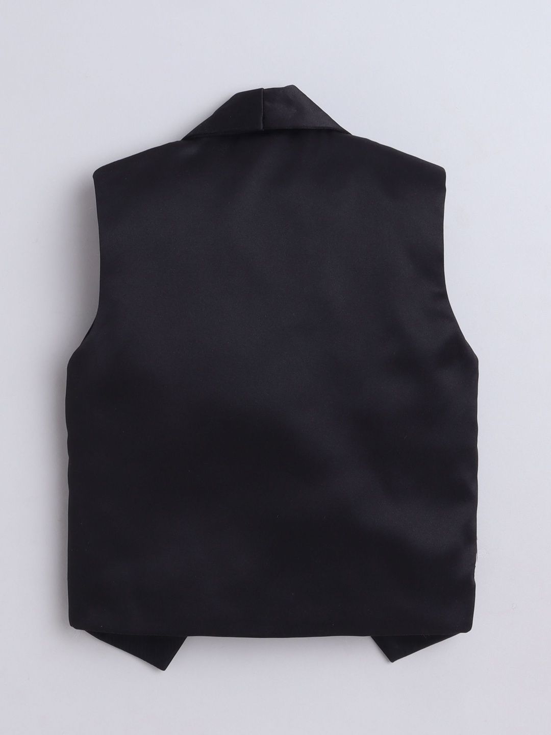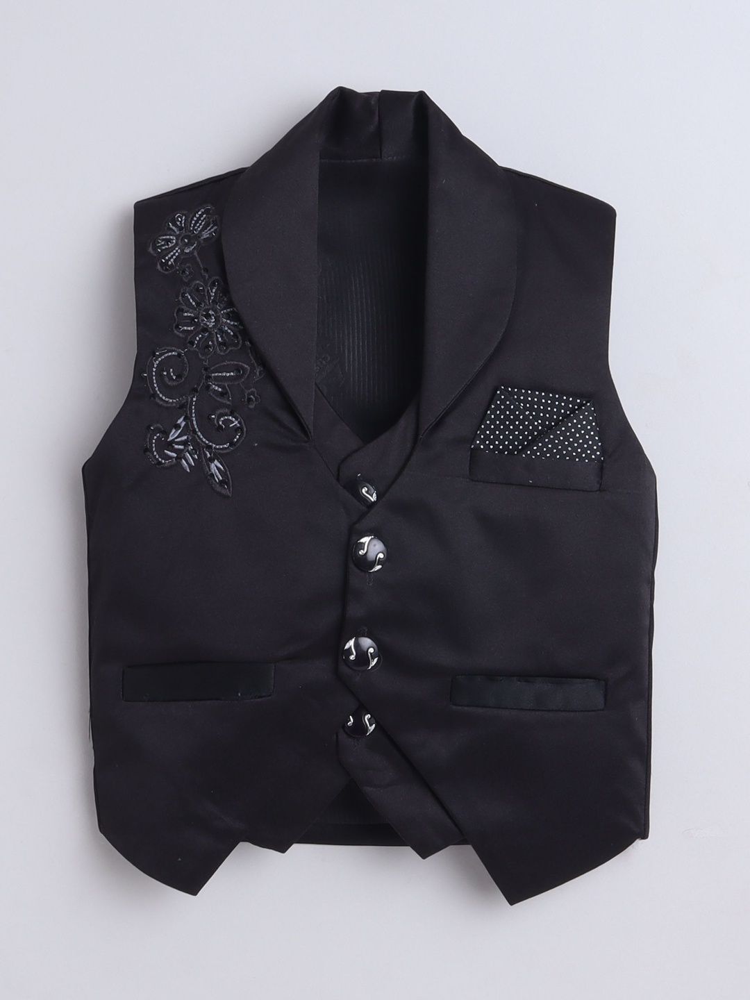 Black party suit with waistcoat, shirt, and trousersWhite printed regular-fit shirt, has a shirt collar, full placket button closures, long sleeves, Black solid mid-rise trousers, has a zip fly with a button and a hook-and-bar closure, 2 pockets, a waistband with belt loopsBlack embroidered waistcoat, has a shawl collar, a full button placket, sleeveless, and 2 pocketsComes with matching bow