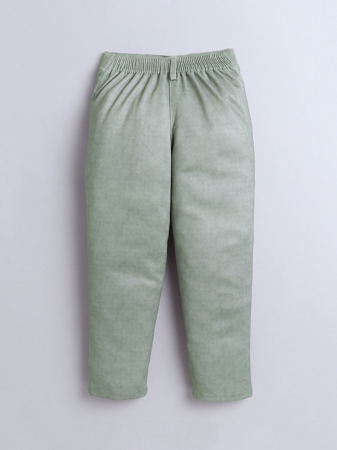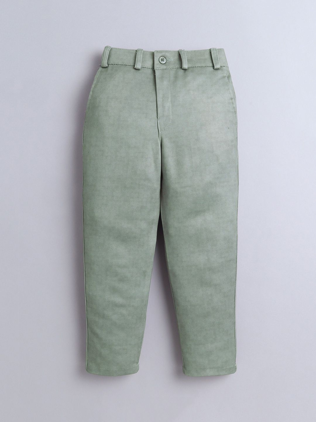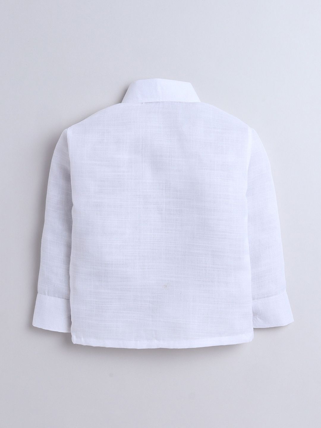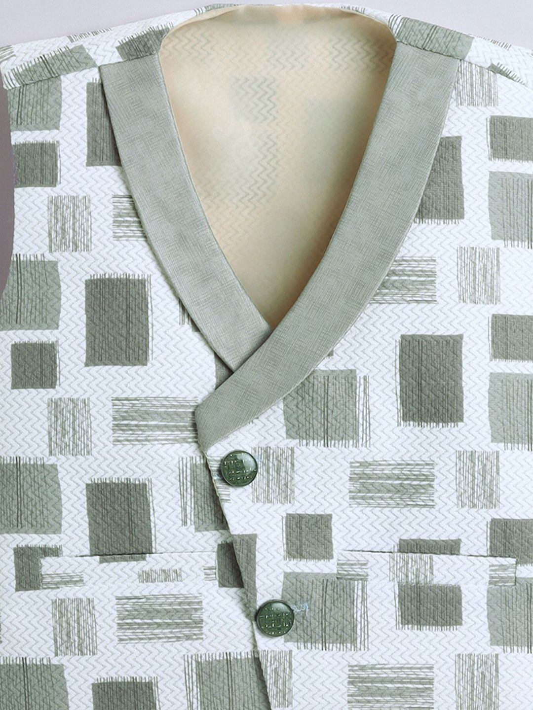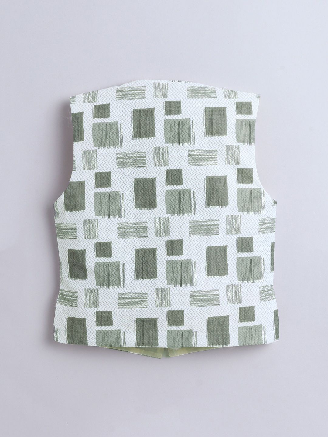 White and green printed regular-fit 3-piece suitWhite and green printed regular-fit waistcoat, has a shawl collar neck, button closures on the front, and two pocketsWhite solid shirt, has a shirt collar, a full button placket, and long sleevesGreen solid trousers, button closure, zip fly and two pocketsComes with a bow tie