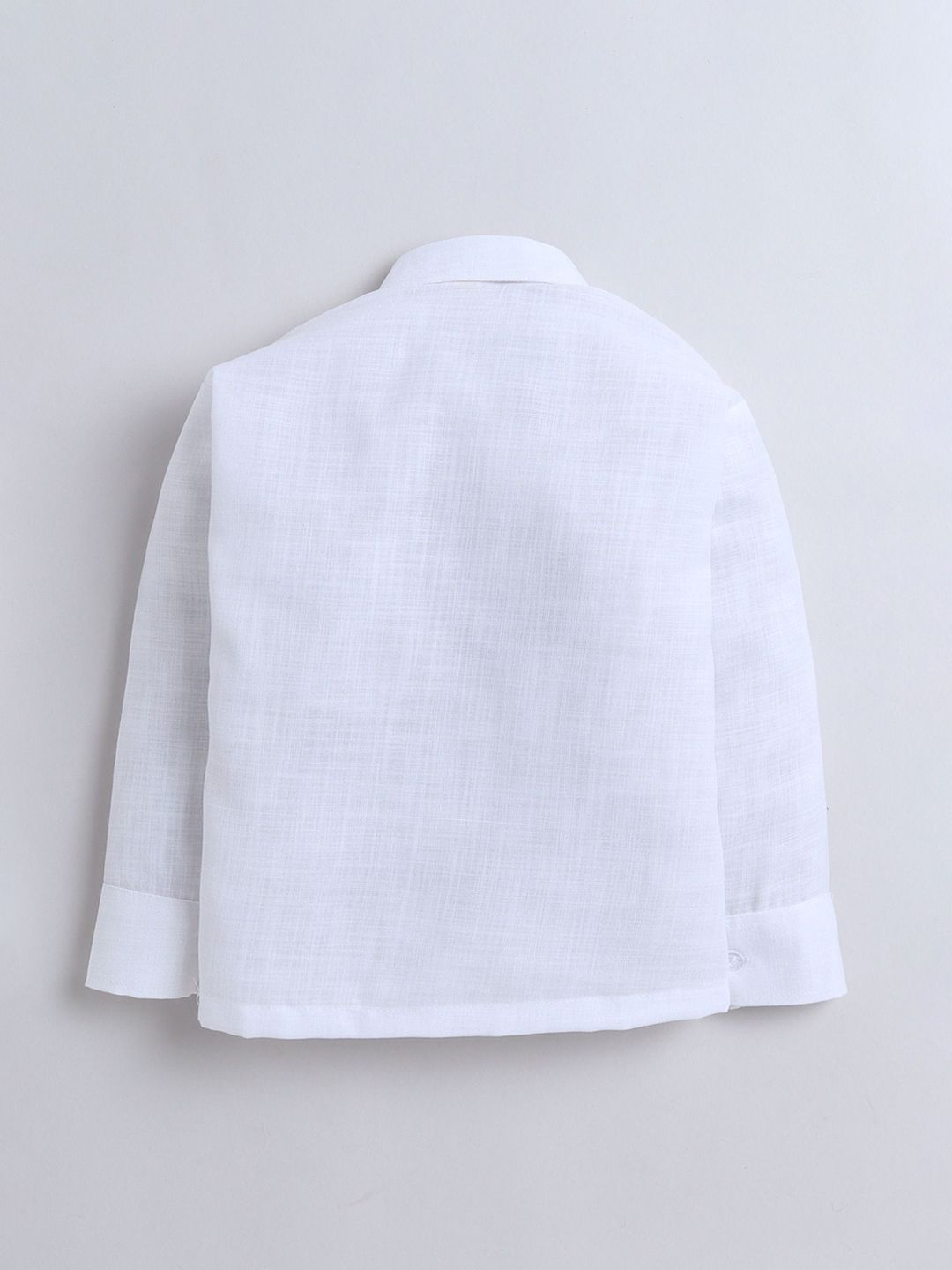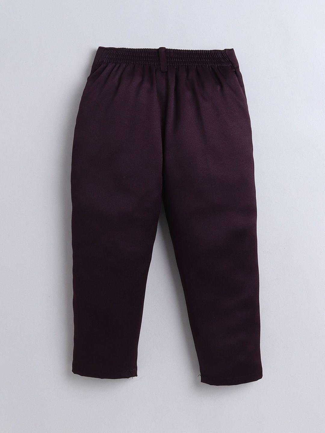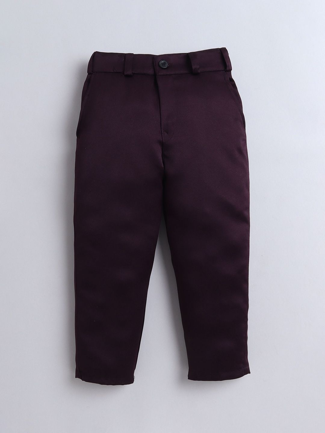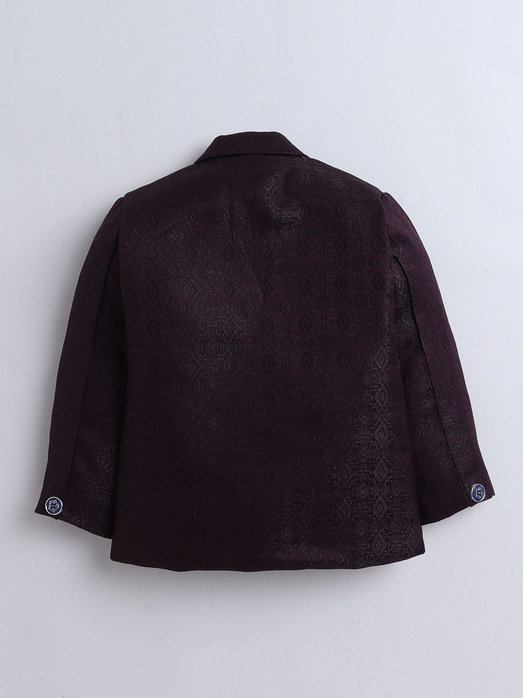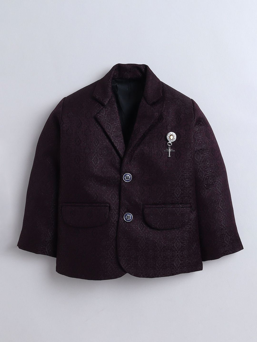 Burgundy regular-fit three-piece party suitBurgundy self-designed single-breasted blazer, has a notched lapel with button closures, long sleeves and two pocketsBurgundy solid trousers, has a waistband with belt loops, a zip fly and a button closure, and four pocketsWhite solid shirt has a shirt collar, long sleeves and front button closure