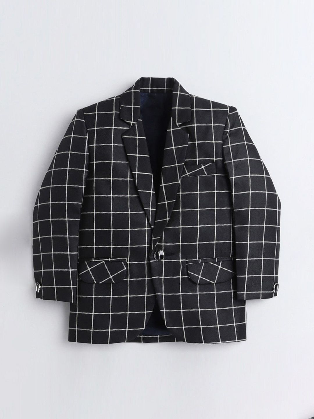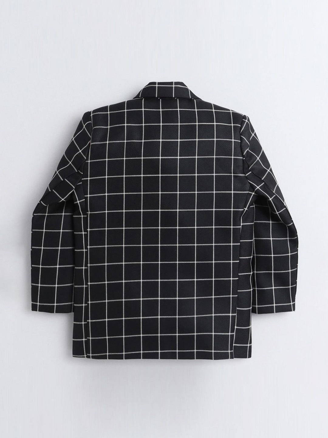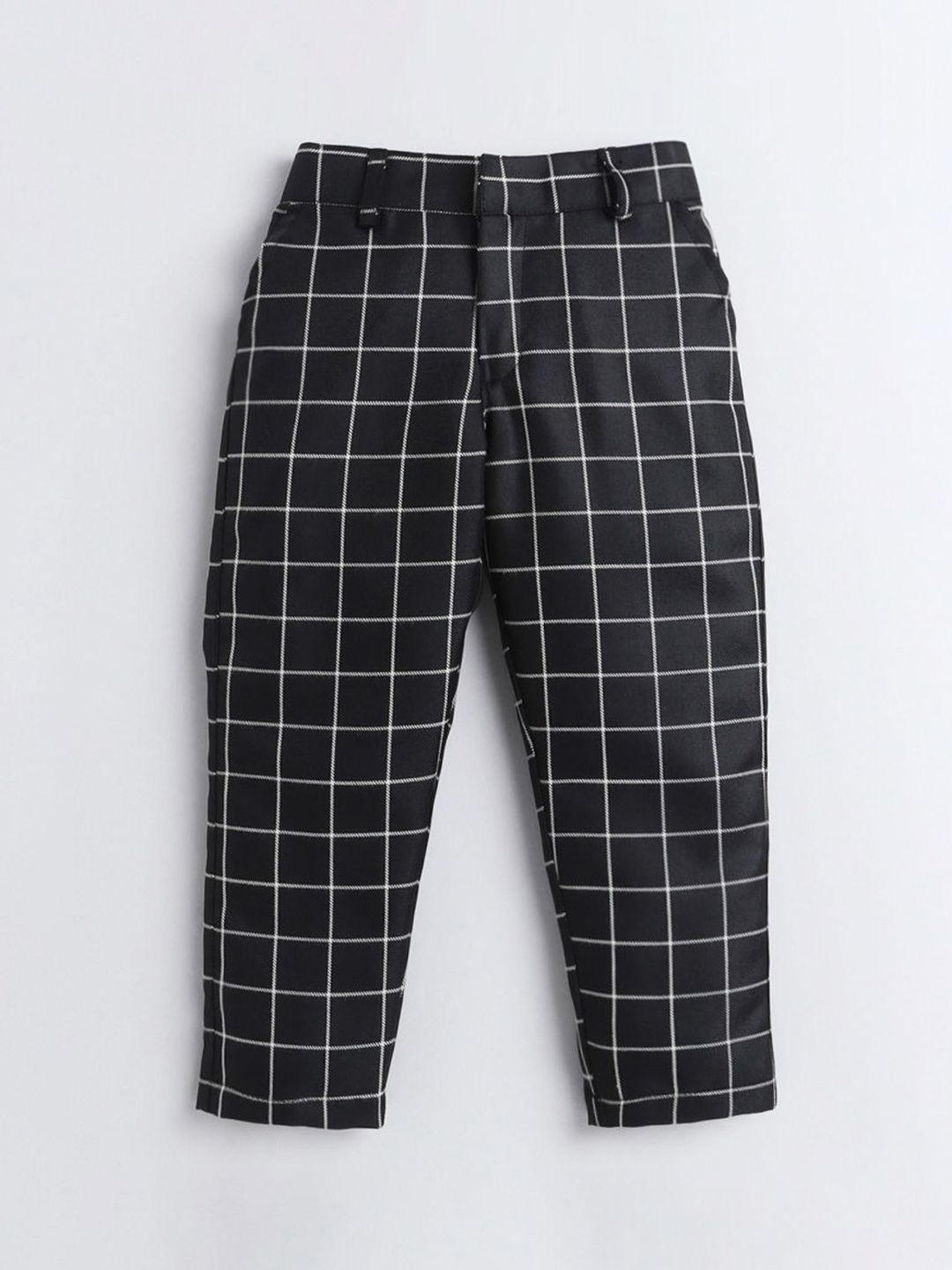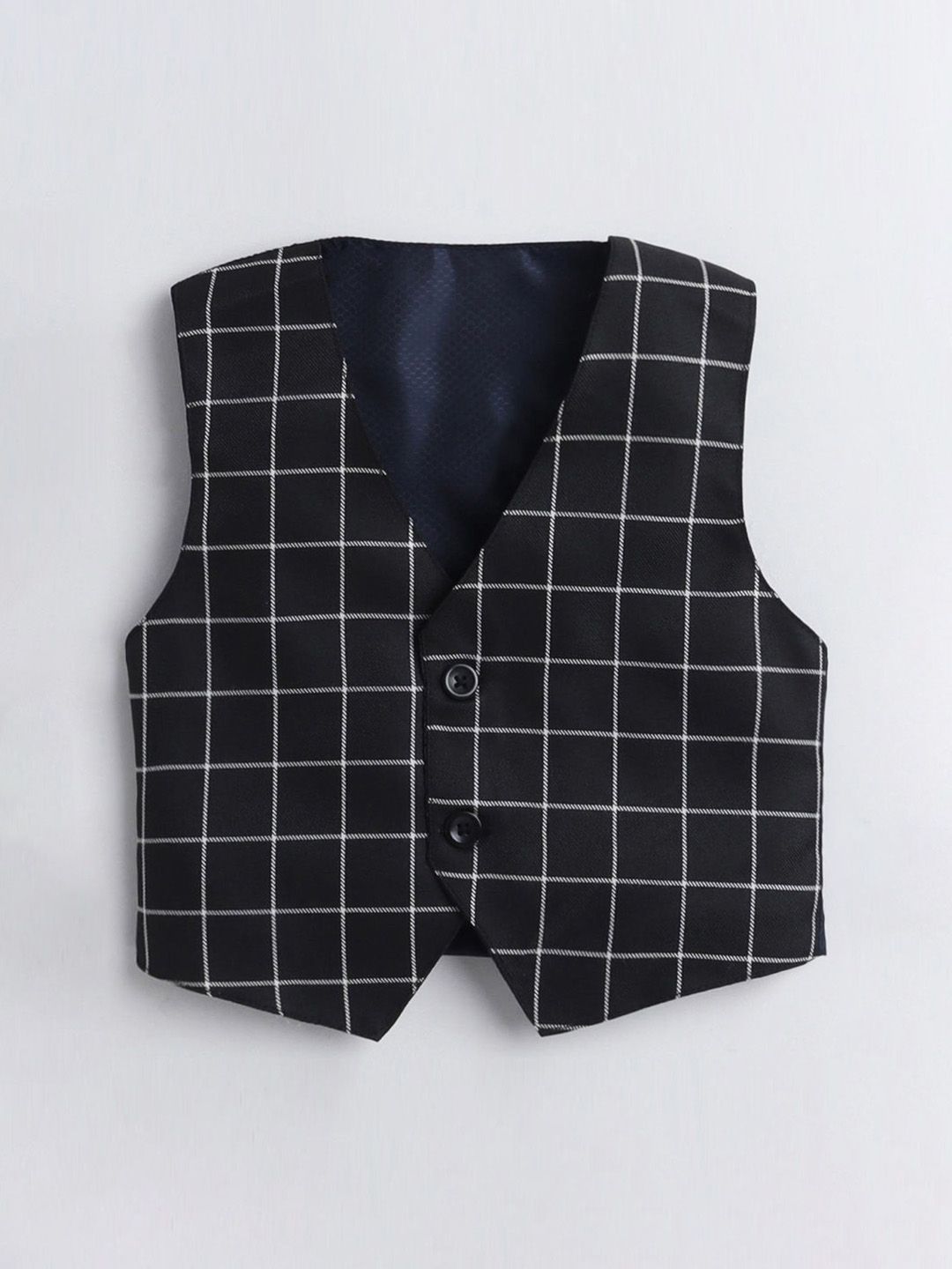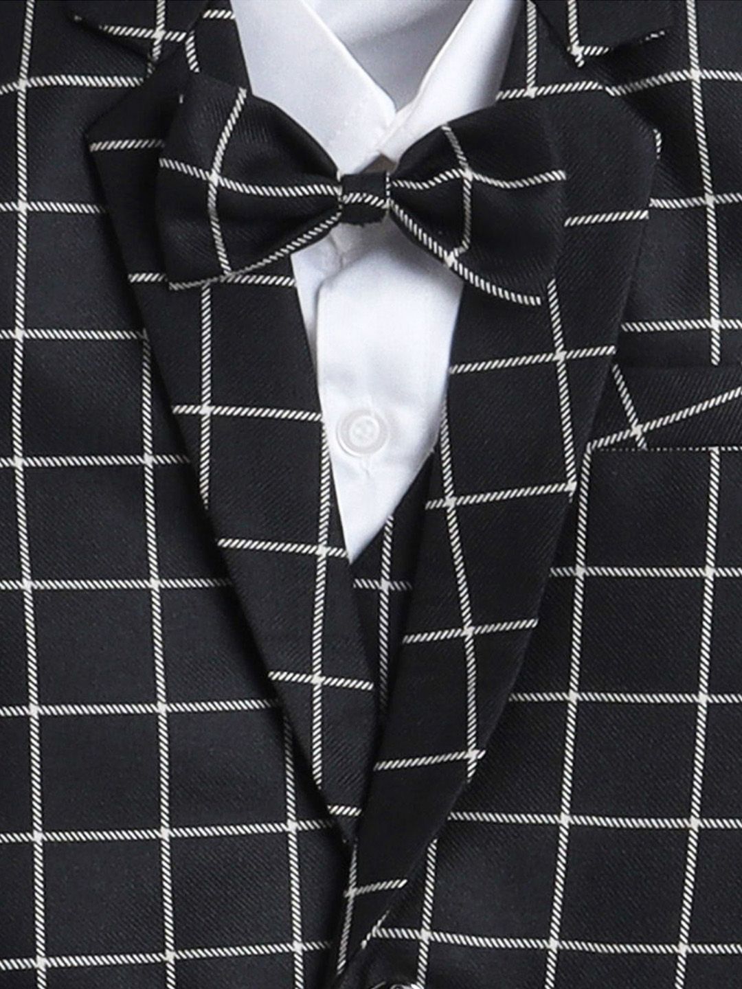Black party suit with waistcoat, shirt, blazers, and trousersBlack checked regular-fit blazer, has a notched lapel, single-breasted with double button closures, long sleeves, two flap pockets, and a vent less back hemBlack checked mid-rise trousers, has a zip fly with a button and a hook-and-bar closure, four pockets, a waistband with belt loopsBlack checked waistcoat, has a V neck, a full button placket, sleeveless, and three pocketsComes with a matching shirt & Bow