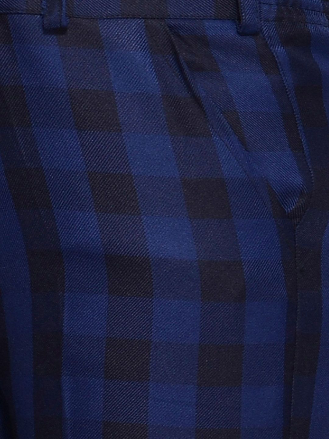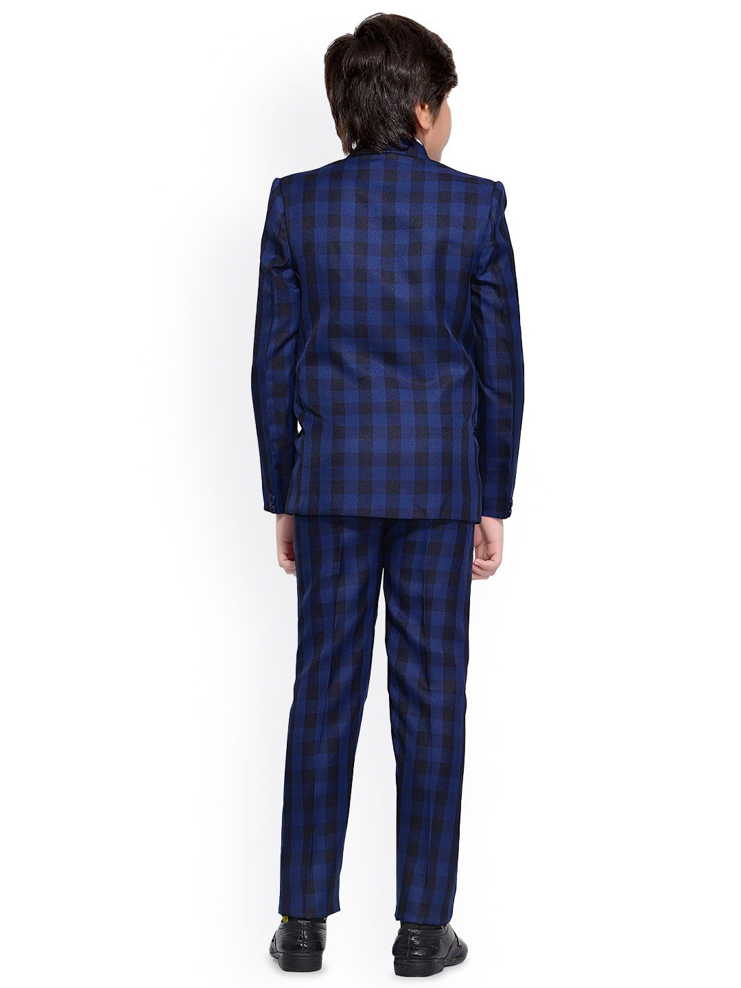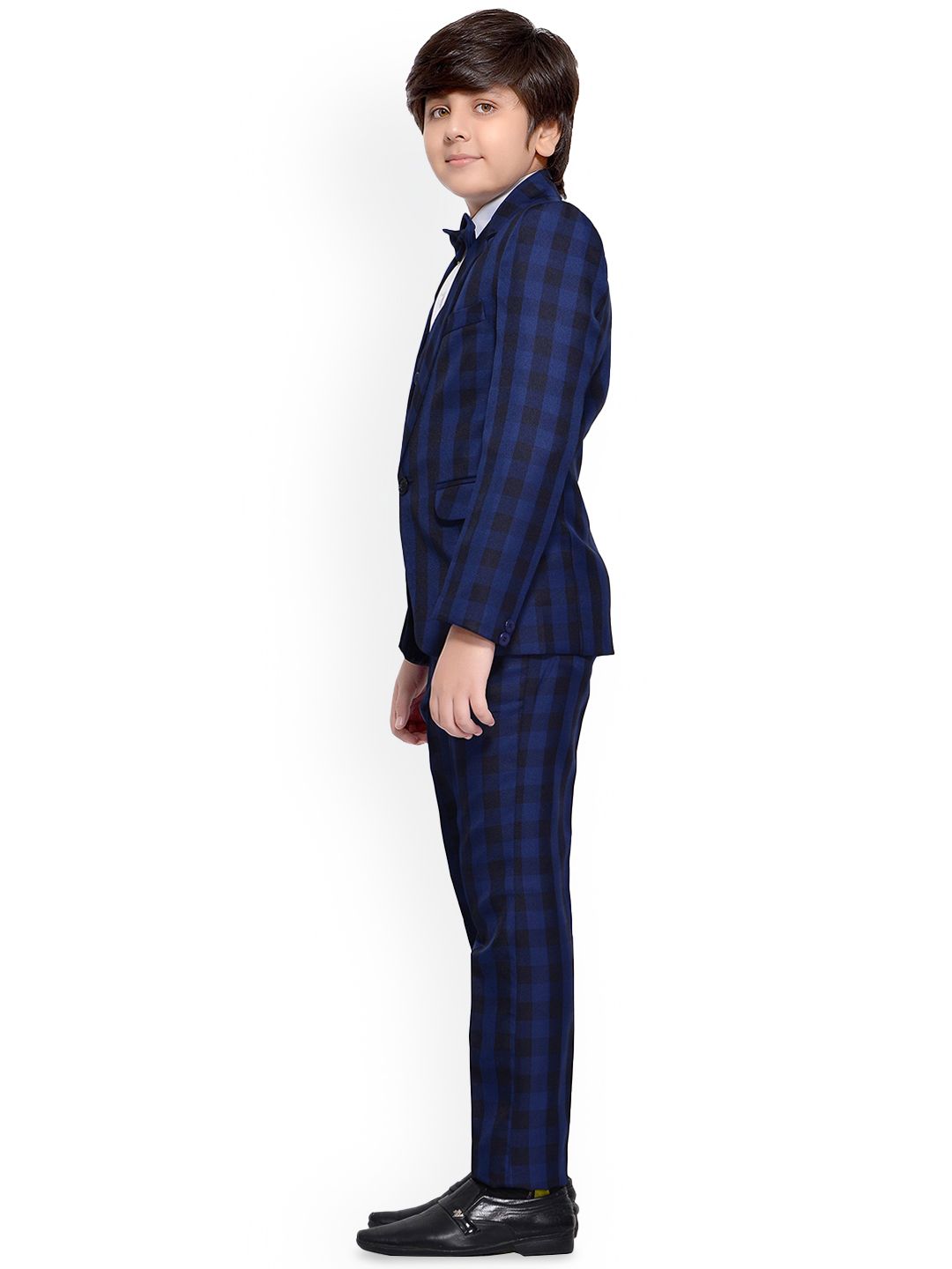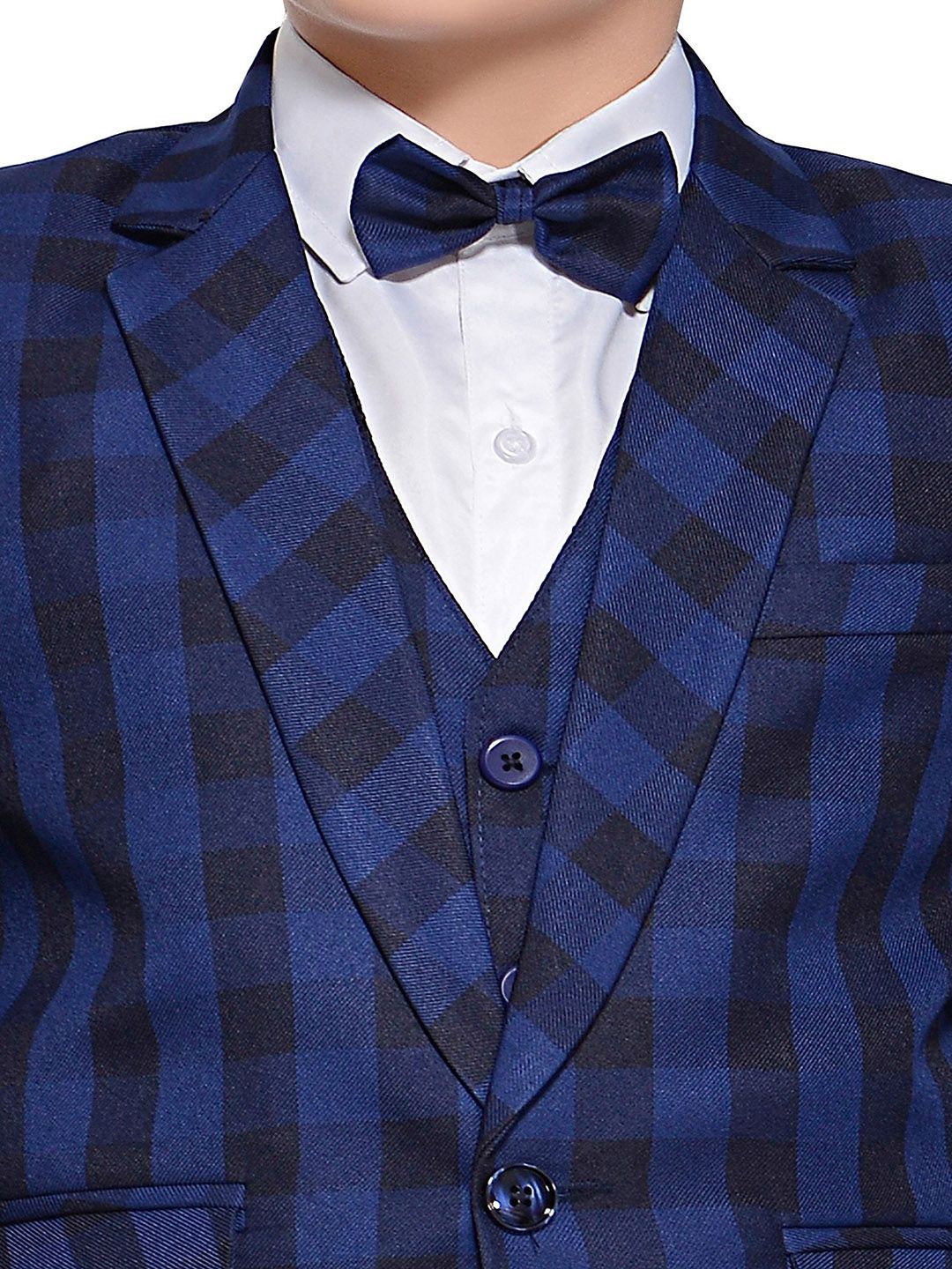 Navy Blue party suit with blazer, waistcoat, Shirt, trousers and bowNavy Blue checked blazer has a Notched lapel, single-breasted with double button closure, long sleeves, one welt pocket and two flap pocketsNavy blue checked mid-rise trousers have a full-length with button closure, zip fly, partially elasticated waistband with belt loops, and two pocketsWhite shirt has a solid pattern with straight collar, and cuffed full sleevesNavy Blue checked waistcoat, has a round-neck , a full button placket, sleeveless, Double-Breasted, and two pocketsComing with matching bow