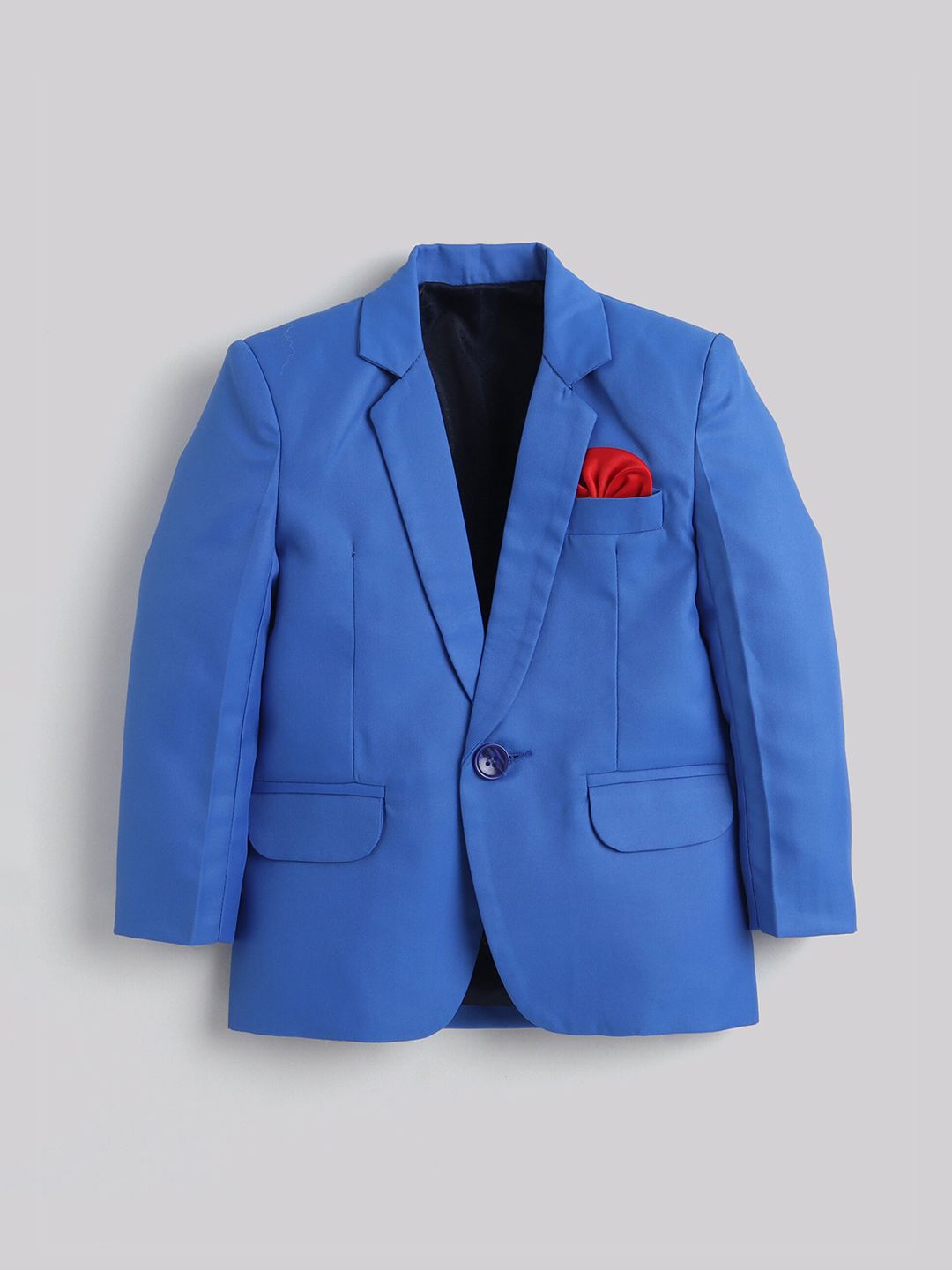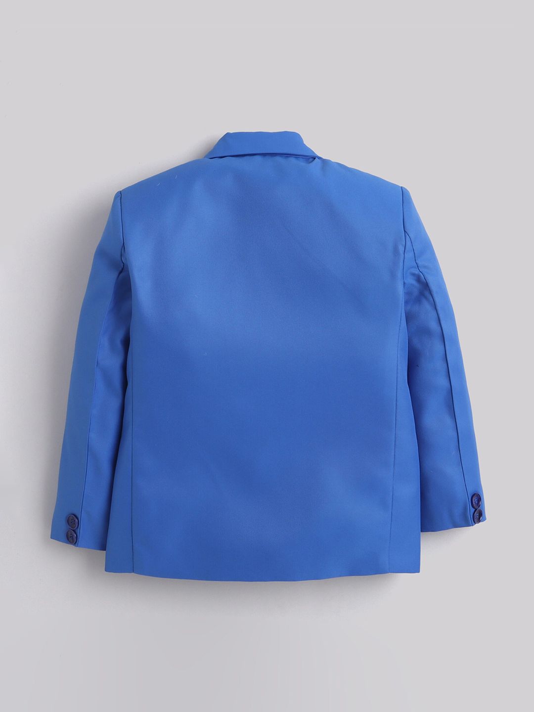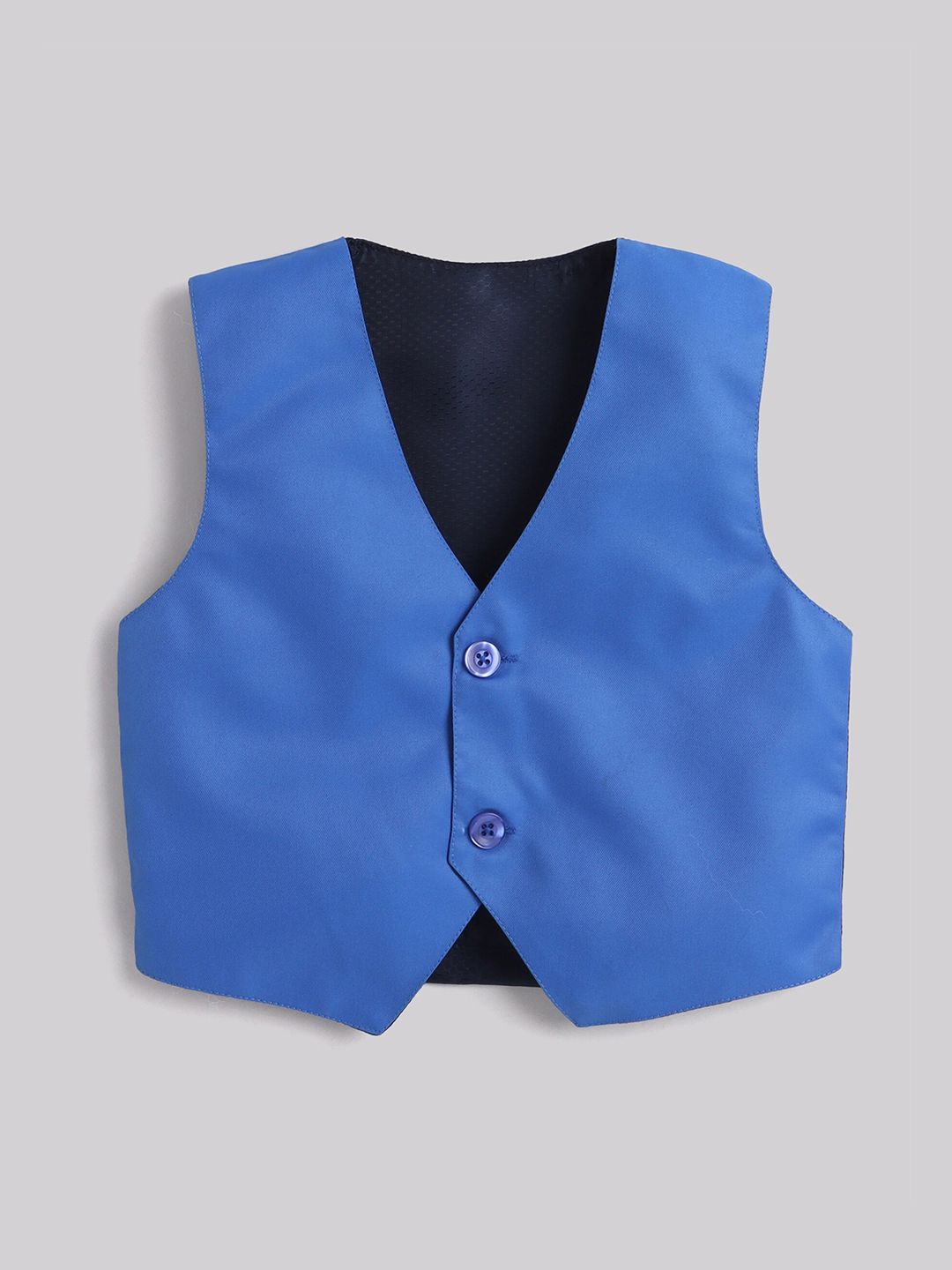 Blue formal suit with Shirt, waistcoat, blazers, bow and trousersBlue solid regular-fit blazer, has a notched lapel, single-breasted with single button closures, long sleeves, one welt pocket, and two flap pockets, and a double-vented back hemBlue checked mid-rise trousers, has a zip fly with a button and a hook-and-bar closure, four pockets, a waistband with belt loopsBlue checked waistcoat, has a mandarin collar, a full button placket, sleeveless, and three pocketsWhite solid Shirt has a shirt collar wit buttons closure and straight hem