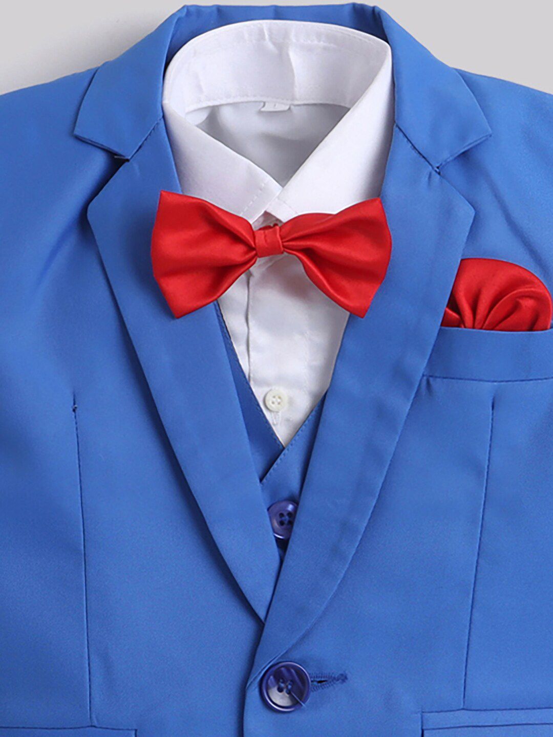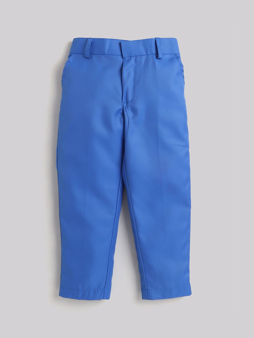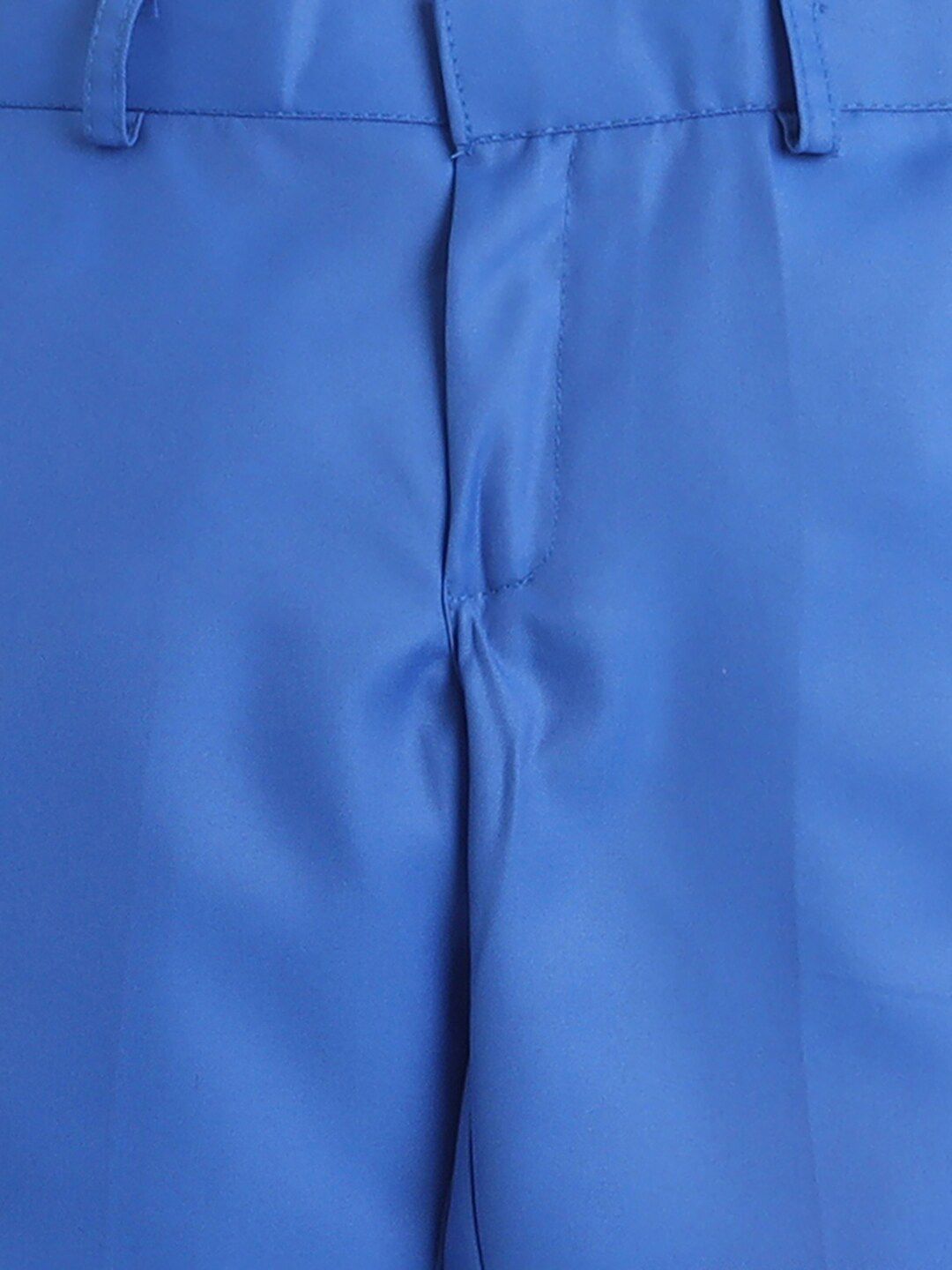 Blue formal suit with Shirt, waistcoat, blazers, bow and trousersBlue solid regular-fit blazer, has a notched lapel, single-breasted with single button closures, long sleeves, one welt pocket, and two flap pockets, and a double-vented back hemBlue checked mid-rise trousers, has a zip fly with a button and a hook-and-bar closure, four pockets, a waistband with belt loopsBlue checked waistcoat, has a mandarin collar, a full button placket, sleeveless, and three pocketsWhite solid Shirt has a shirt collar wit buttons closure and straight hem