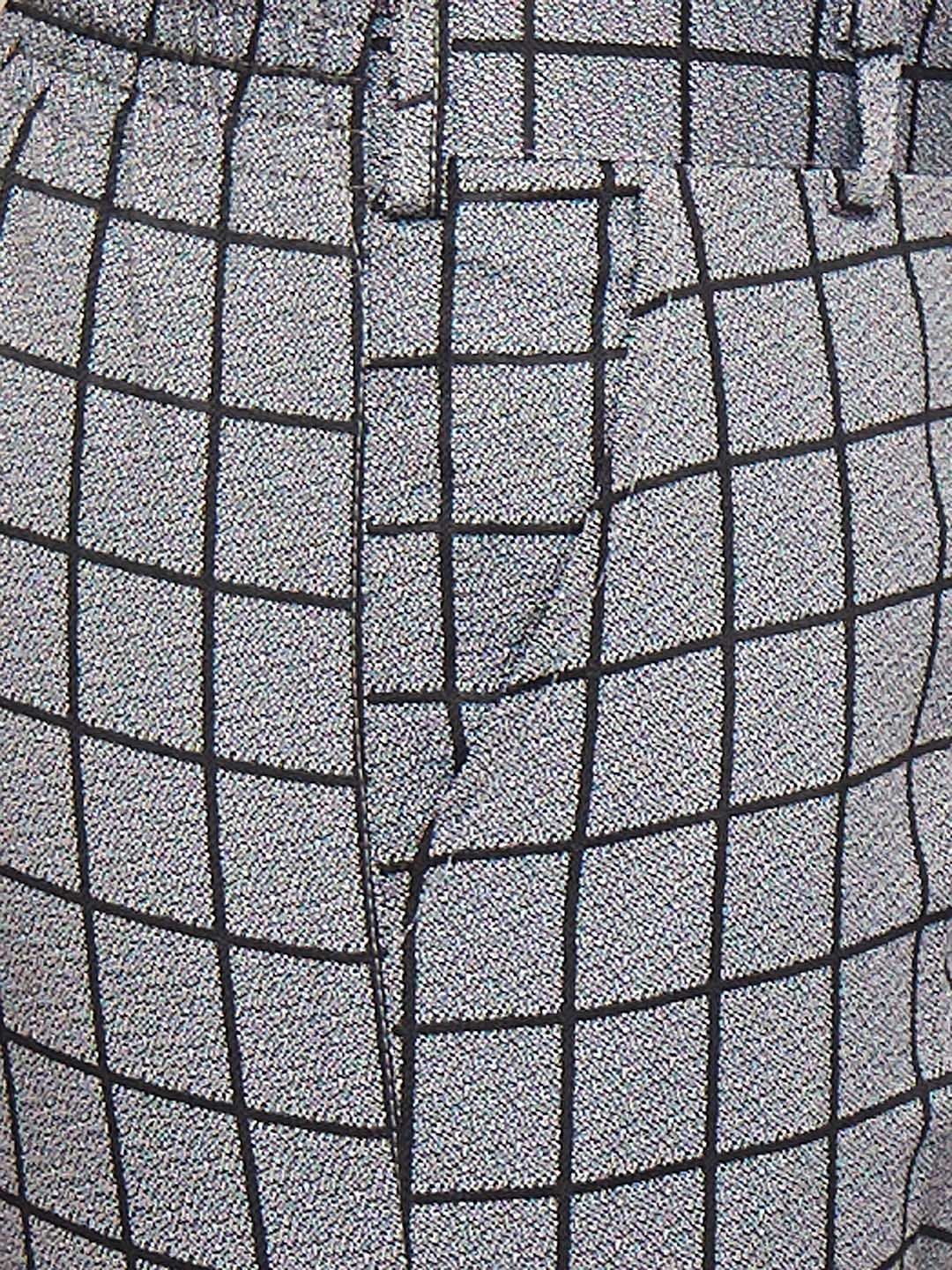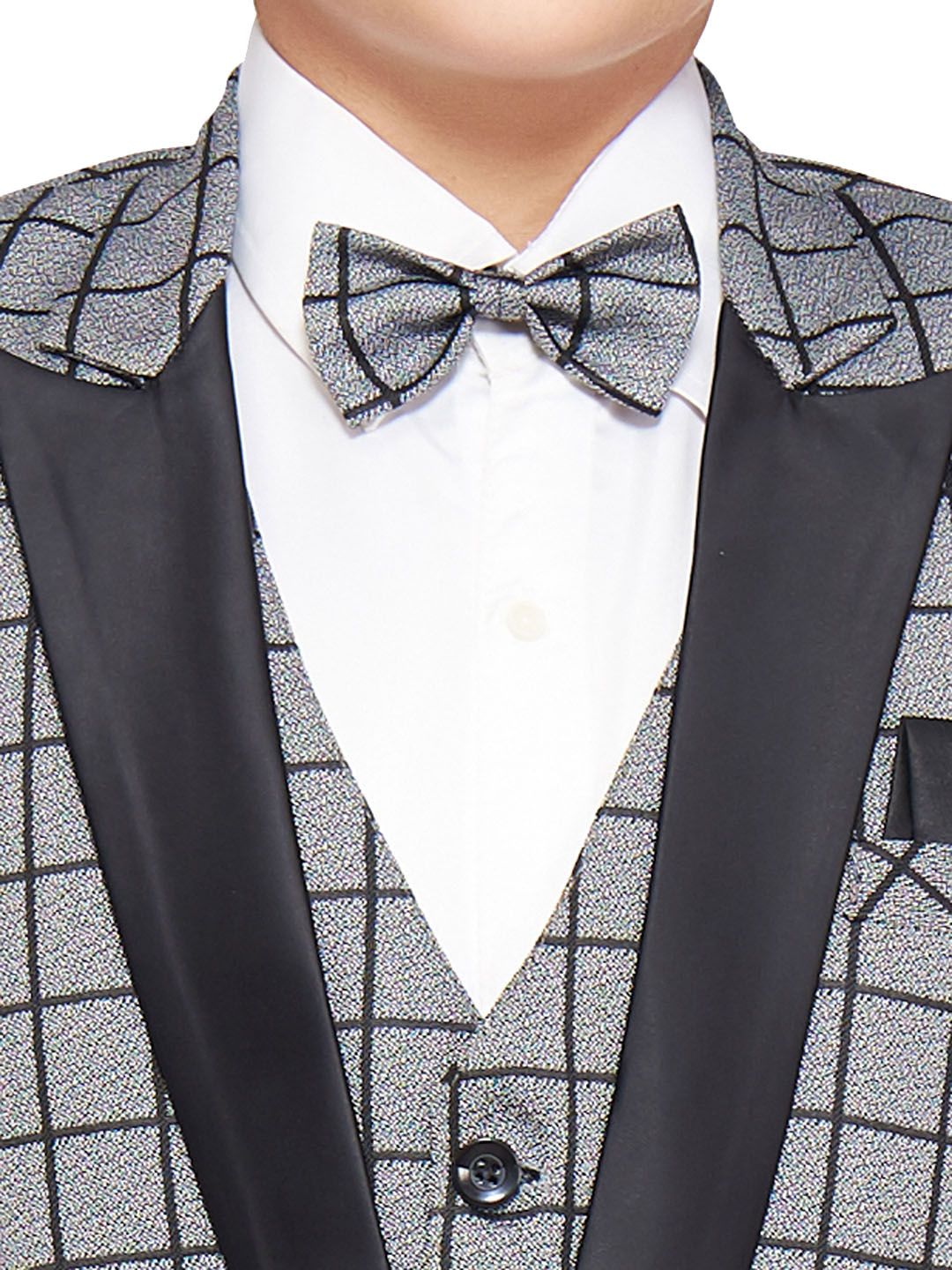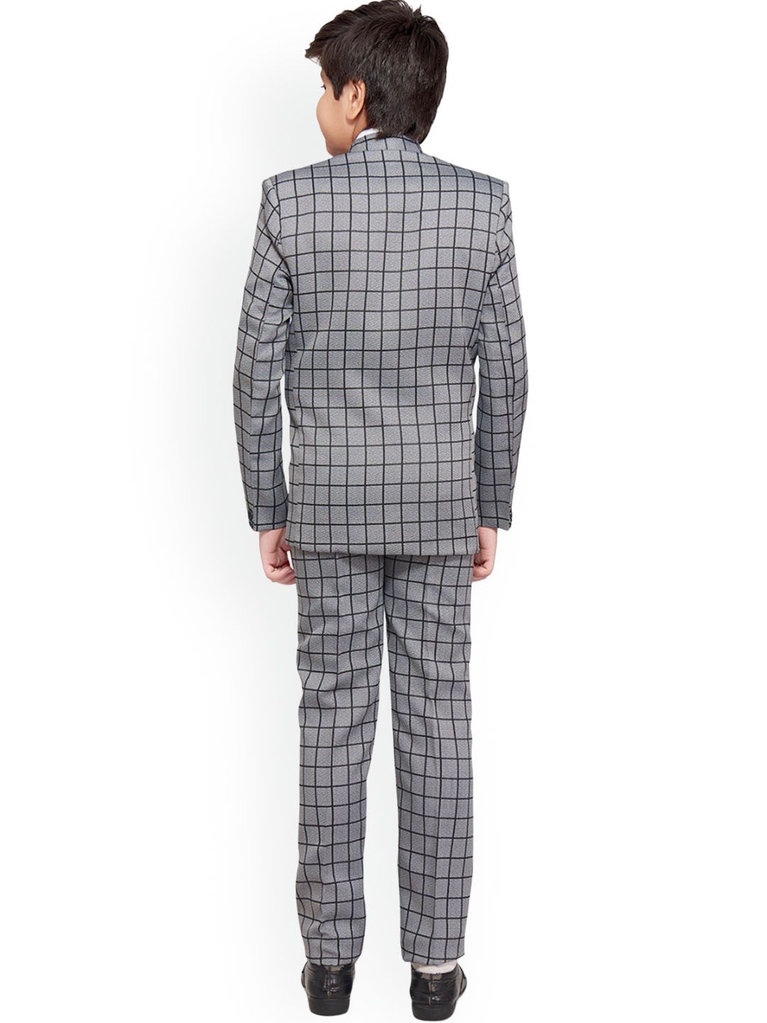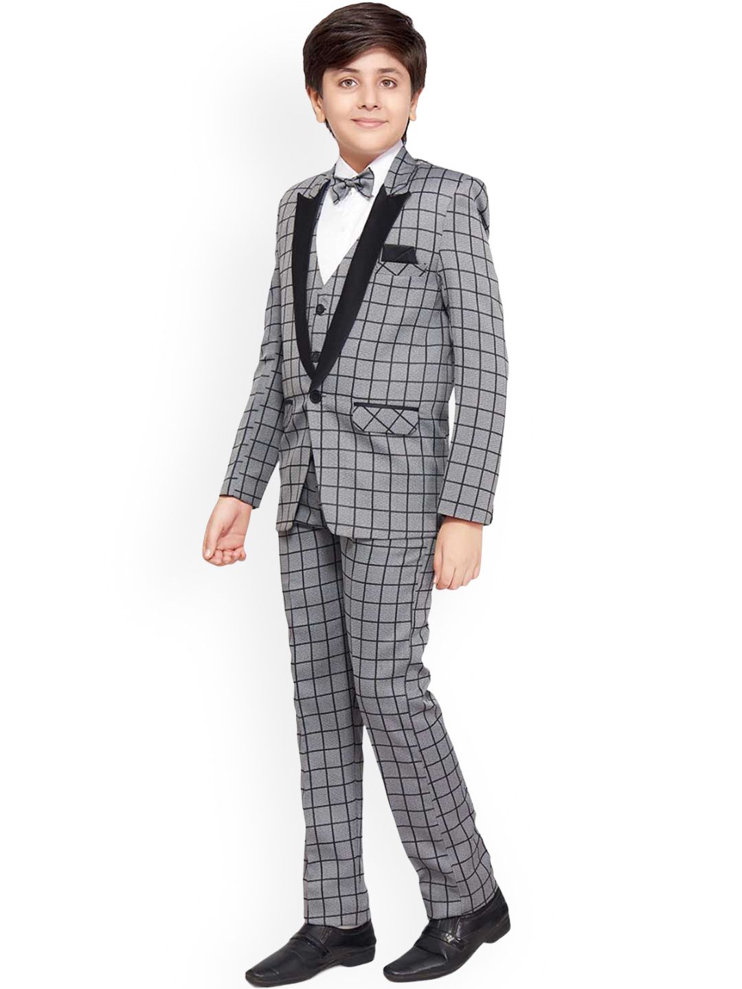 Grey and black suit set with waistcoat, blazers, shirt, bow and trousersGrey and black checked regular-fit blazer, has a peaked lapel collar, button closures, long sleeves, one welt pocket, and two flap pockets, and a double-vented back hemGrey and black checked mid-rise trousersGrey and black checked waistcoat, has a full button placket, sleevelessWhite solid shirt has shirt collar with front button placketComes with grey and black checked bow
