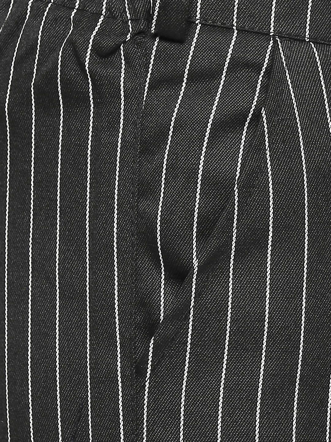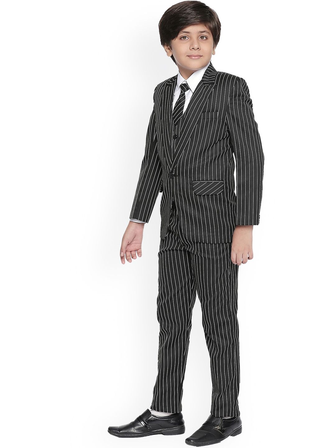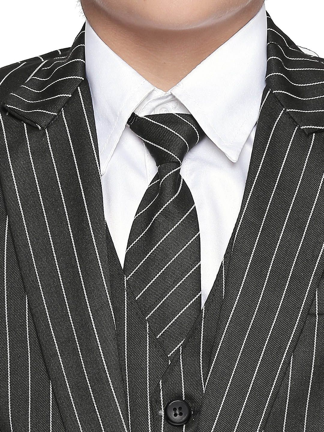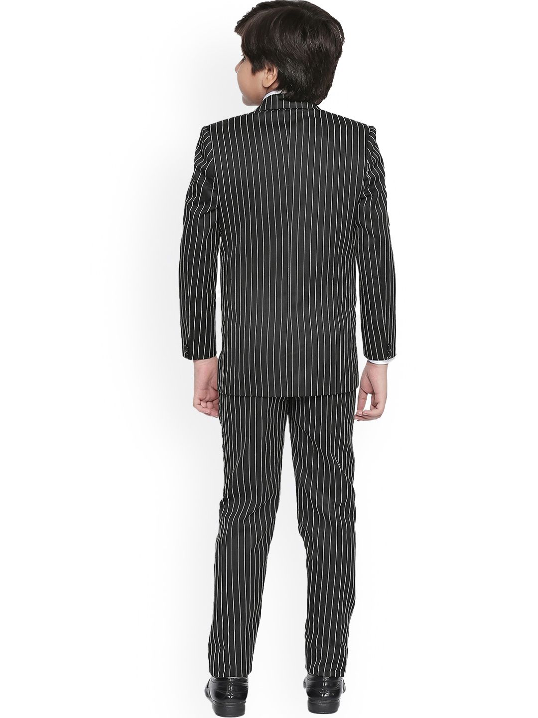 Black and white striped 5-piece suitBlack and white striped blazer, has a notched lapel collar, single-breasted with single button closures, long sleeves, two flap pockets, one chest welt pocket, an attached lining and a double vented back hemBlack and white striped waistcoat, has a V-neck, sleeveless, and button closureBlack and white striped trousers, has a waistband, zip closureWhite solid shirt, has shirt collar and long sleeves with button closure