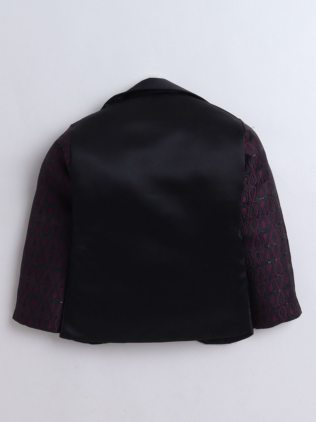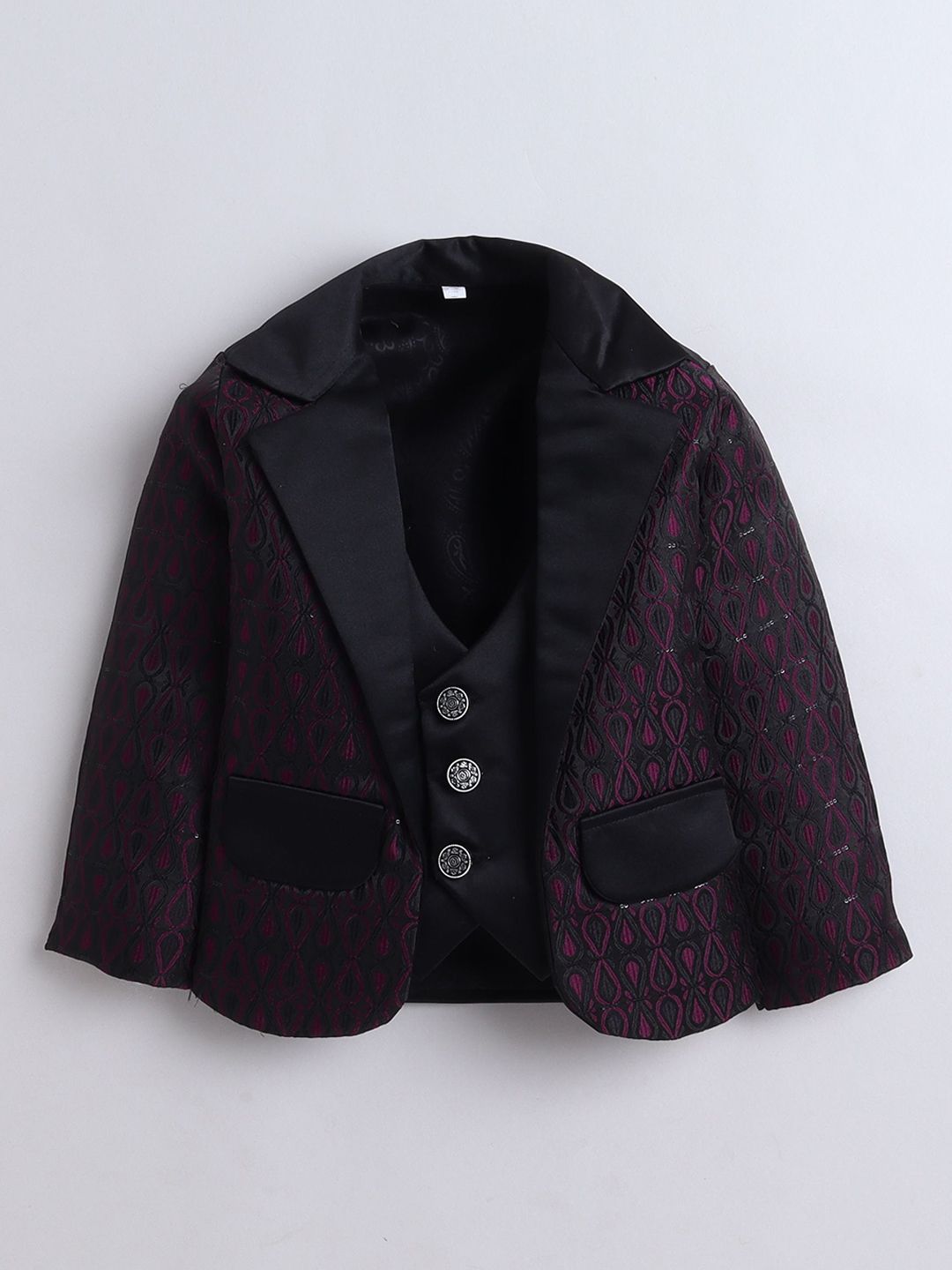Purple self designed regular-fit three-piece formal suitPurple self designed regular-fit single-breasted blazer, has a notched lapel with button closures, long sleeves and three pocketsA pair of black solid regular-fit mid-rise trousers, has a waistband with belt loops, a zip fly and a button closure, and four pocketsComes with white solid shirt collar neck long sleeves with button closure & a tie