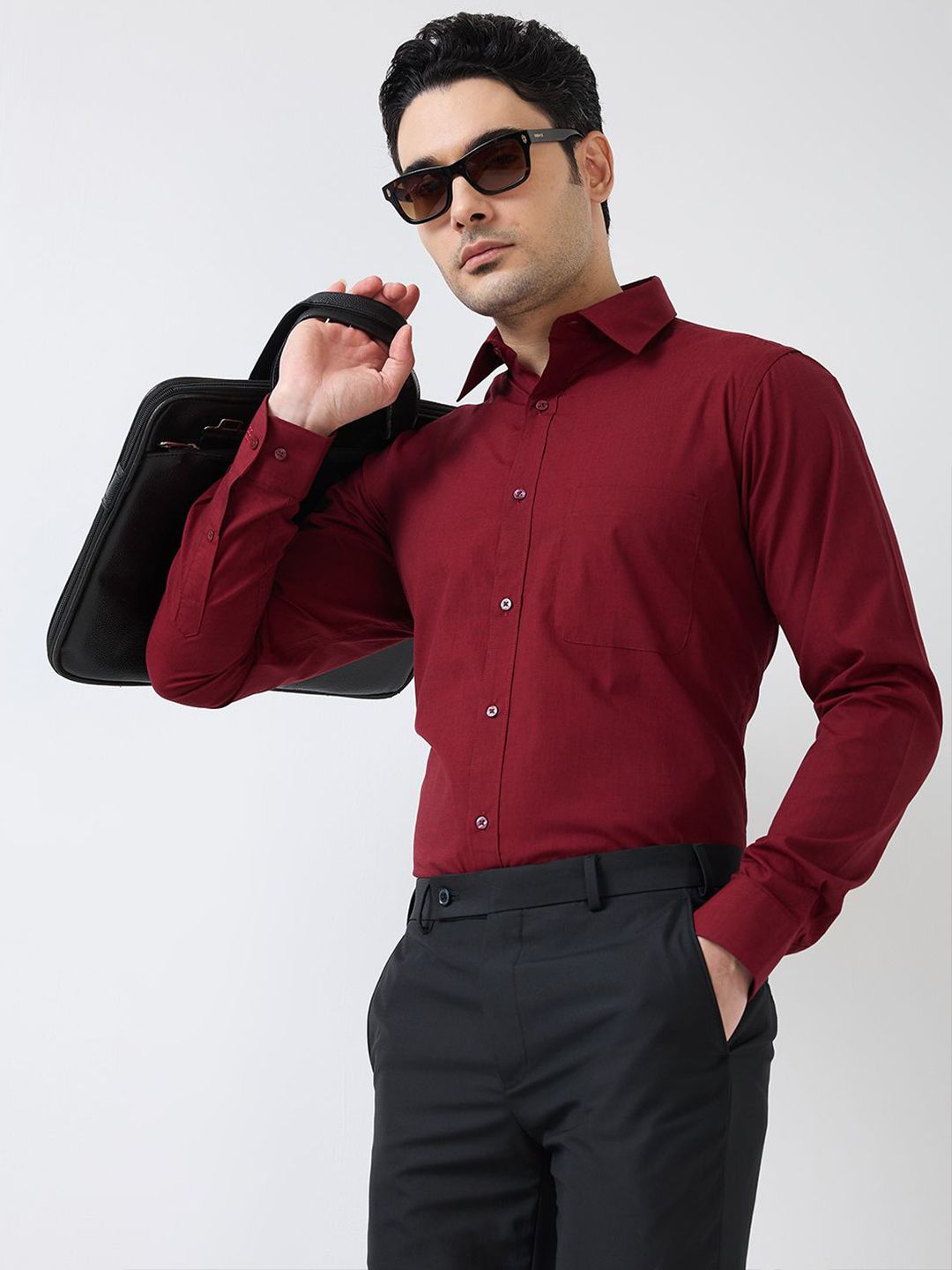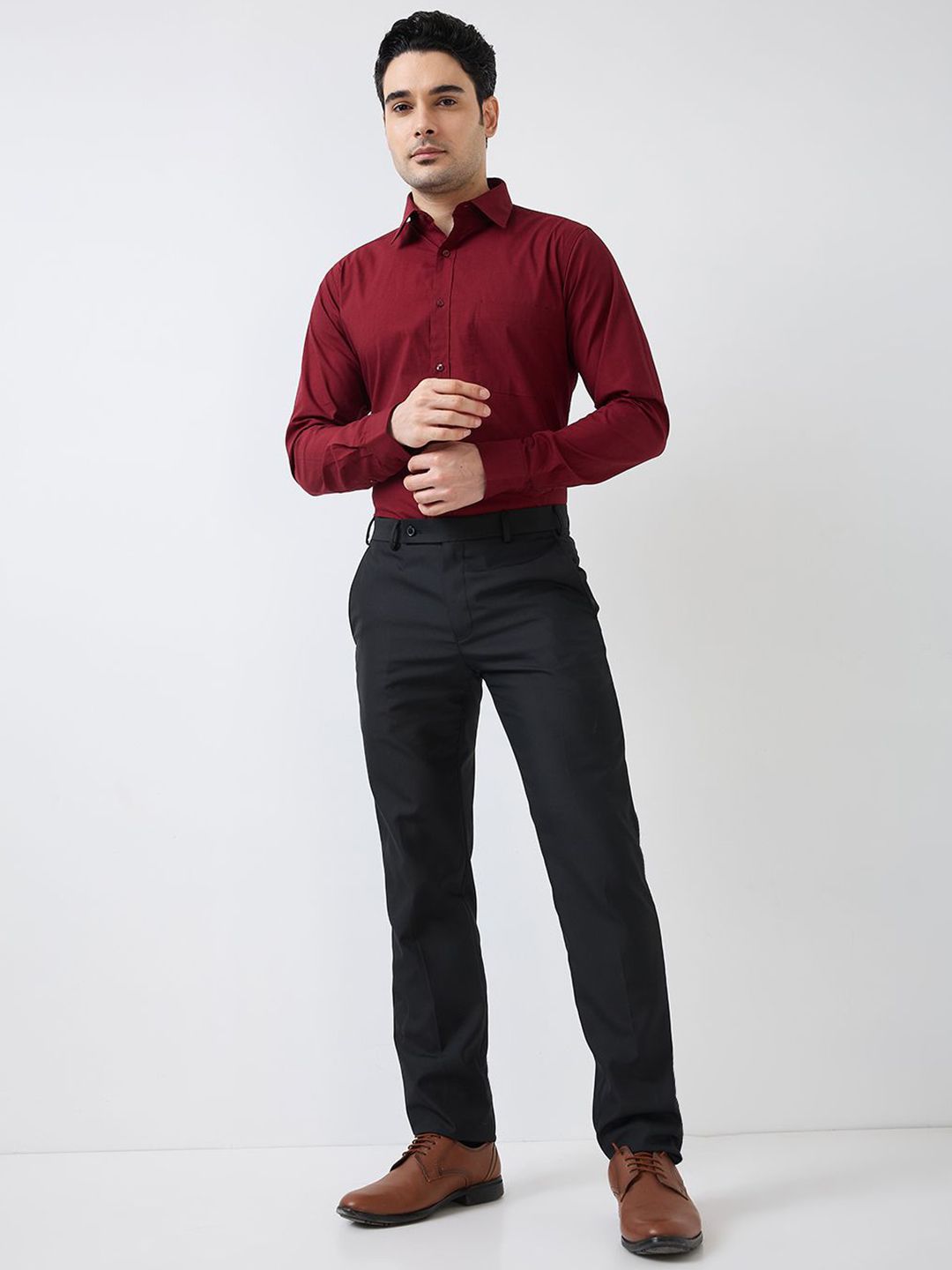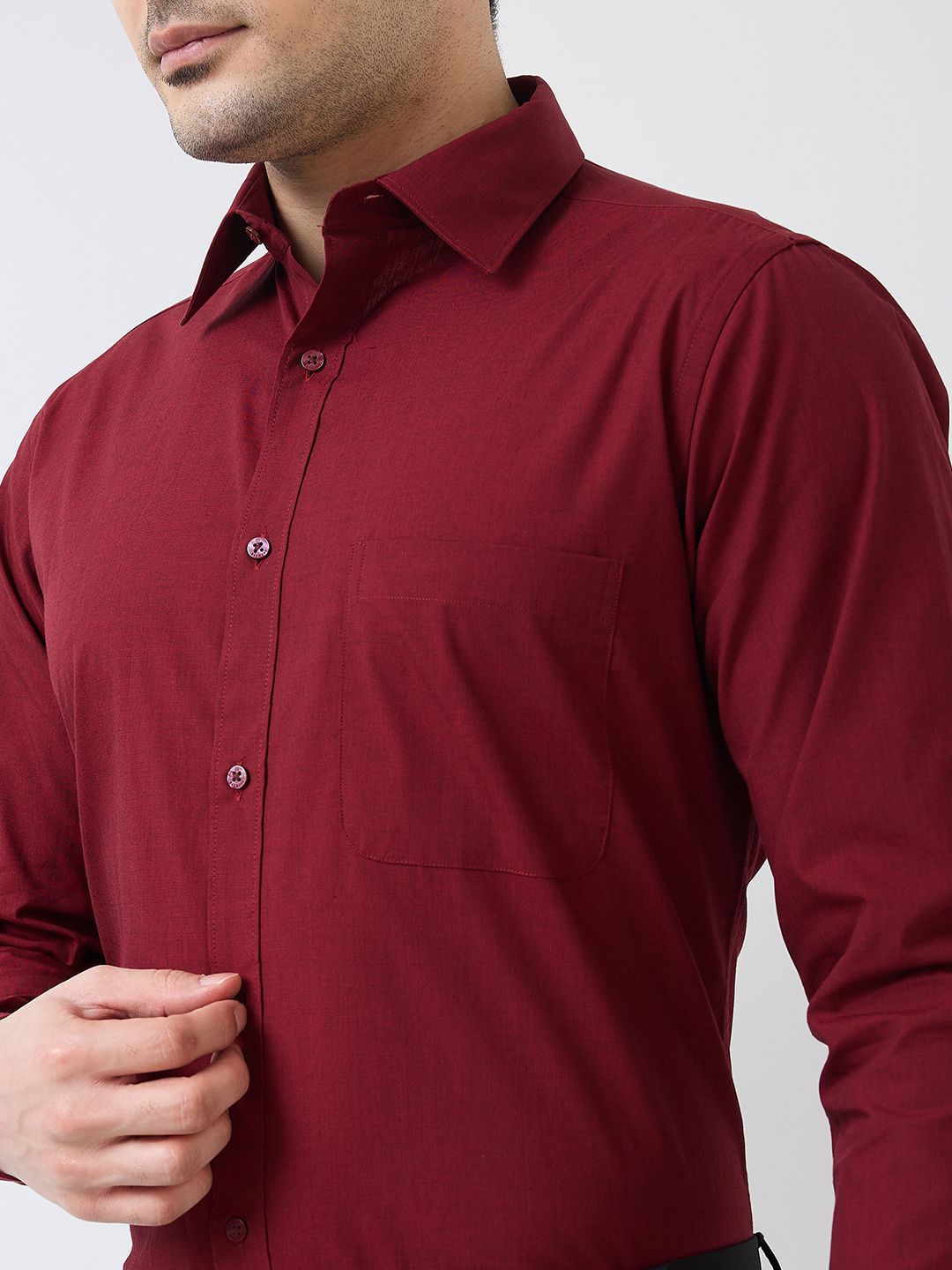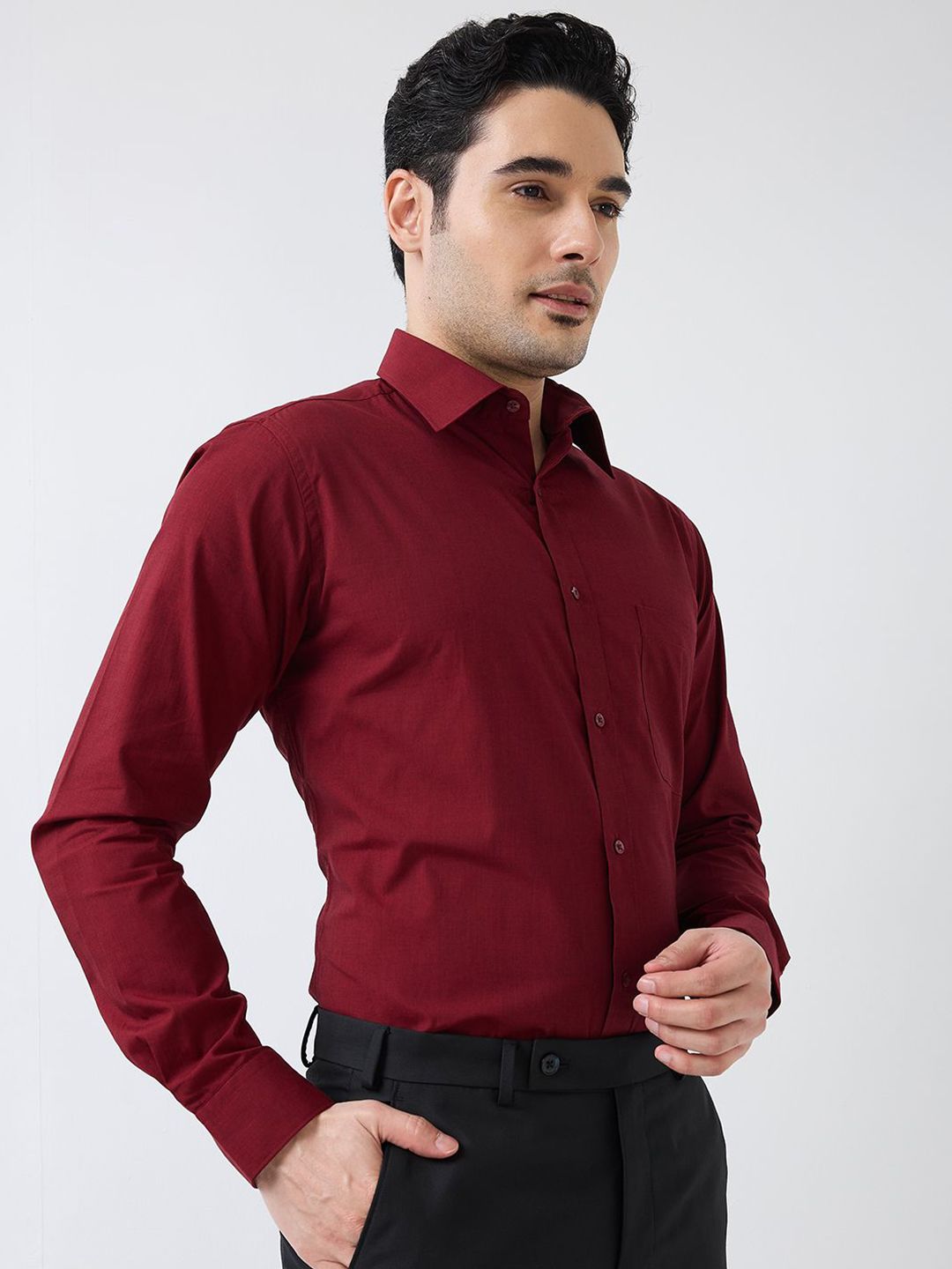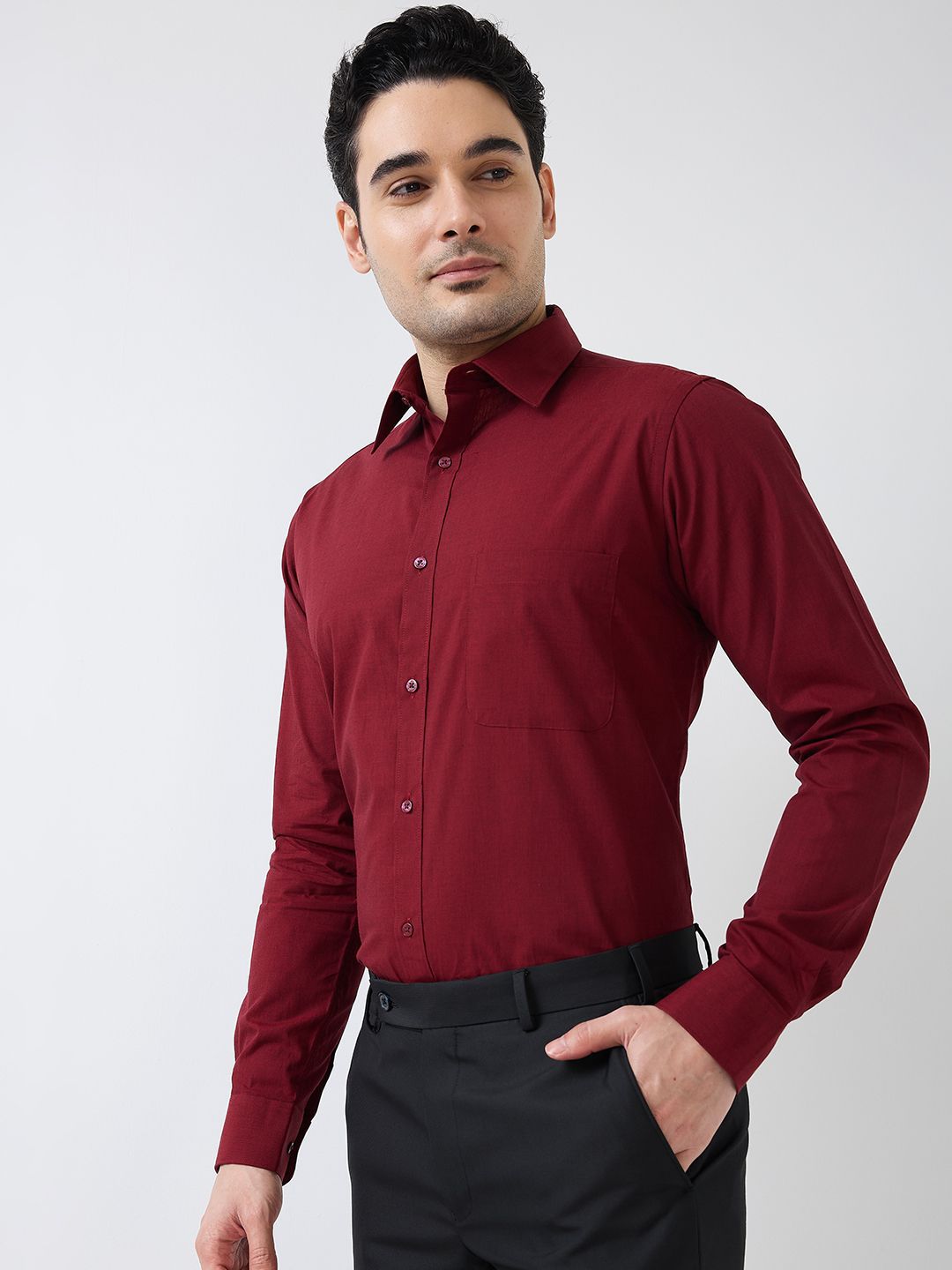 Maroon solid slim fit shirt has a semi cutaway collar long sleeve, full placket button closure with curved hem