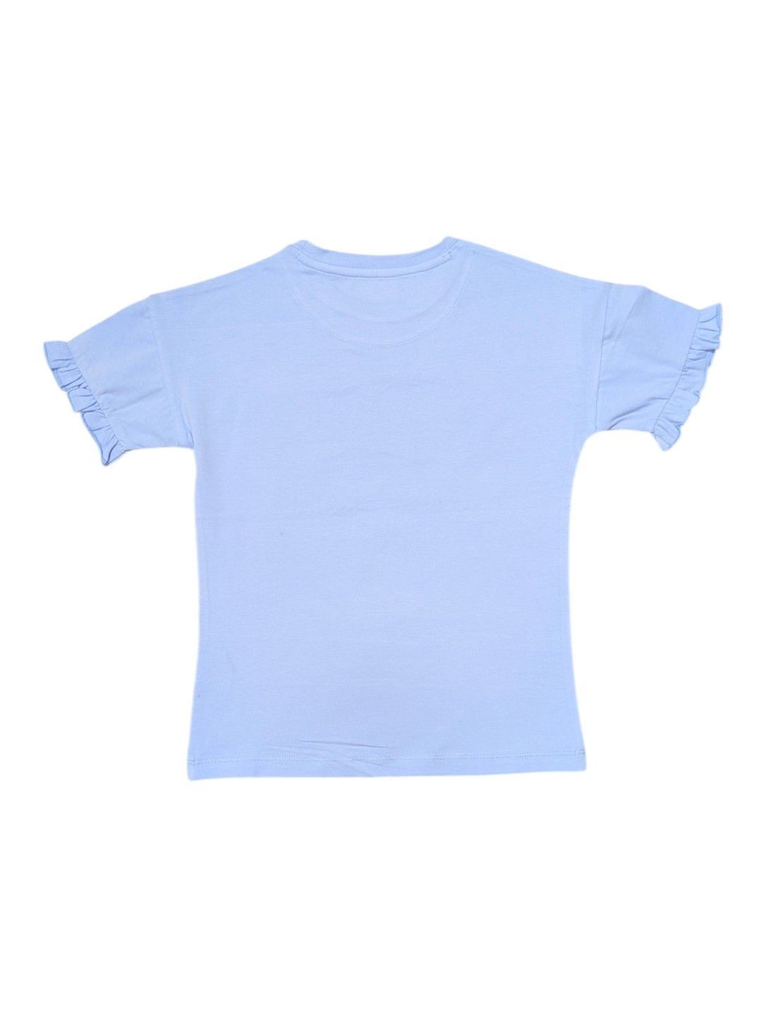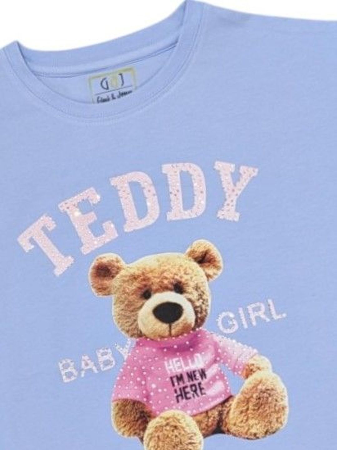 Cute blue tee with a teddy bear graphic print and ruffled cuffs. Become a "Teddy Baby Girl" for playdates. Pair with leggings.