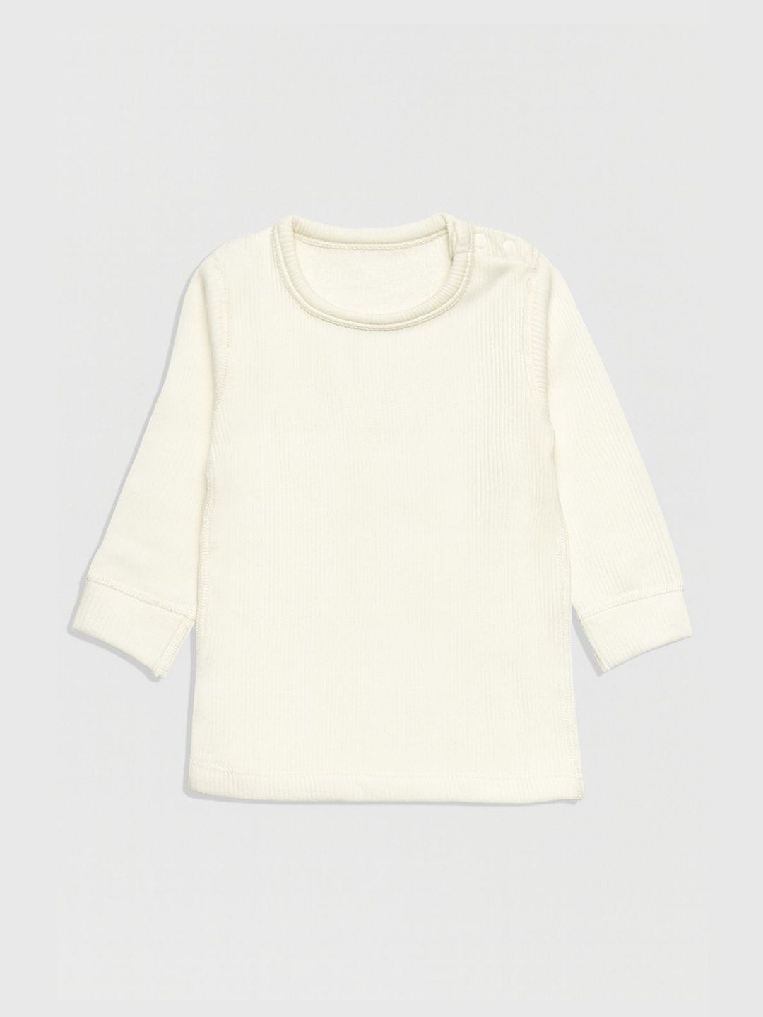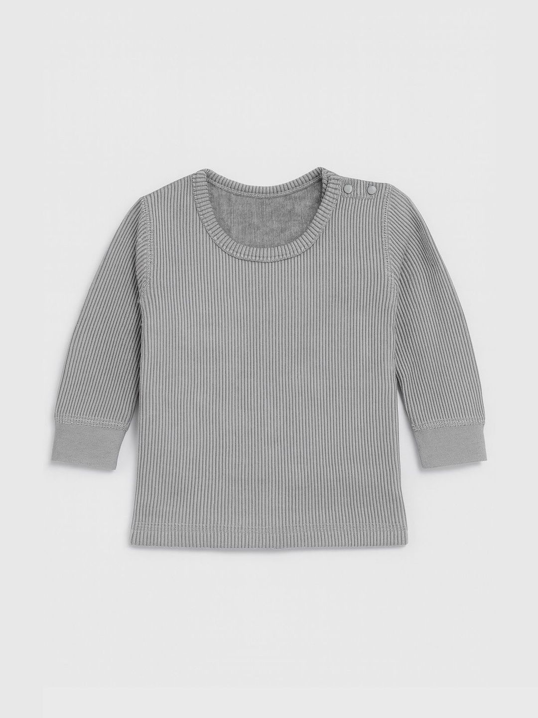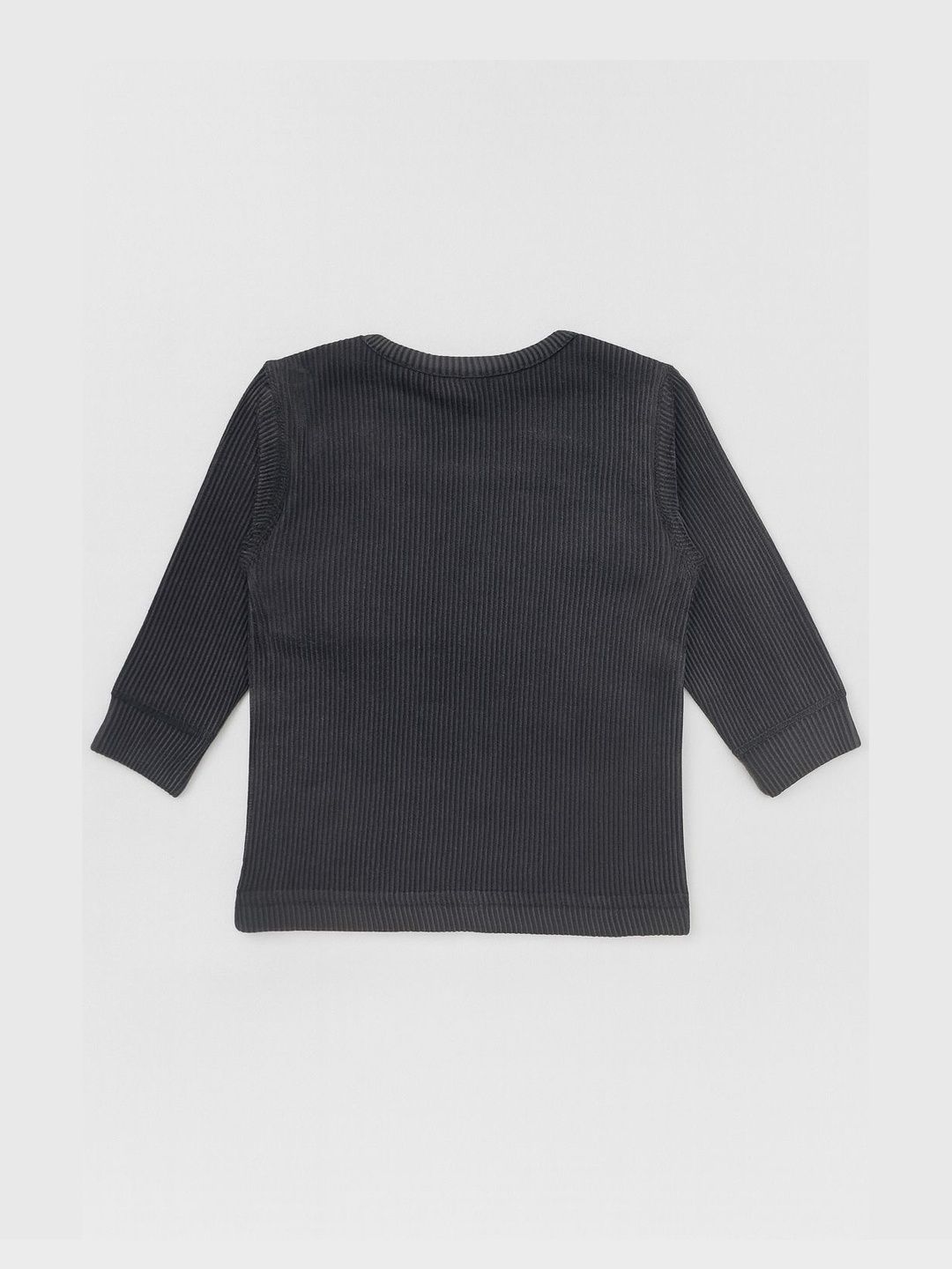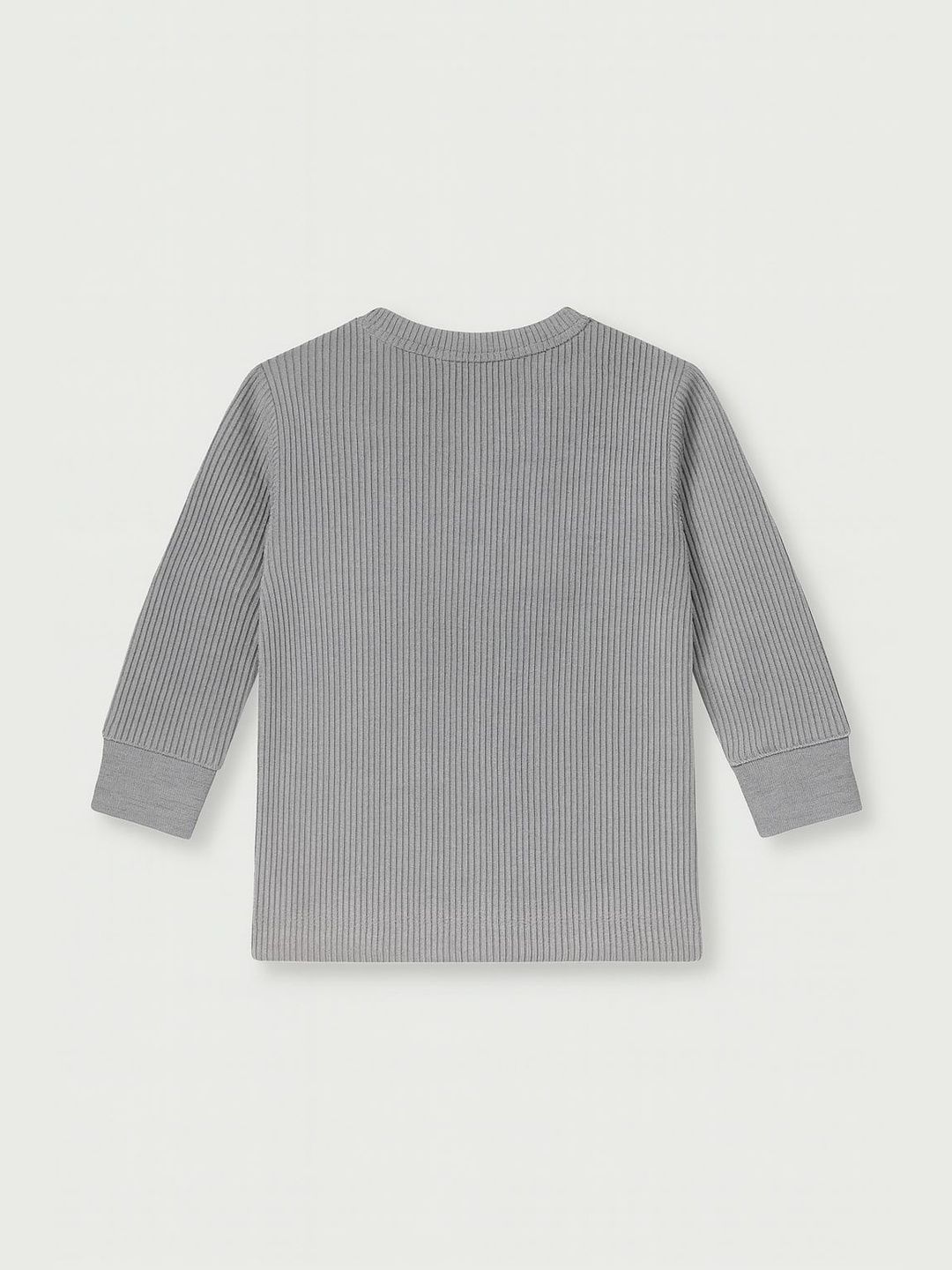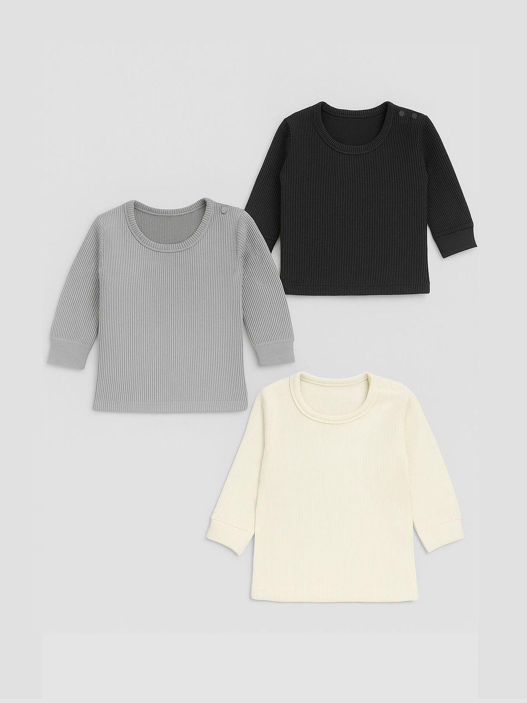 Pack of 3 grey, black and white ribbed thermal tops, each has a round neck, and long sleeves with straight hem
