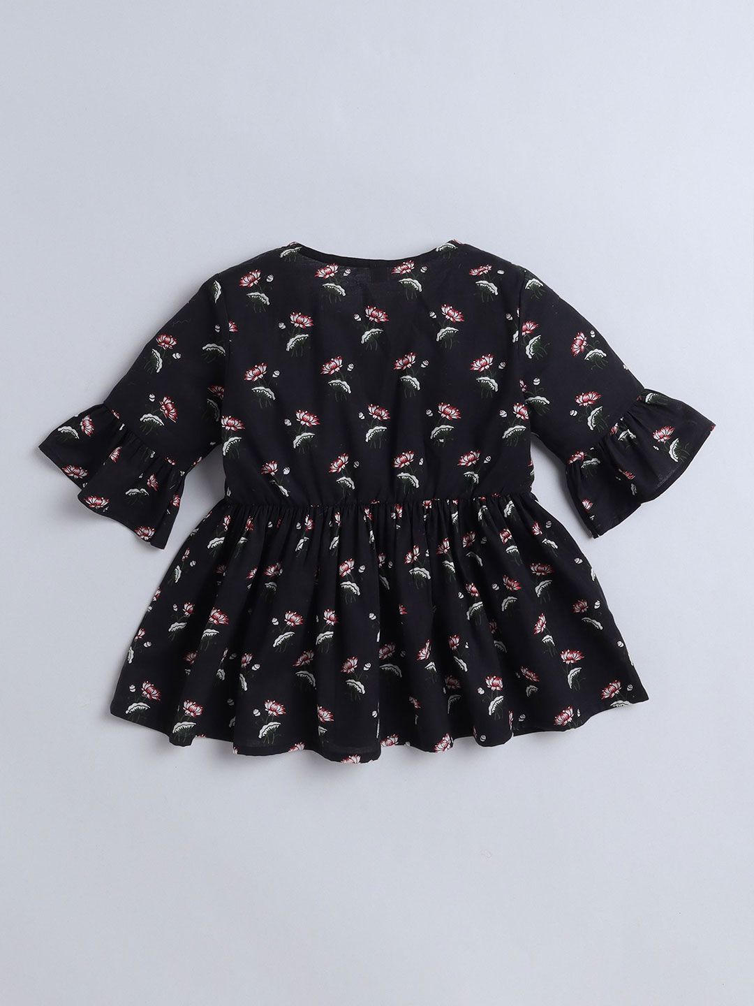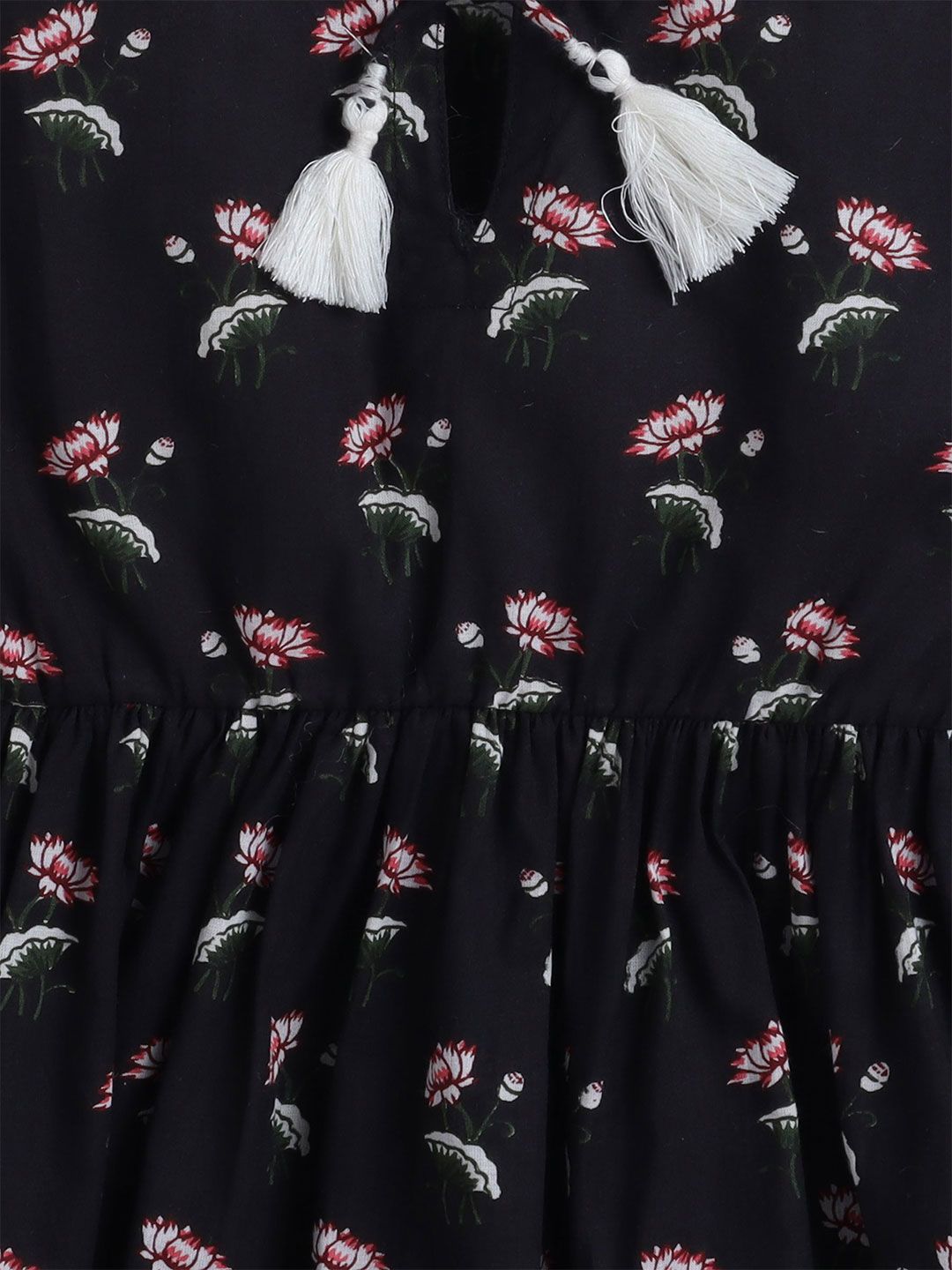 The Magic Wand Three Fourth Sleeves Cotton Floral Printed With Tassels Detailed Top-Black