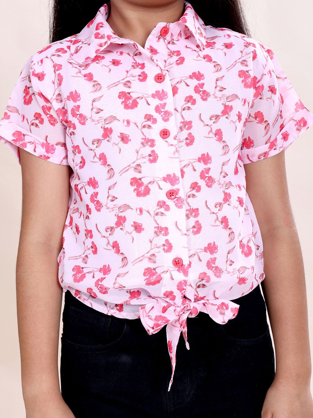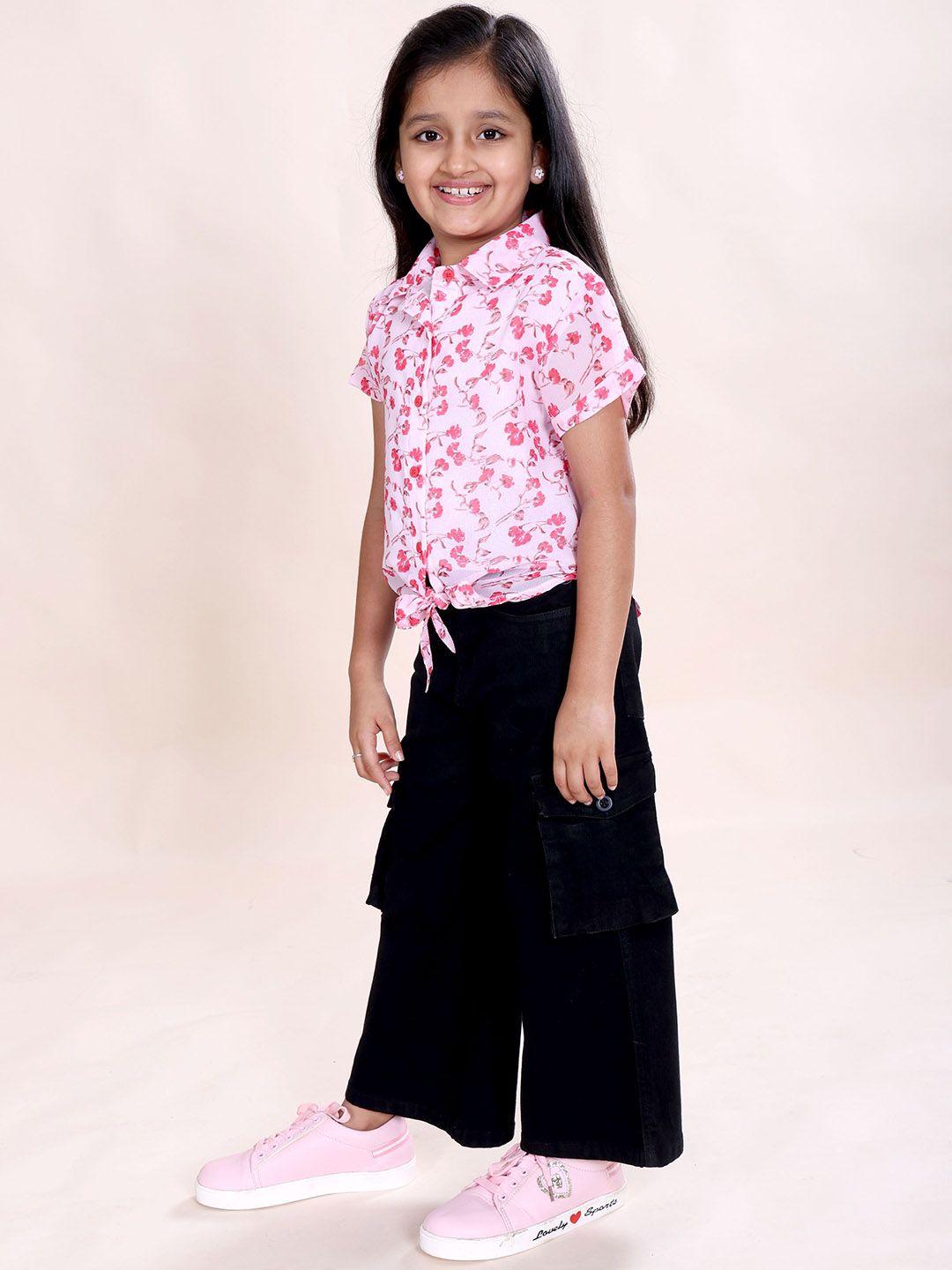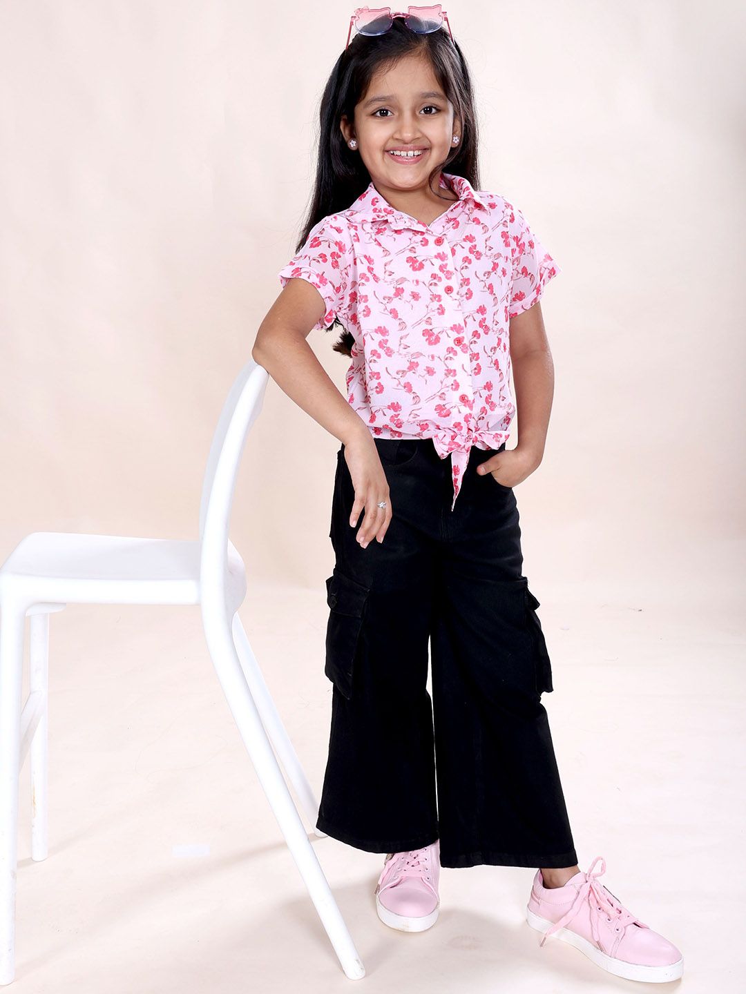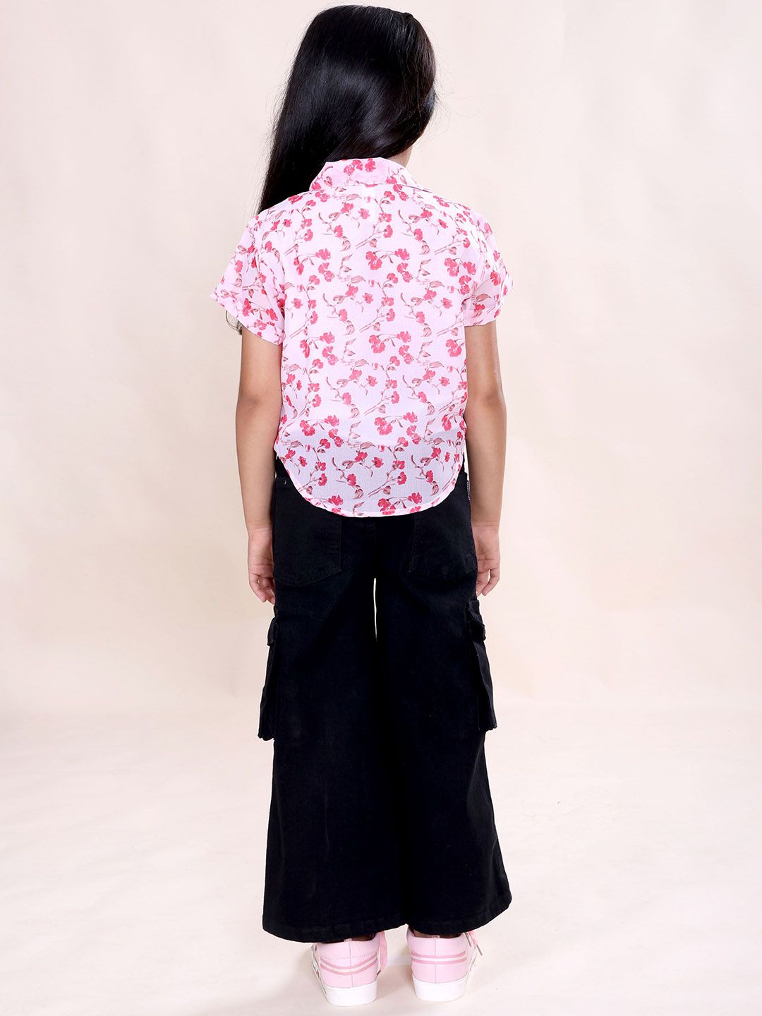 This clothing set consists of shirt and trousersPink printed shirt, has a shirt collar neck with short sleevesBlack solid trousers, has an elasticated waistband with button closure