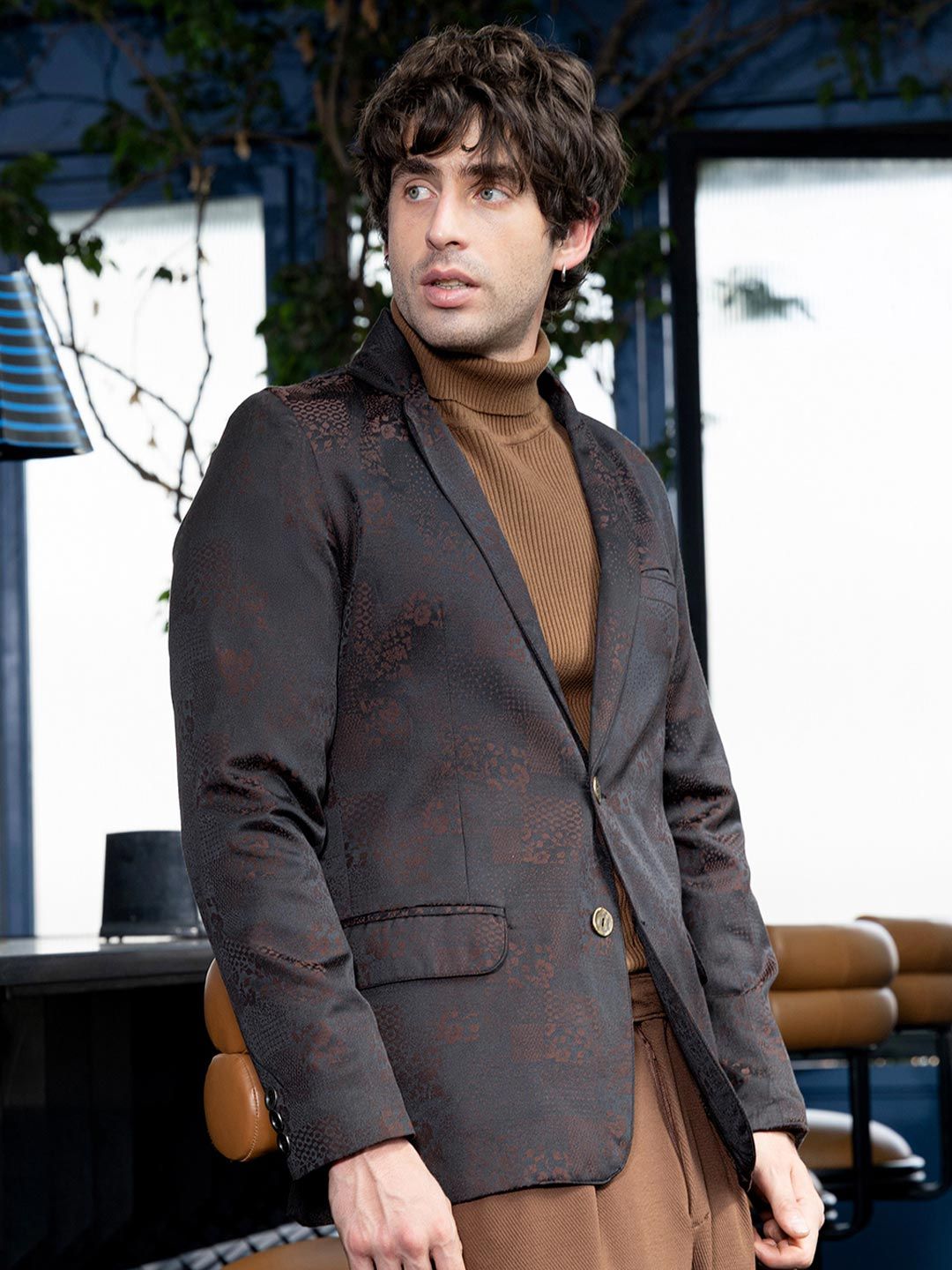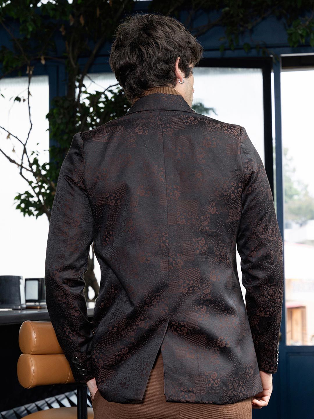 Brown printed tailored Fit blazer, has a notched lapel, long sleeves,double-breasted with double button closure, two flap pockets, one welt pocket and a double-vent hem