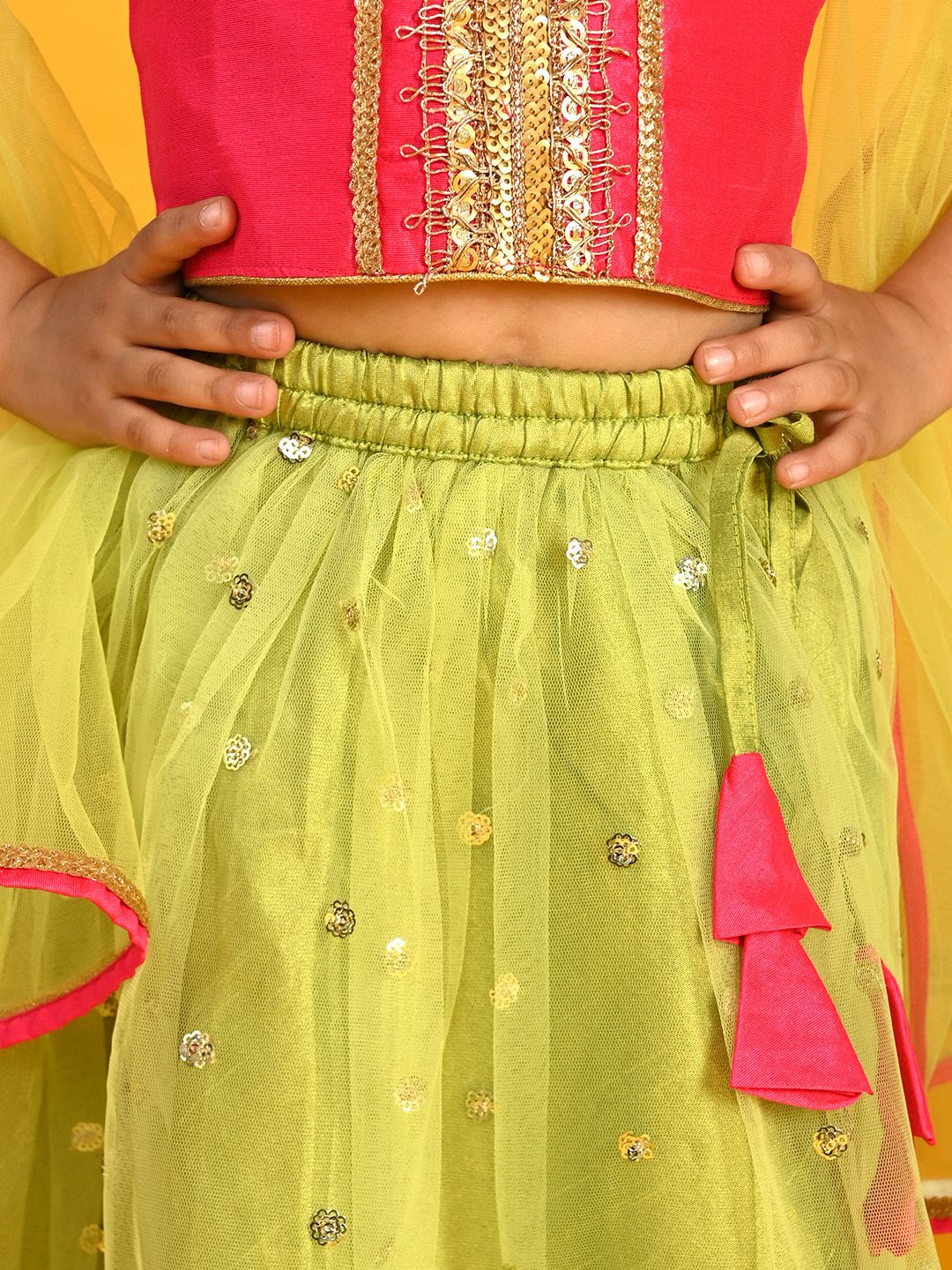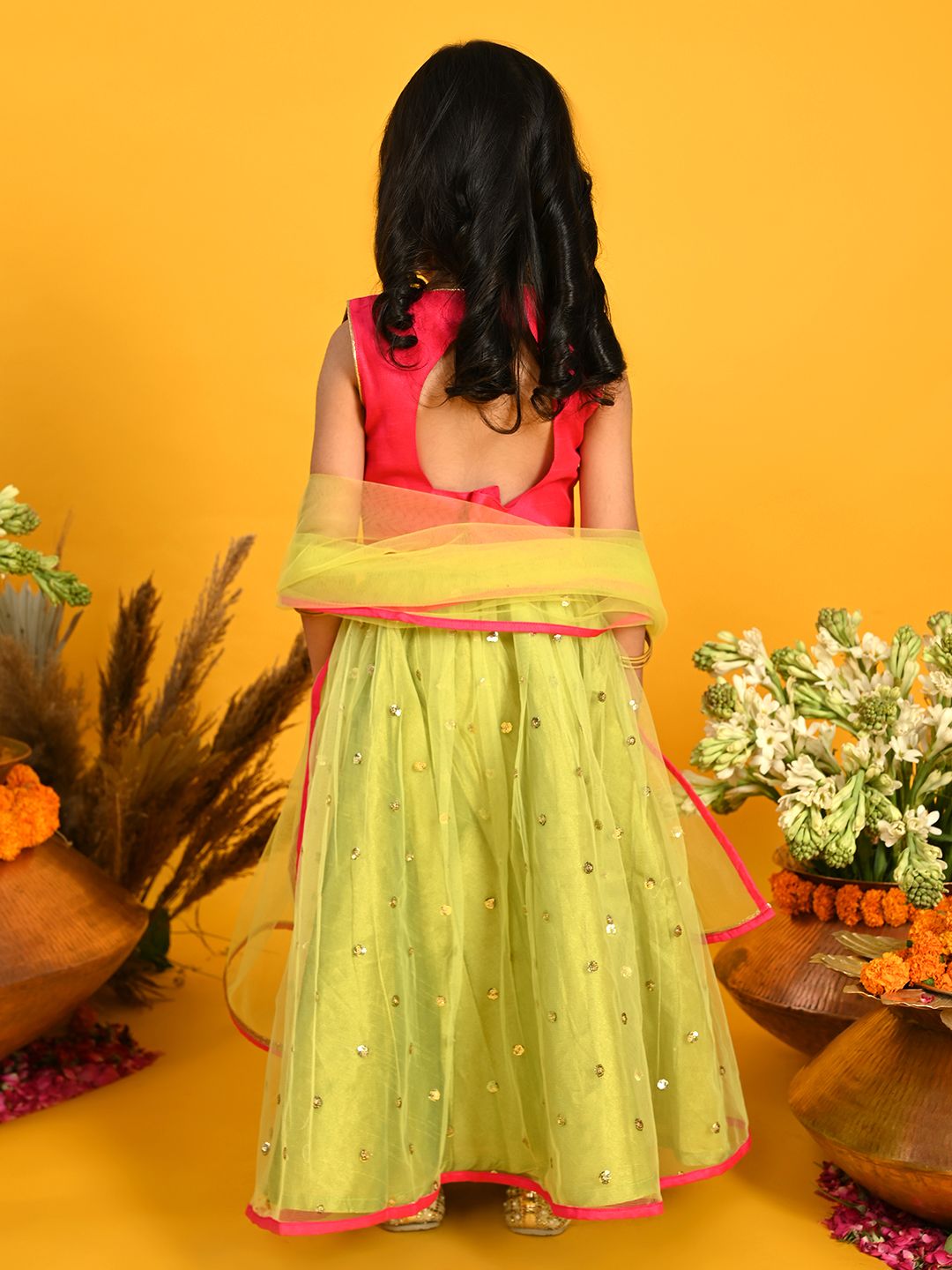 A very festive combination of parrot green and magenta. The choli has lace detailing at the front .The lehnga has sequenced emberoidery and super cute tassels on the sides. The set is completed with a dupatta matching with the lehnga.