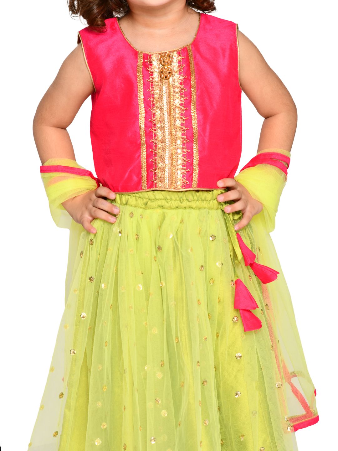 A very festive combination of parrot green and magenta. The choli has lace detailing at the front .The lehnga has sequenced emberoidery and super cute tassels on the sides. The set is completed with a dupatta matching with the lehnga.
