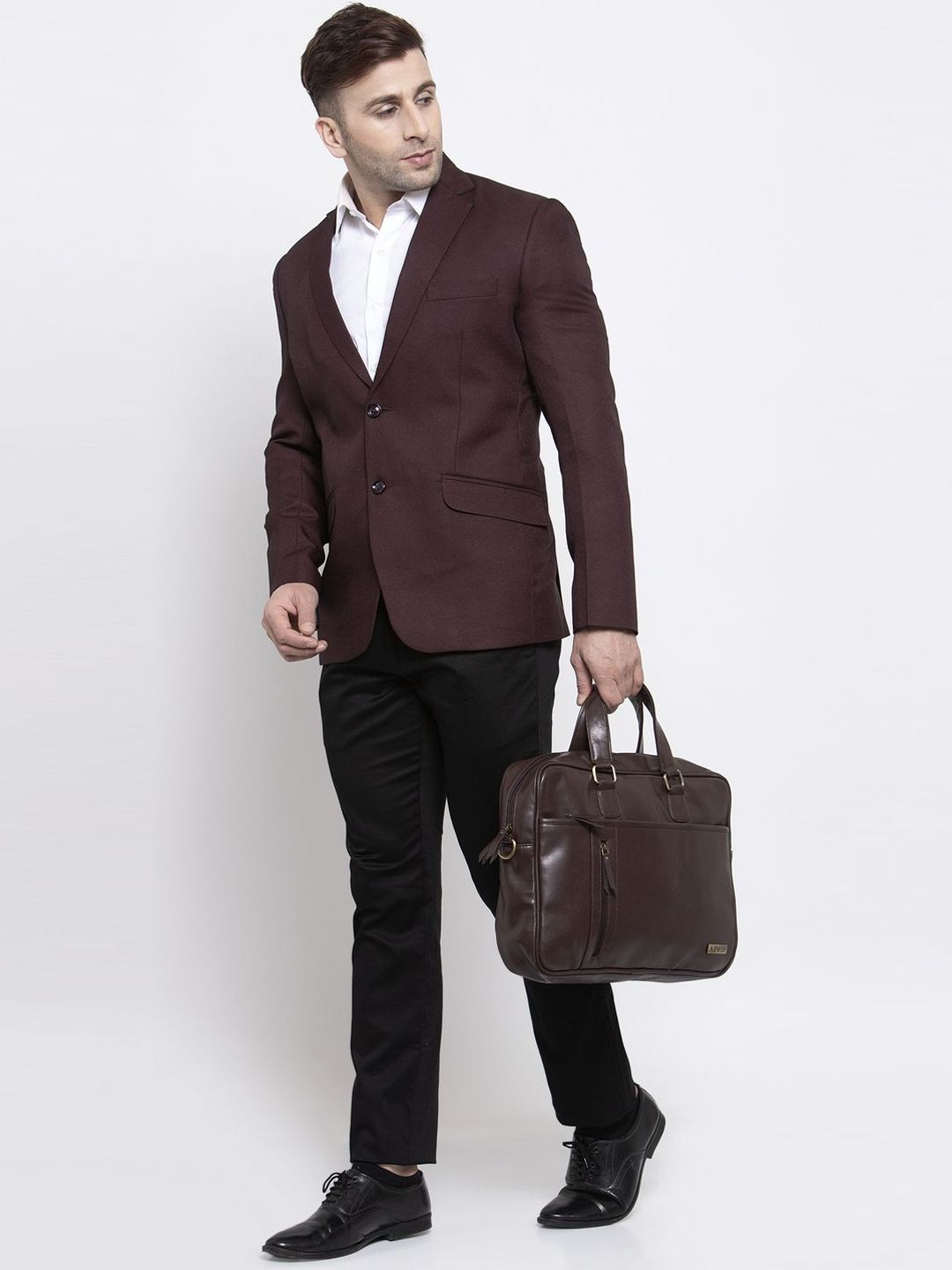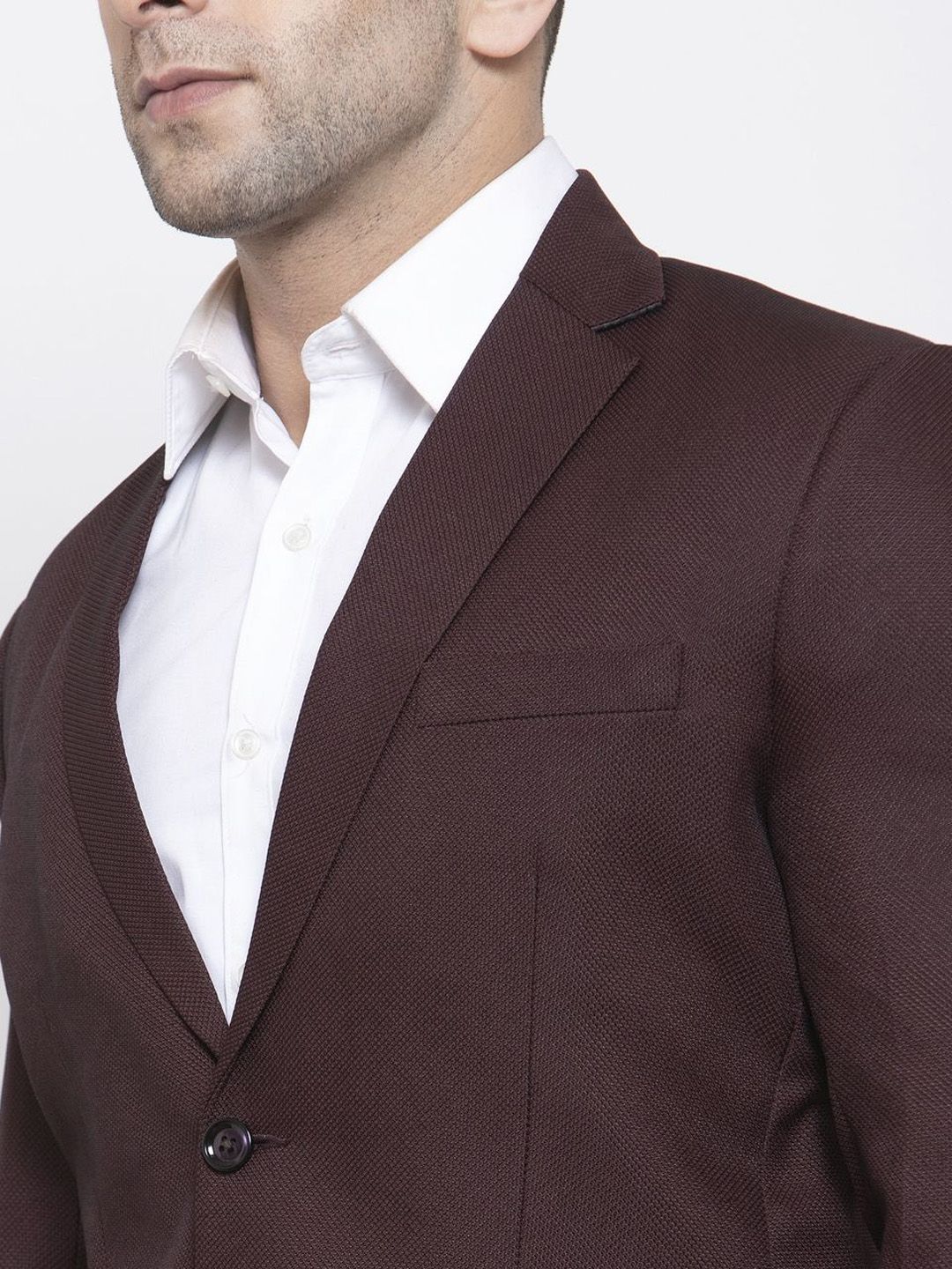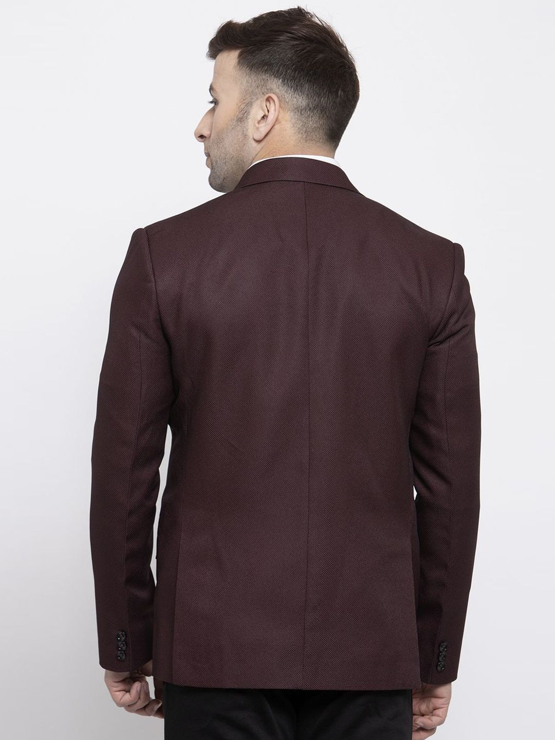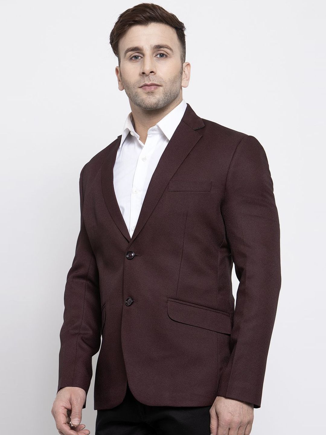 Brown self-design tailored fit single-breasted blazer, has a notched lapel, double button closure, long sleeves, three pockets, an attached lining