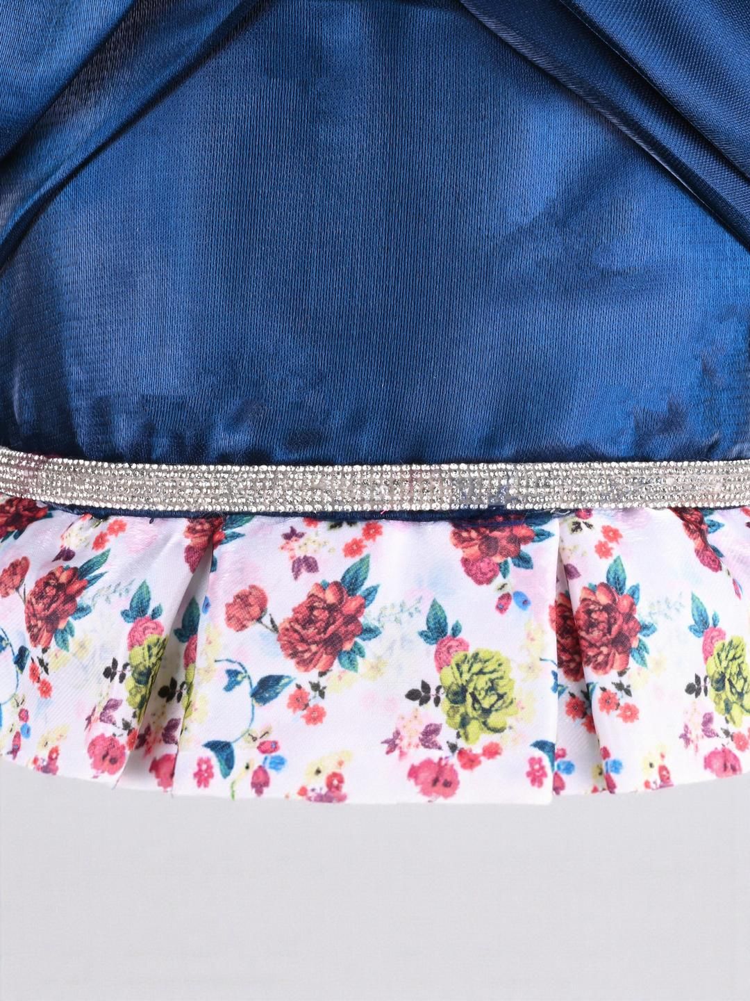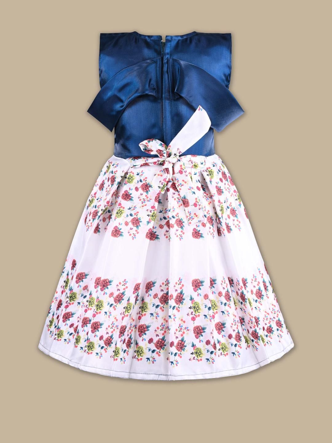 Peacock Blue Flroal Print Fit and Flare Dress. Round Neck with No sleeves. Knee length.and has a gathering on Waist. Satin fabric comes with Zipper closure and Tie-ups for better fitting.