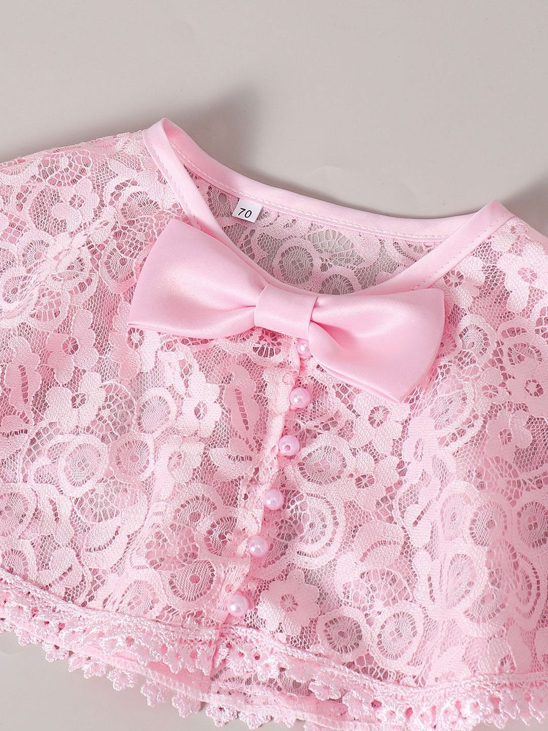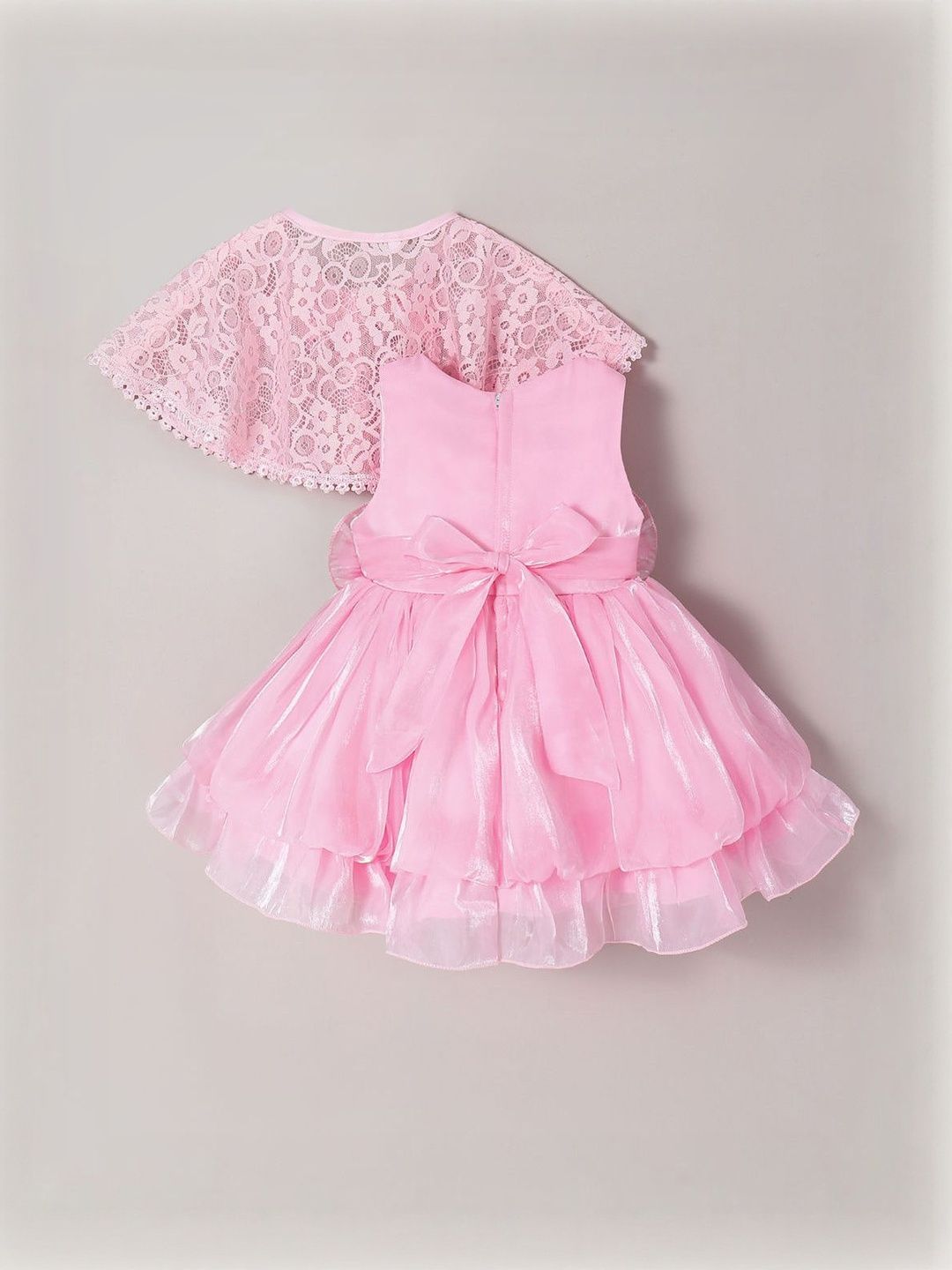 Delicate lace bolero with bow detail perfectly complements the rosette-adorned tulle dress for ultimate princess party perfection.